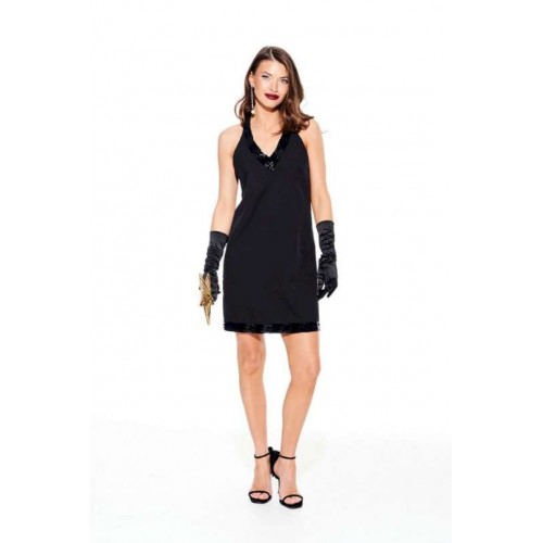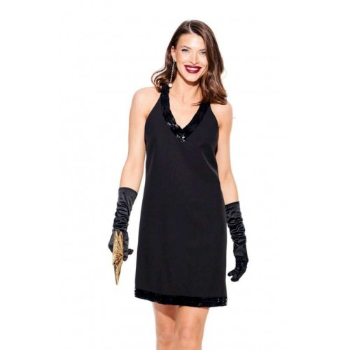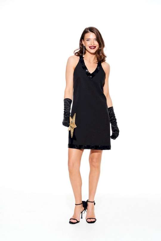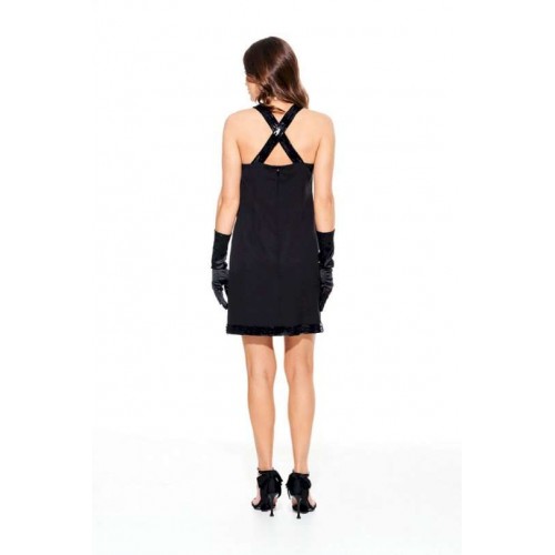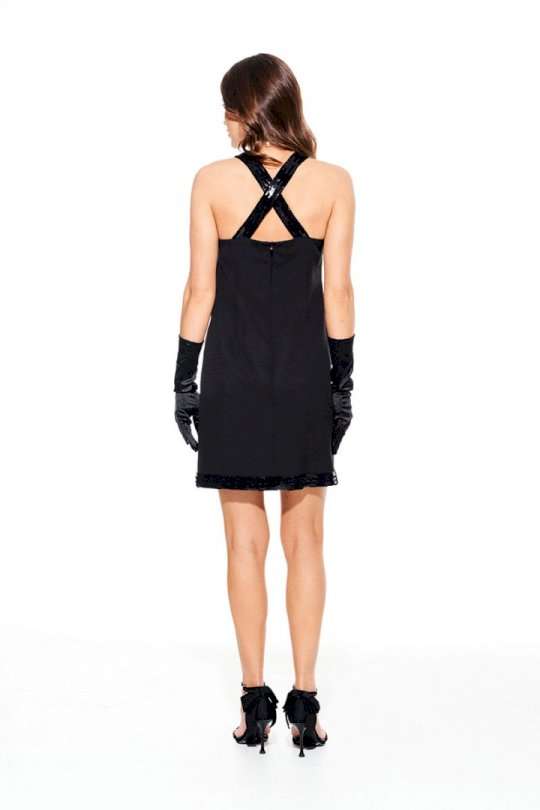 Платье из костюмно-плательной ткани, полуприлегающего силуэта, с застежкой на потайную молнию в среднем шве спинки. Вырез горловины V-образной формы, переходящий в цельнокроеную бретель, которая переходит на спинку. Перед с нагрудными вытачками. Спинка с талиевыми вытачками и средним швом. Бретели, вырез горловины, нижний срез платья обработаны декоративной вставкой из пайеток.