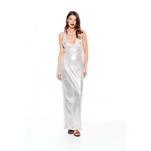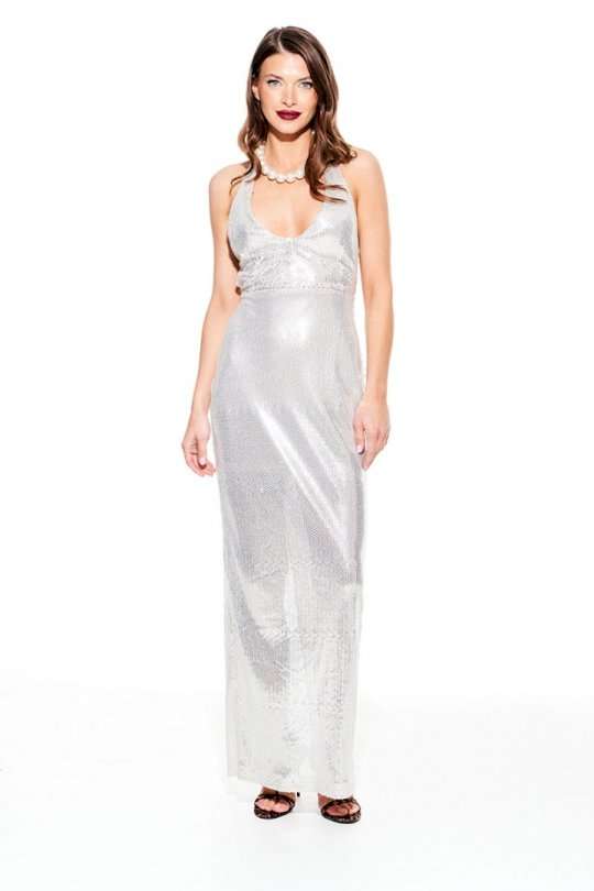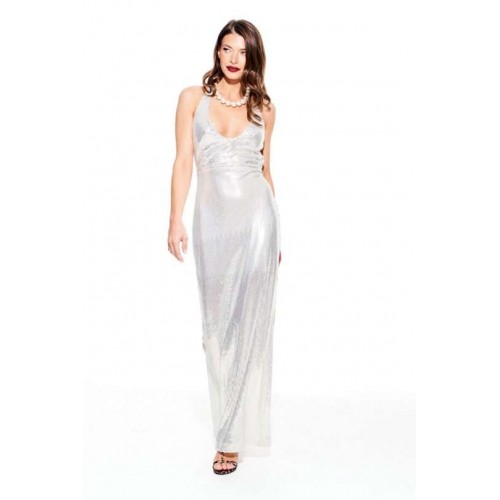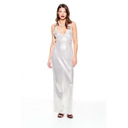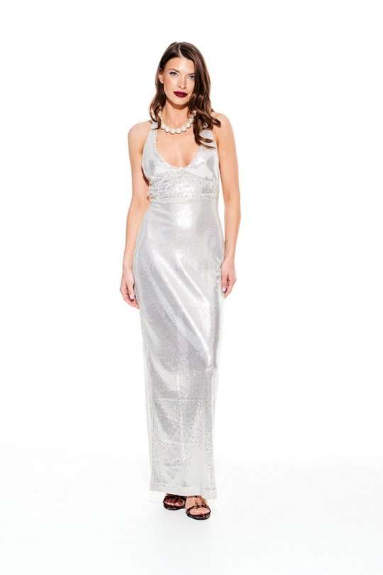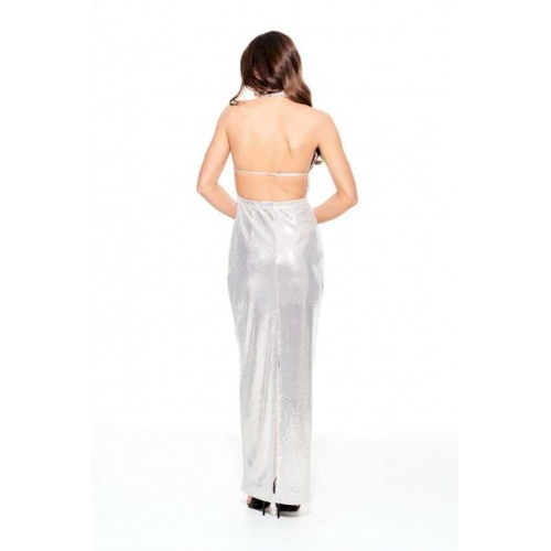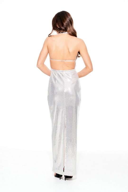 Платье приталенного силуэта, отрезное на уровне линии талии, на подкладке. Вырез горловины V-образной формы, переходящий в бретель через шею, с застежкой на петли и пуговицы. Лиф переда со средним швом и нагрудными вытачками. Спинка открытая до уровня линии талии, с регулируемой бретелей, которая фиксирует детали лифа, с талиевыми вытачками, со средним швом и разрезом. Верхний срез спинки на резинке. Длина платья до щиколотки.