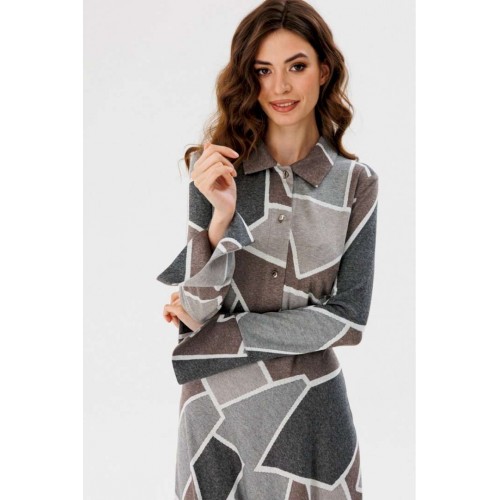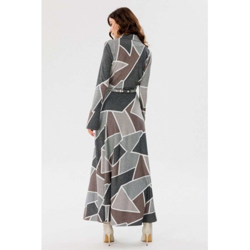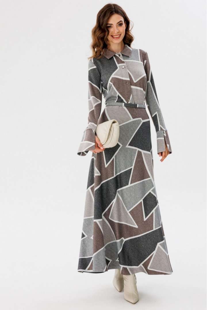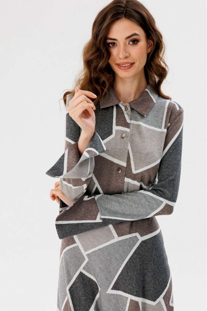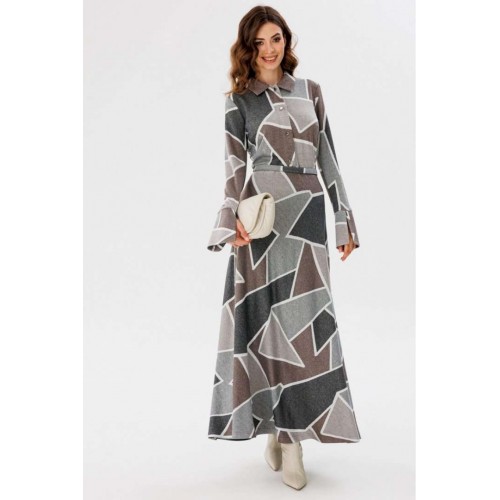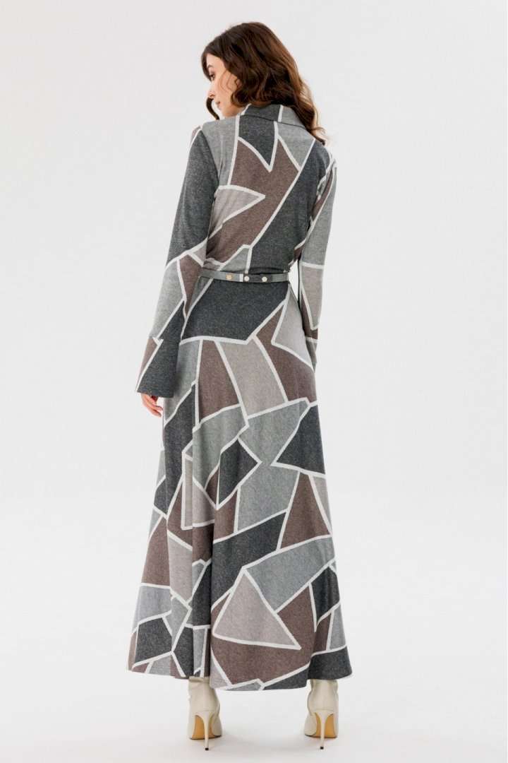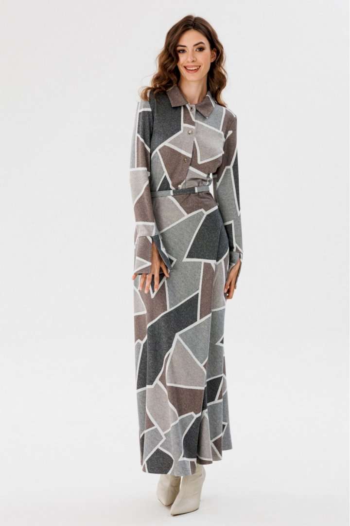 Платье выполнено из трикотажного полотна с геометрическим принтом. Платье Х-образного силуэта, отрезное по линии талии, длиной миди. Застежка спереди на пуговицы на планке. Воротник стояче-отложной. Рукав втачной, одношовный. Низ рукава на широкой притачной манжете с разрезом. Юбка расширена к низу. В боковом шве застежка на потайную молнию. В комплект входит обтяжной ремень. Длина платья: р. 44-48 - 135 см, р. 50-54 - 136 см. Длина рукава: р. 44-48 - 65 см, р. 50-54 - 66 см. Гарантийный срок не установлен ГОСТ 31409- 2009