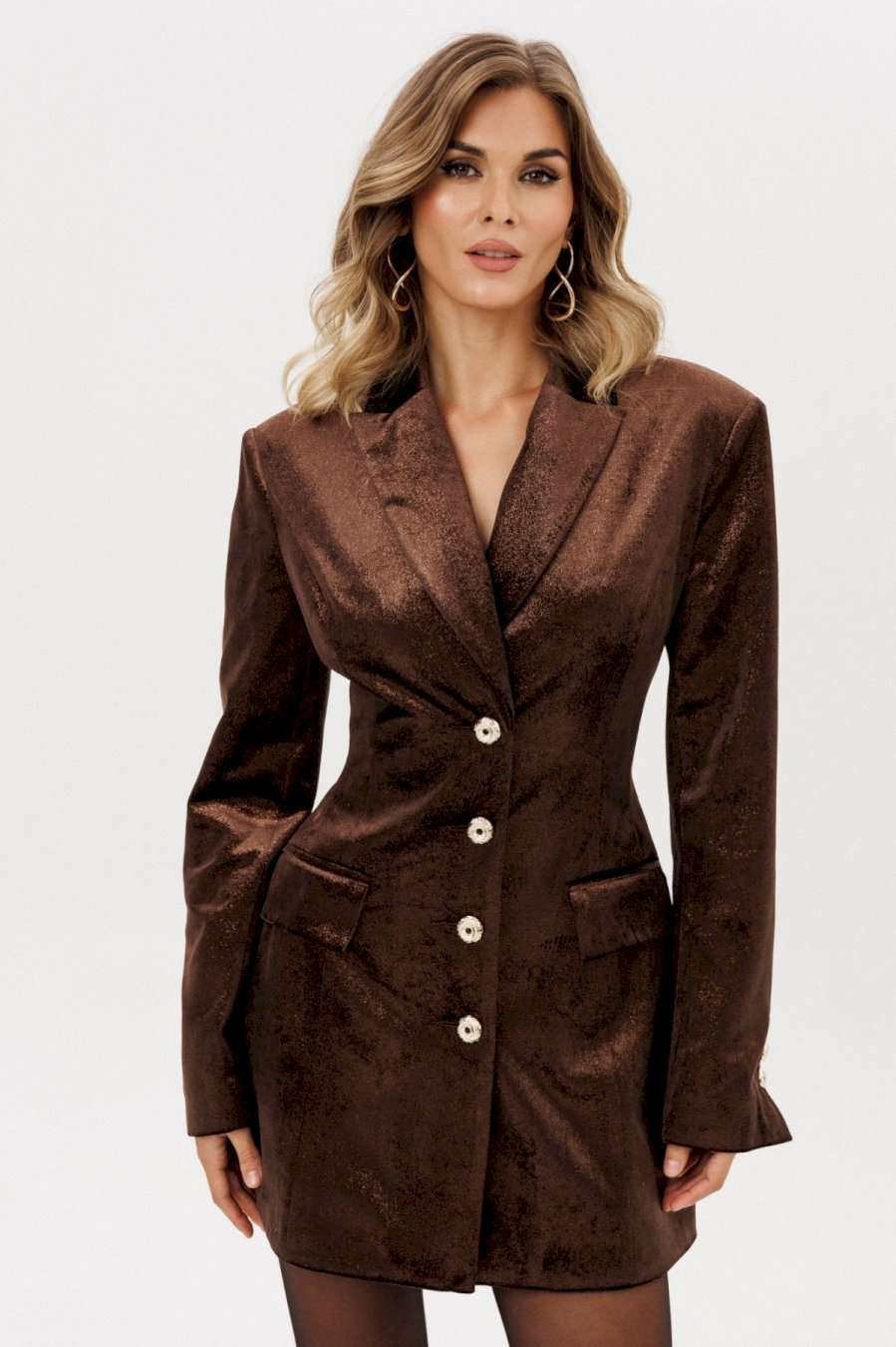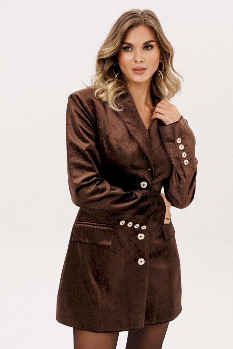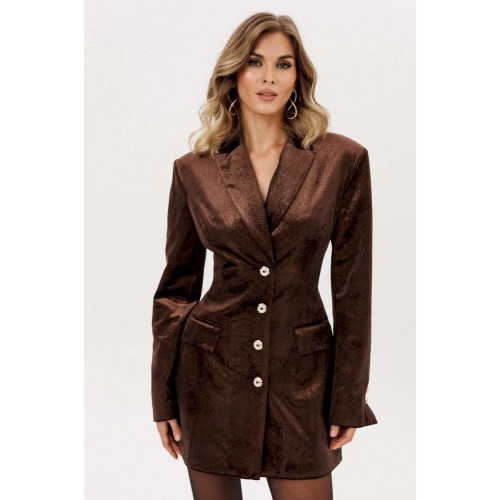 Платье-жакет выполнено из бархата. Платье полуприлегающего силуэта длиной выше линии колена. Спереди прорезные карманы с клапанами и лацканы. Застежка центральная бортовая на пуговицы. Спинка со средним швом. Воротник пиджачного типа. Рукав втачного покроя, двухшовный. По низу рукава шлица, застегивающаяся на четыре пуговицы. Платье на притачной по низу подкладке. Длина платья: 81 см.