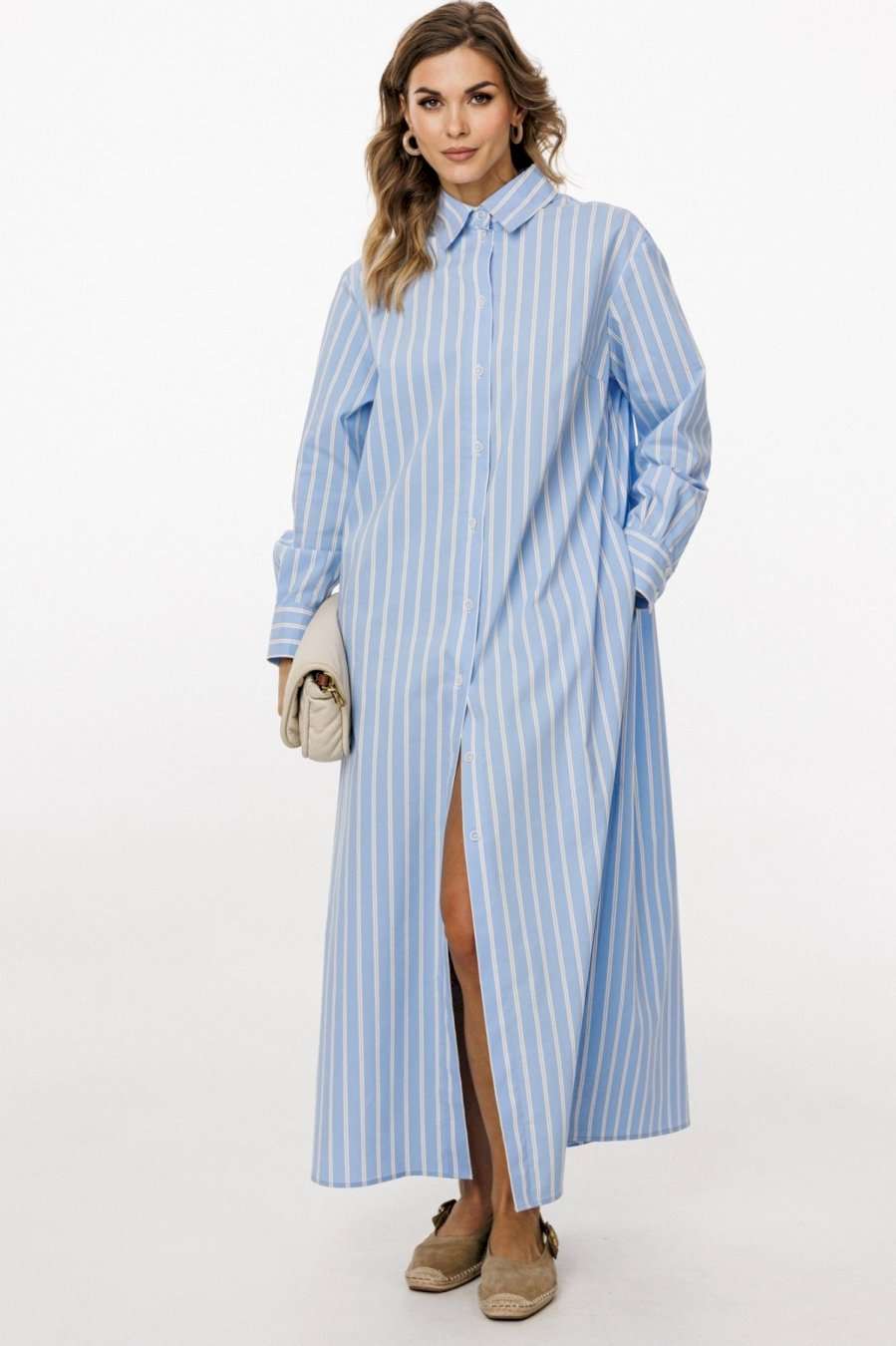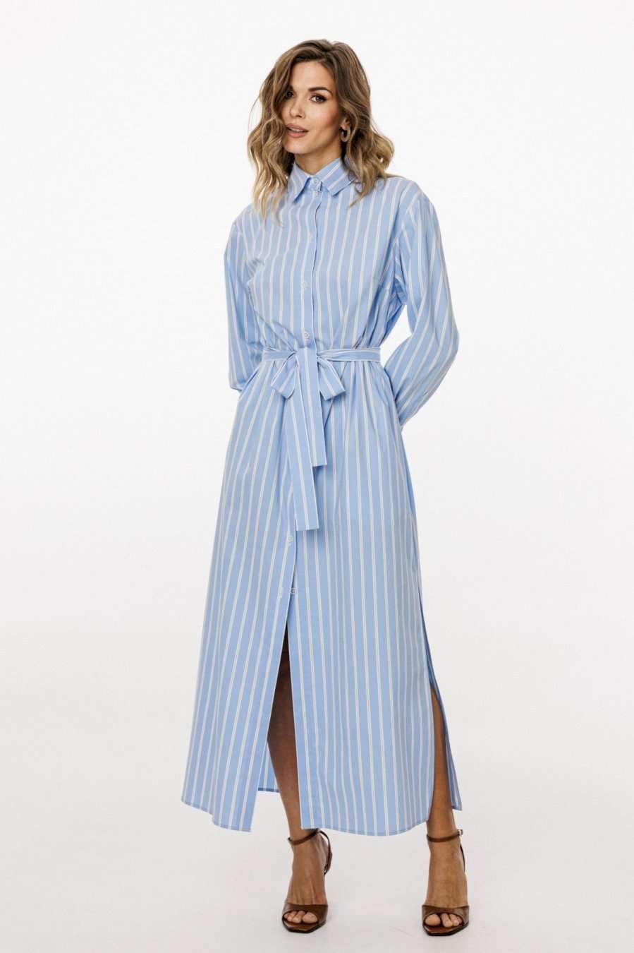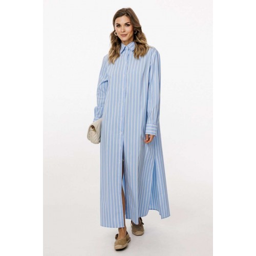 Платье выполнено из плательно-блузочной ткани в полоску. Платье прямого силуэта, длиной до линии щиколотки. По переду центральная застежка до верха с цельнокроеной планкой. На спинке обработаны кокетка и две складки от неё. Горловина округлой формы, обработана стояче-отложным воротником с отрезной стойкой. Плечевой шов удлинен. Рукав рубашечного покроя, одношовный, с двумя складками и обтачкой прорези по низу. Низ рукава обработан притачной манжетой, застегивающейся на две петли и пуговицы. В боковых швах обработаны карманы и разрезы. В комплект входит пояс из основной ткани с обтяжной пряжкой. Длина платья: р. 44-48 - 134 см, р. 50-54 - 135 см. Длина рукава: р. 44-48 - 76 см, р. 50-54 - 77,5 см. ПЛАТЬЕ м. 3026 44 46 48 50 52 54 Длина по центру спинки 134 134 13 135 135 135 Длина рукава 76 76 76 77,5 77,5 77,5 Объем по груди 118 122 126 130 134 138 Объем по талии 122 126 130 134 138 142 Объем по бедрам 132 136 140 144 148 152 Объем по низу 144 148 152 156 160 164 Объем рукава вверху 39 41 43 43 45 47 Объем рукава внизу 24 24 24 26 26 26