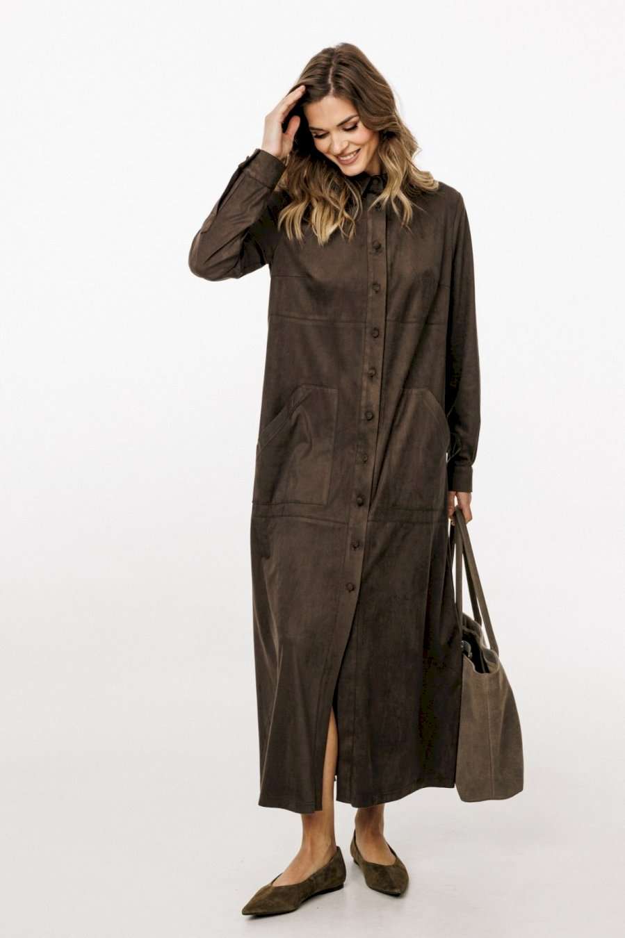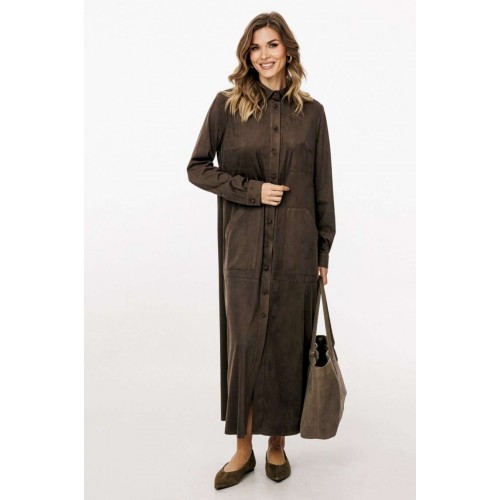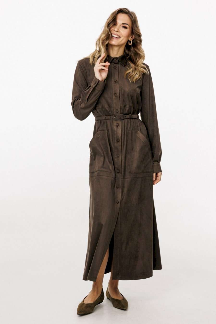 Платье выполнено из тонкой искусственной замши. Платье прямого силуэта, длиной миди. Спереди горизонтальные подрезы, накладные карманы и центральная застежка до верха с планкой на пуговицы. На спинке кокетка и встречная складка. Воротник стояче-отложной с отрезной стойкой и затежкой на пуговицу. Рукав втачной, одношовный. По низу рукава две складки и планка-обтачка. Низ рукава на притачной манжете с застежкой на пуговицу. В комплект входит ремень из основной ткани с обтяжной пряжкой. Длина платья: р. 42-46 - 133 см, р. 48-52 - 134.5 см. Длина рукава: р. 42-46 - 64 см, р. 48-52 - 65 см. ПЛАТЬЕ м. 3027 42 44 46 48 50 52 Длина по центру спинки 133 133 133 134,5 134,5 134,5 Длина рукава 64 64 64 65 65 65 Объем по груди 51 53 55 57 59 61 Объем по талии 49 51 53 55 57 59 Объем по бедрам 54 56 58 60 62 64 Объем по низу 74 76 78 80 82 84 Объем рукава вверху 32 34 36 38 40 42 Объем рукава внизу 22 22 22 24 24 24