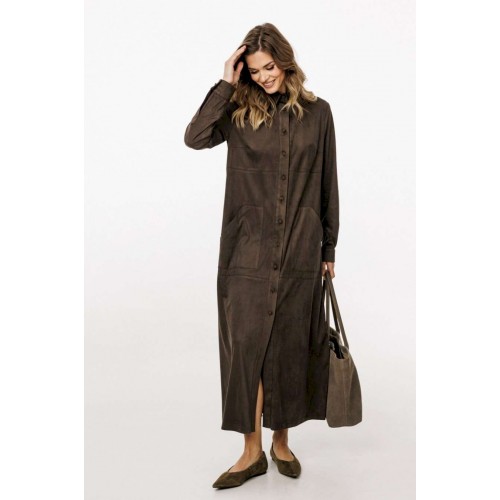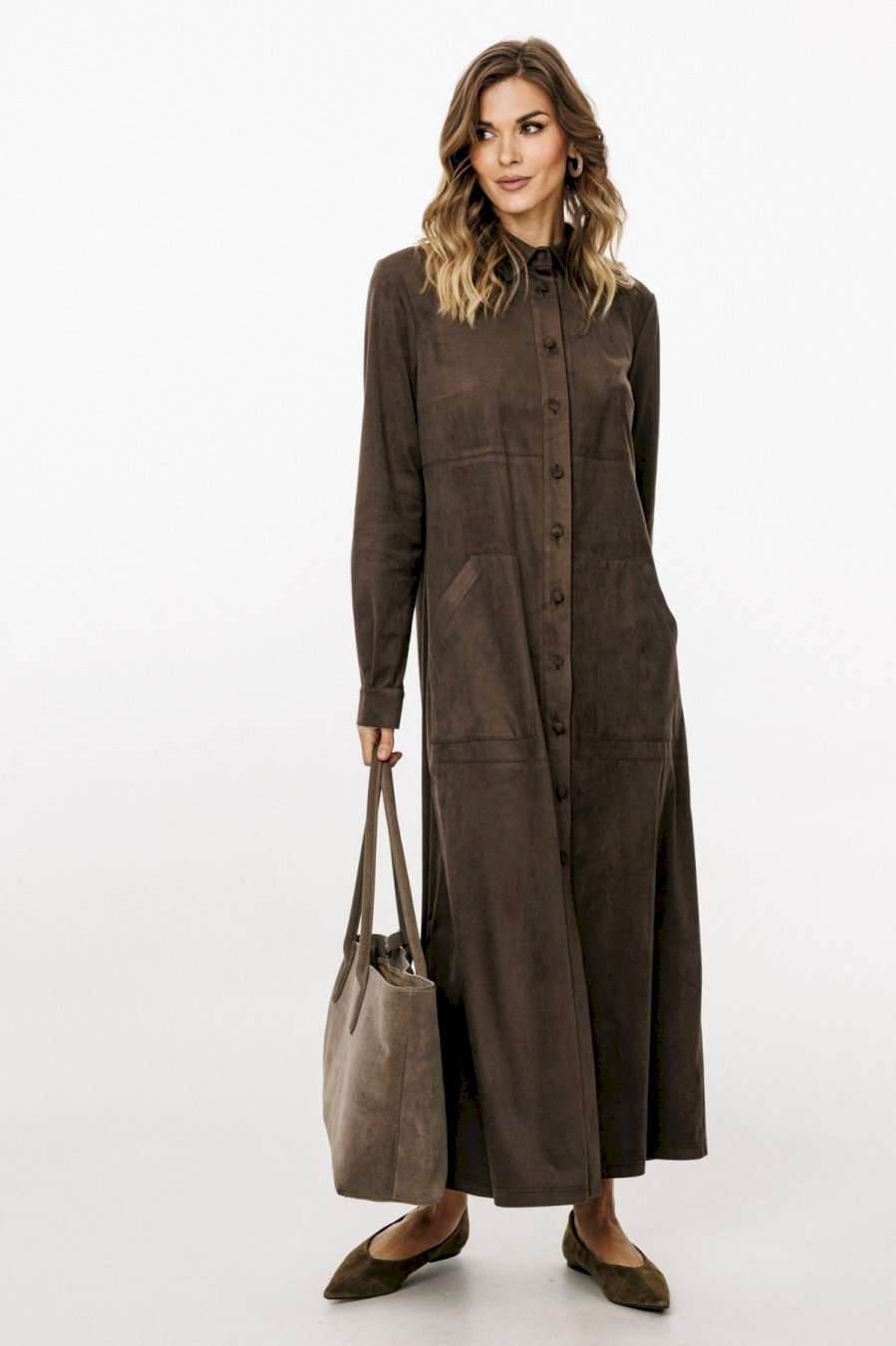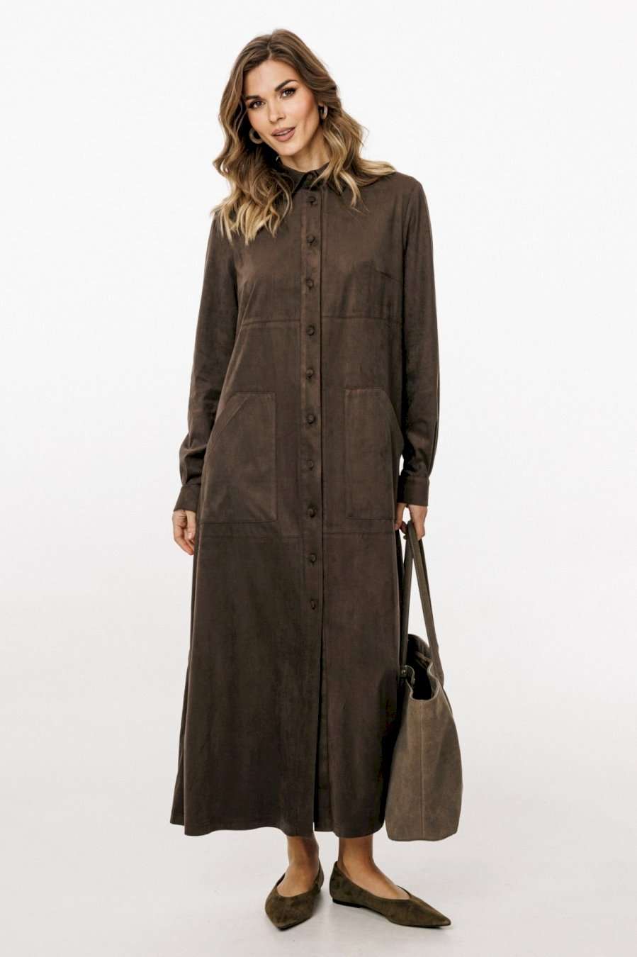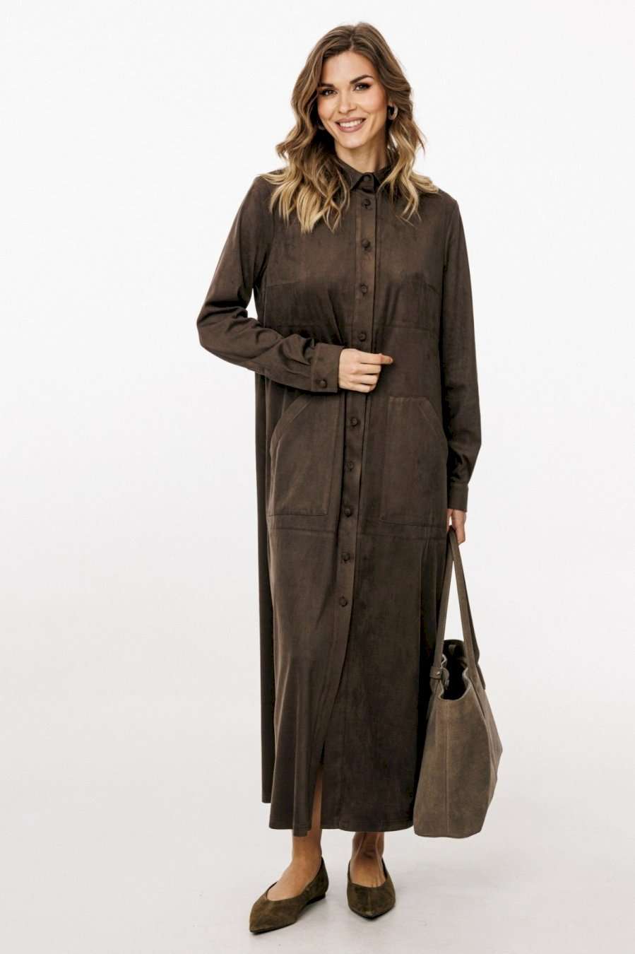 Платье выполнено из тонкой искусственной замши. Платье прямого силуэта, длиной миди. Спереди горизонтальные подрезы, накладные карманы и центральная застежка до верха с планкой на пуговицы. На спинке кокетка и встречная складка. Воротник стояче-отложной с отрезной стойкой и затежкой на пуговицу. Рукав втачной, одношовный. По низу рукава две складки и планка-обтачка. Низ рукава на притачной манжете с застежкой на пуговицу. В комплект входит ремень из основной ткани с обтяжной пряжкой. Длина платья: р. 42-46 - 133 см, р. 48-52 - 134.5 см. Длина рукава: р. 42-46 - 64 см, р. 48-52 - 65 см. ПЛАТЬЕ м. 3027 42 44 46 48 50 52 Длина по центру спинки 133 133 133 134,5 134,5 134,5 Длина рукава 64 64 64 65 65 65 Объем по груди 51 53 55 57 59 61 Объем по талии 49 51 53 55 57 59 Объем по бедрам 54 56 58 60 62 64 Объем по низу 74 76 78 80 82 84 Объем рукава вверху 32 34 36 38 40 42 Объем рукава внизу 22 22 22 24 24 24