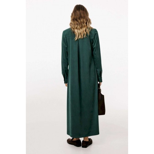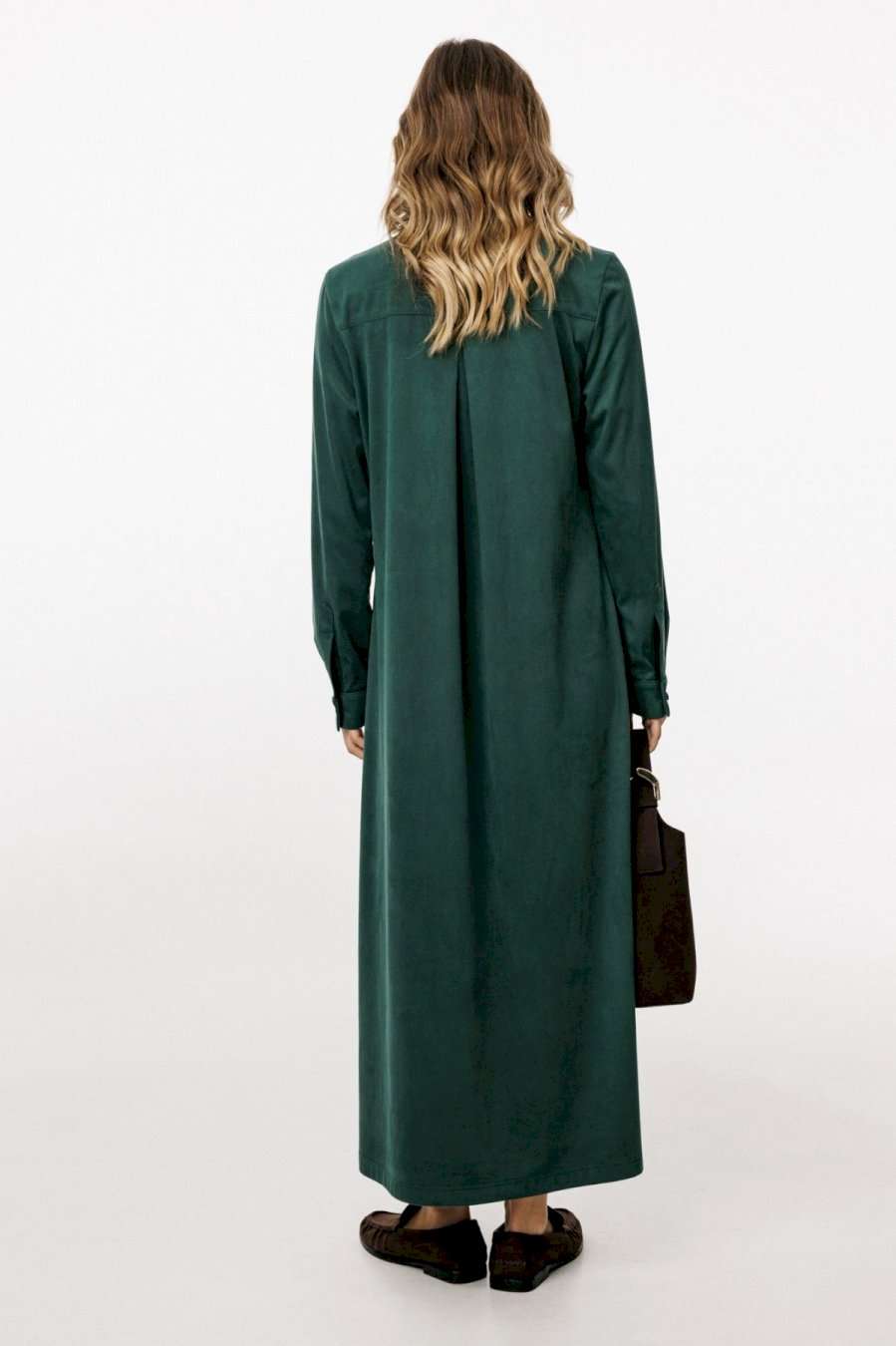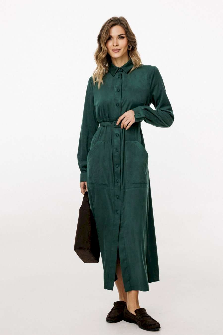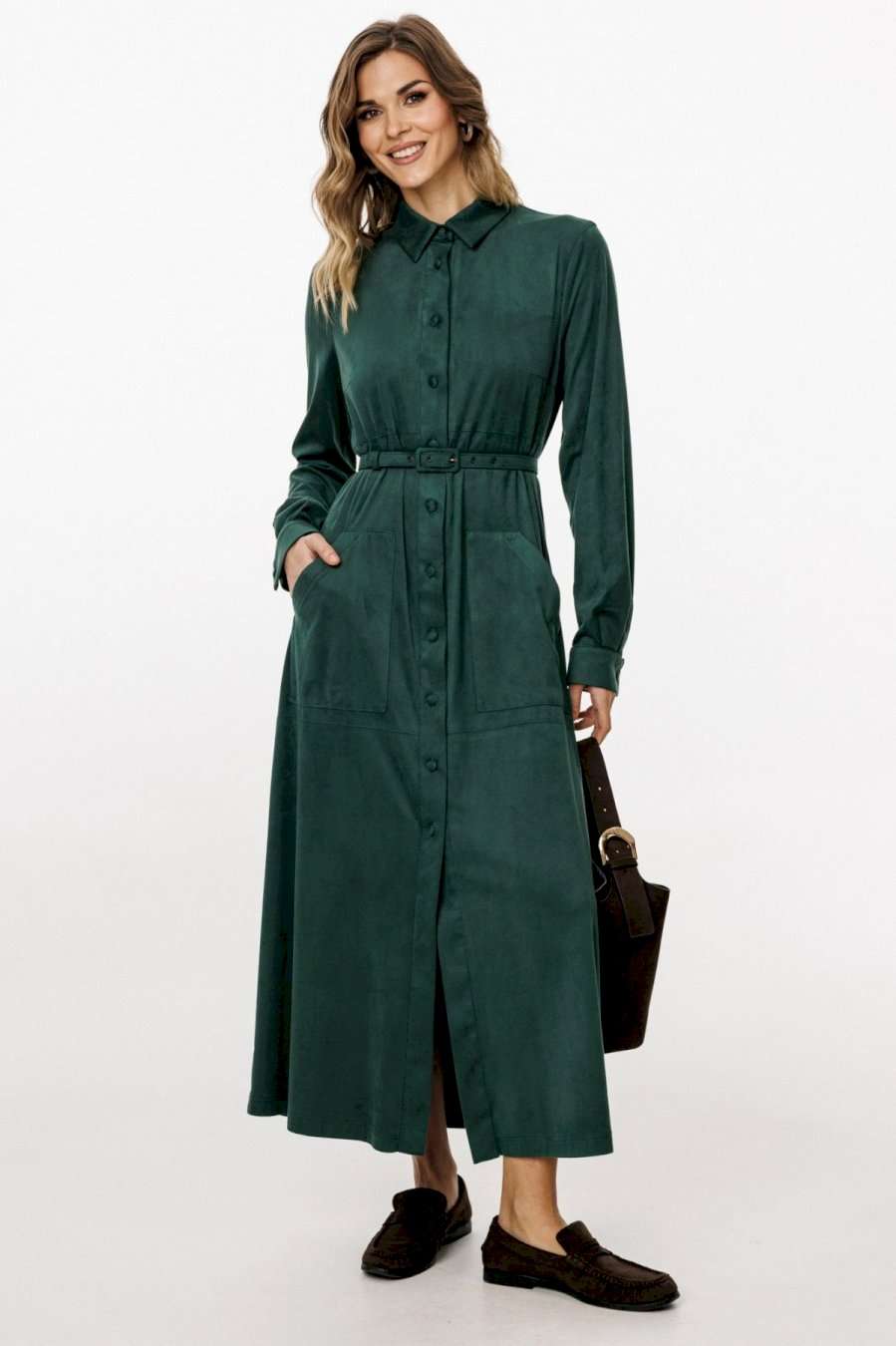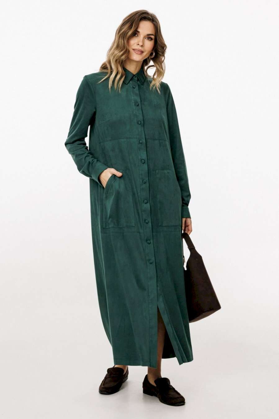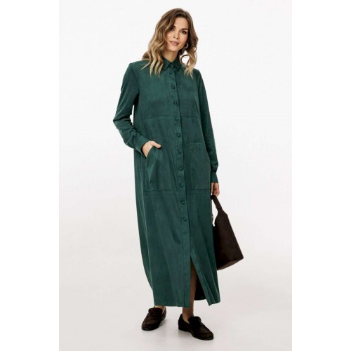 Платье выполнено из тонкой искусственной замши. Платье прямого силуэта, длиной миди. Спереди горизонтальные подрезы, накладные карманы и центральная застежка до верха с планкой на пуговицы. На спинке кокетка и встречная складка. Воротник стояче-отложной с отрезной стойкой и затежкой на пуговицу. Рукав втачной, одношовный. По низу рукава две складки и планка-обтачка. Низ рукава на притачной манжете с застежкой на пуговицу. В комплект входит ремень из основной ткани с обтяжной пряжкой. Длина платья: р. 42-46 - 133 см, р. 48-52 - 134.5 см. Длина рукава: р. 42-46 - 64 см, р. 48-52 - 65 см. ПЛАТЬЕ м. 3027 42 44 46 48 50 52 Длина по центру спинки 133 133 133 134,5 134,5 134,5 Длина рукава 64 64 64 65 65 65 Объем по груди 51 53 55 57 59 61 Объем по талии 49 51 53 55 57 59 Объем по бедрам 54 56 58 60 62 64 Объем по низу 74 76 78 80 82 84 Объем рукава вверху 32 34 36 38 40 42 Объем рукава внизу 22 22 22 24 24 24