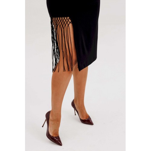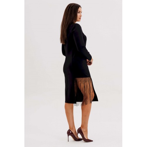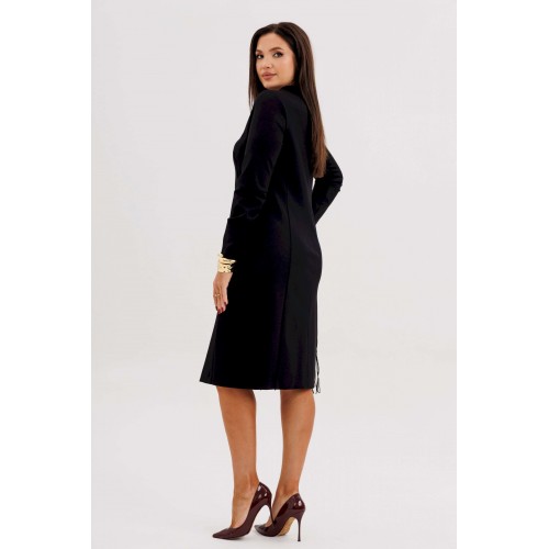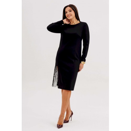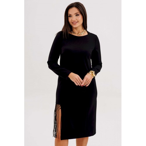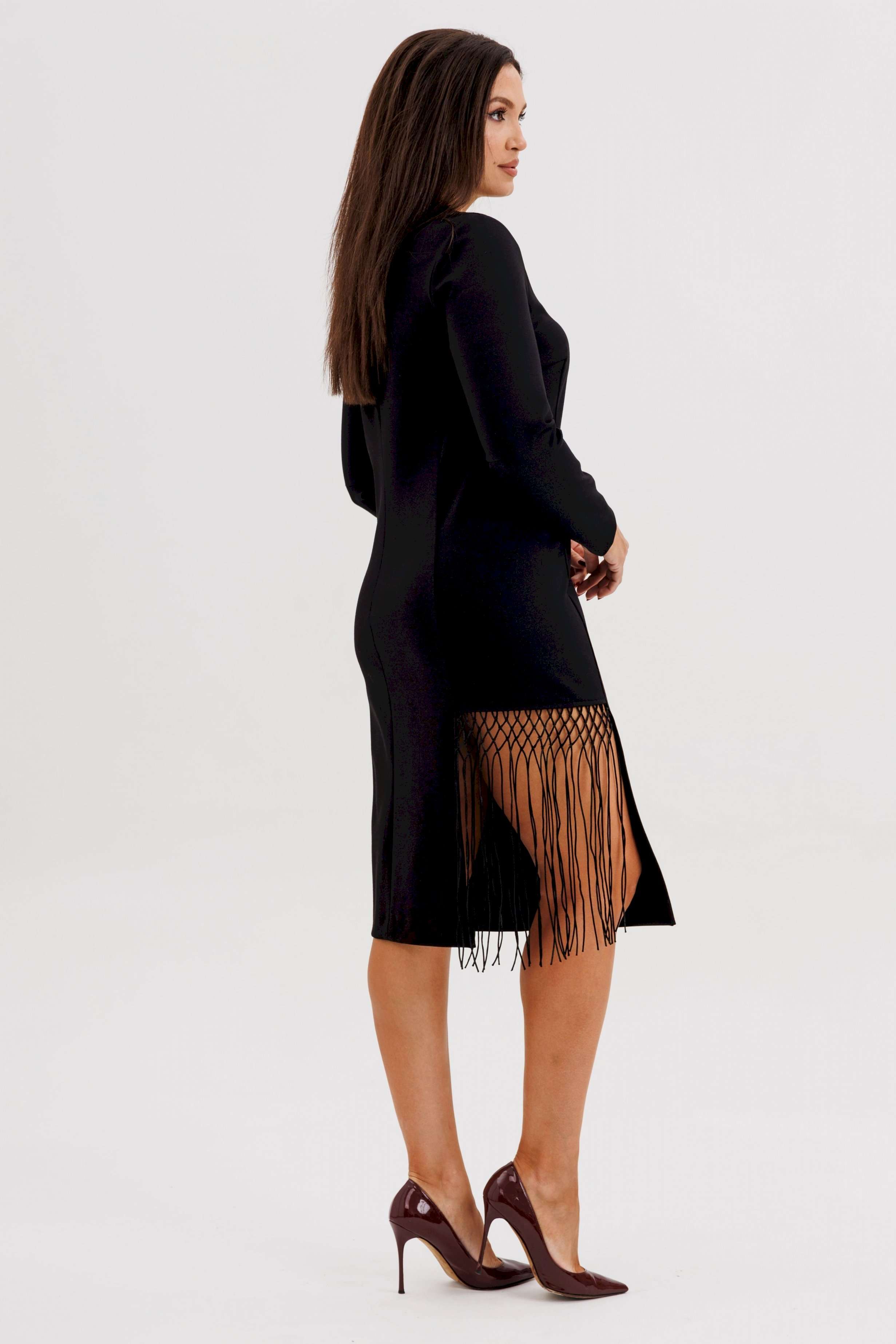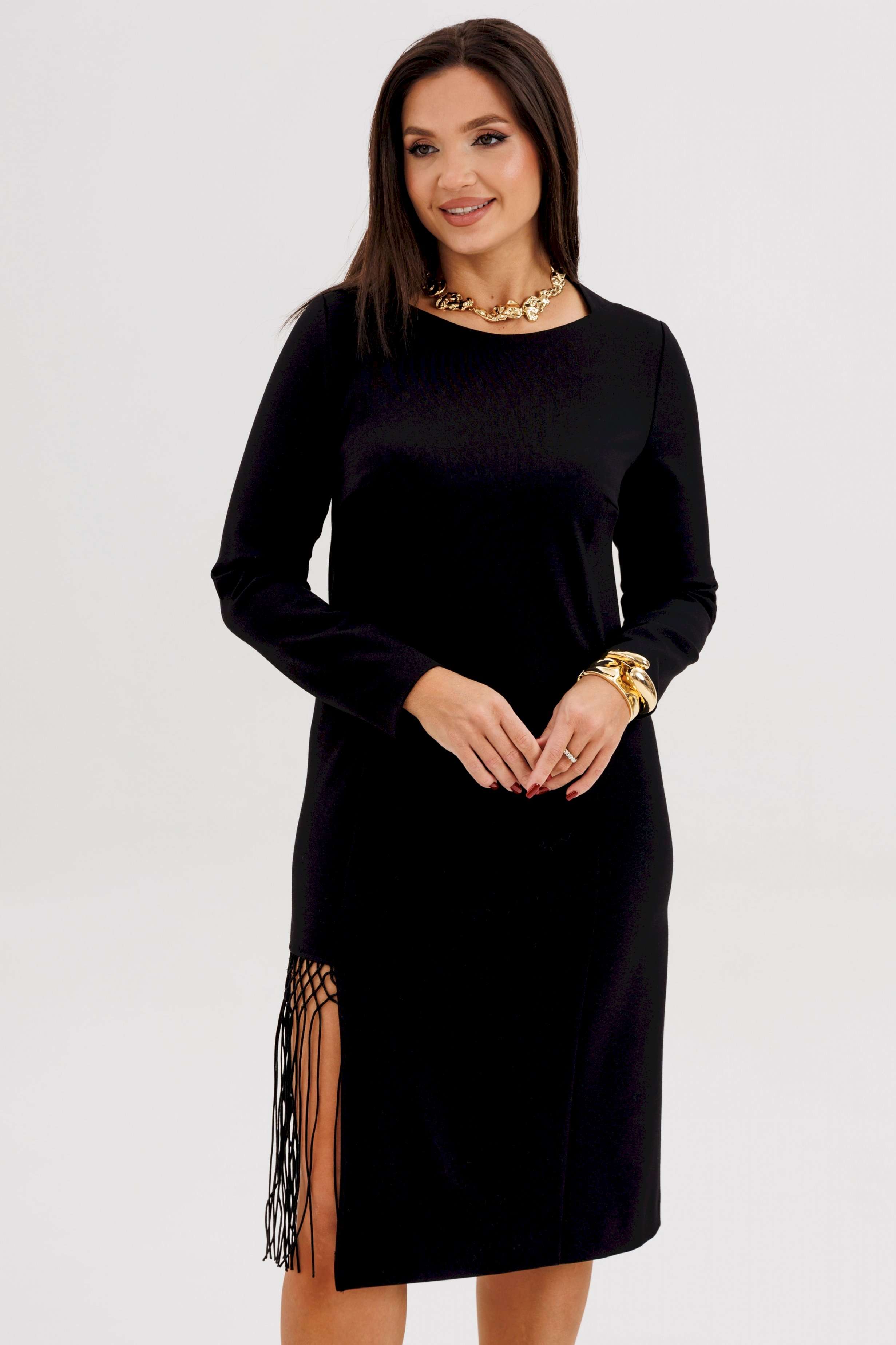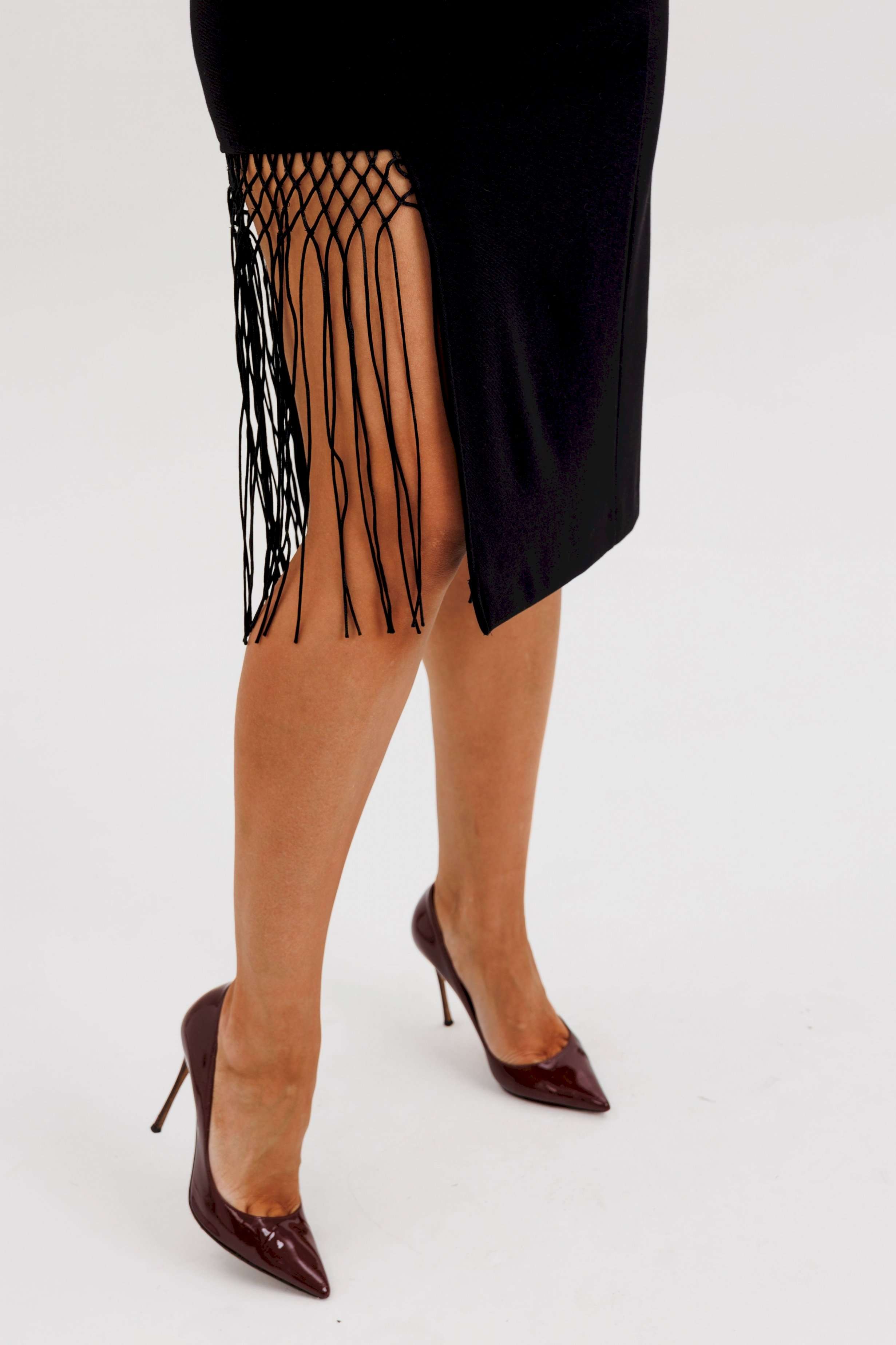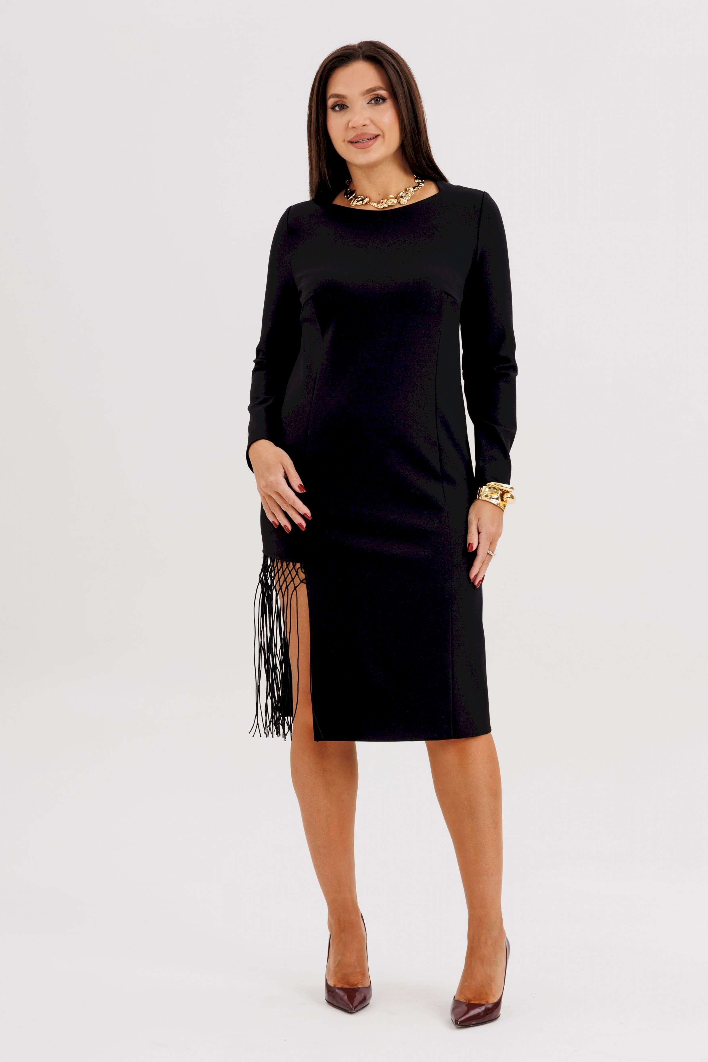 Элегантное платье из высококачественного вискозного трикотажа с добавлением нейлона — воплощение утончённого стиля и современного комфорта. Втачной крой мягко подчёркивает фигуру, а лаконичный вырез «лодочка» добавляет образу изысканности. Главный акцент — асимметричный разрез, декорированный сеткой с бахромой ручной работы, придаёт модели индивидуальность и лёгкий артистичный характер. Идеальный выбор для вечернего выхода или особого случая, когда хочется выглядеть стильно, сохраняя комфорт и уверенность.