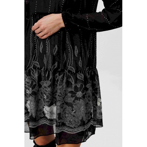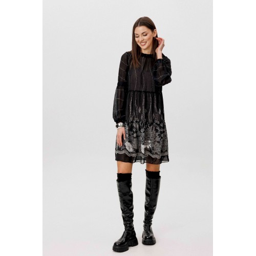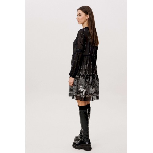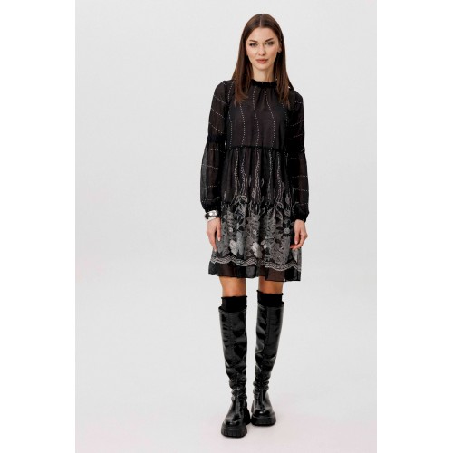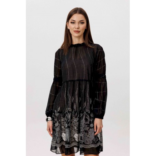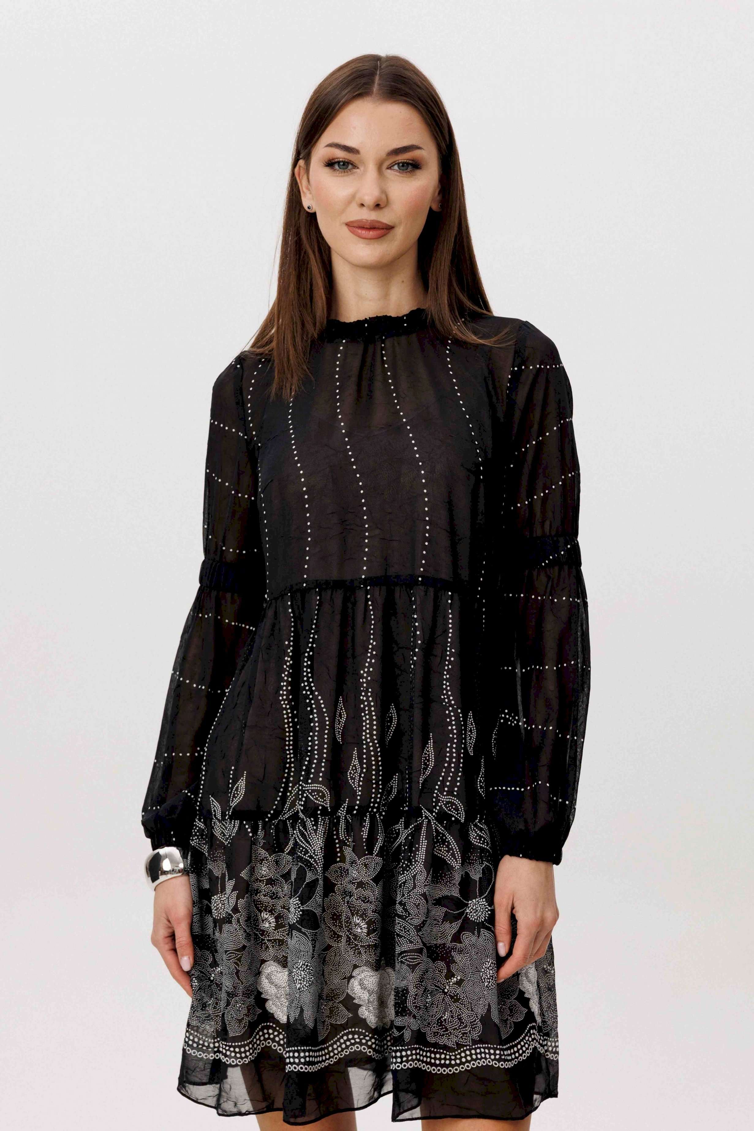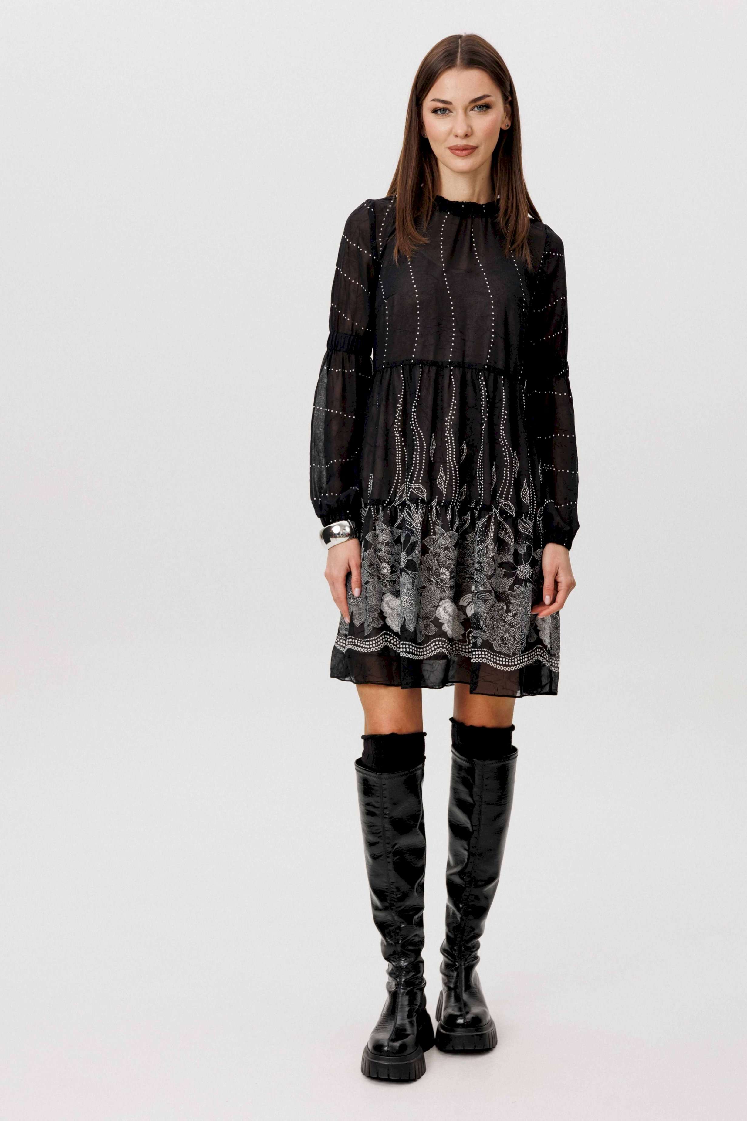 Шифон - это идеальная ткань для пошива весенних платьев. Платья, выполненные из этого материала, выглядят элегантно и игриво, особенно если это платье в романтическом стиле. Нежное и воздушное, с каскадом расширяющихся воланов с легкой сборкой, свободного силуэта. Рукав втачной из двух частей с эластичной тесьмой в верхней части и по низу. Горловина изделия с декоративной отделкой со сборкой. Длина изделия около 86 см. Длина рукава около 61 см.