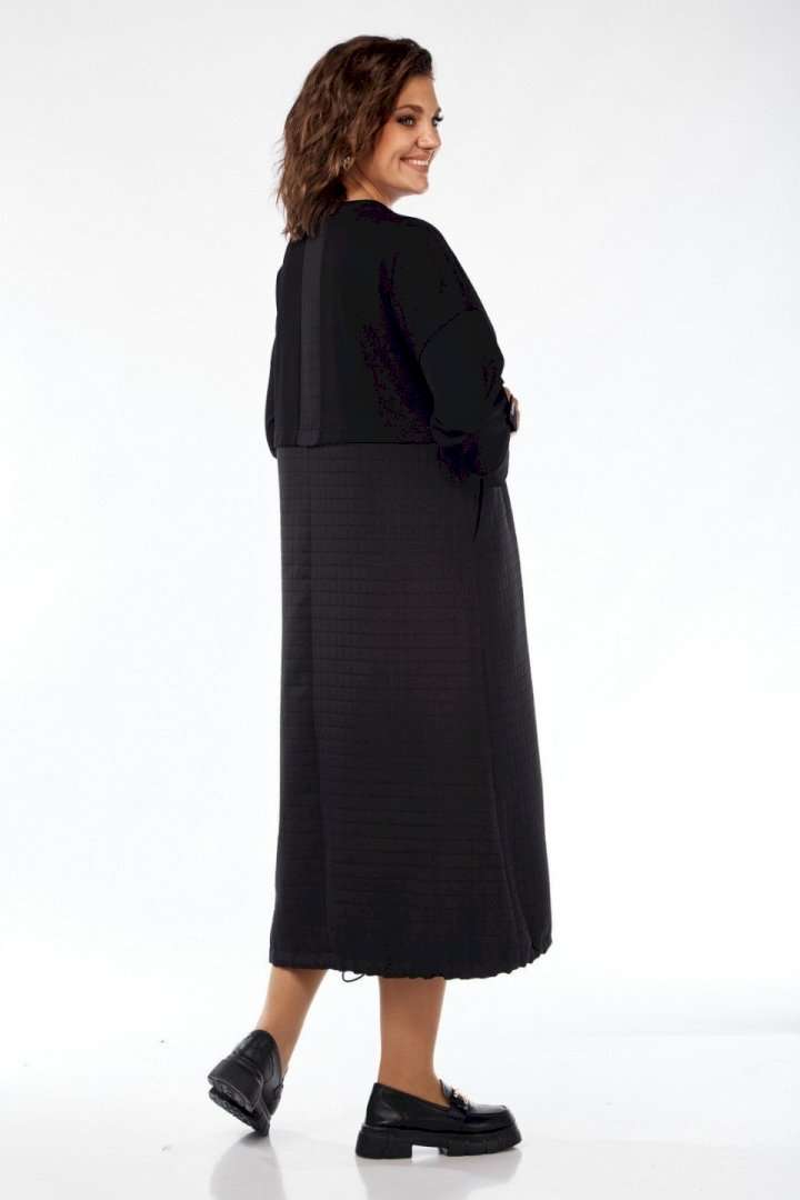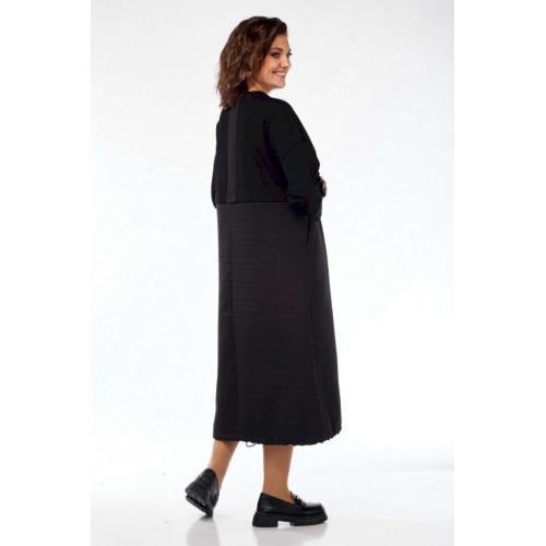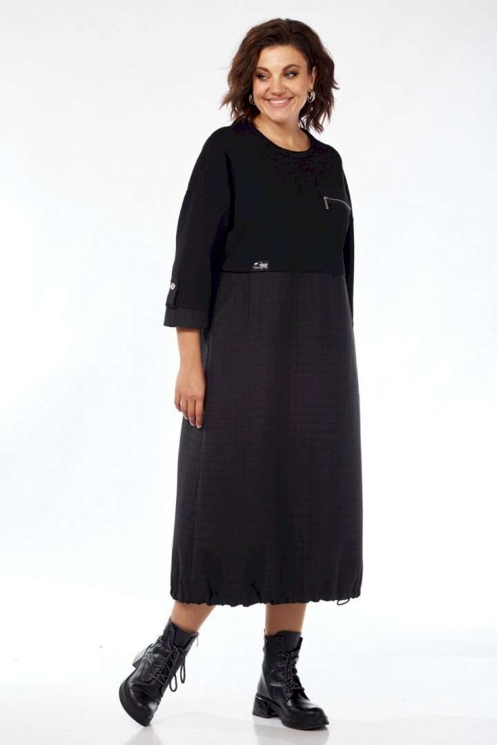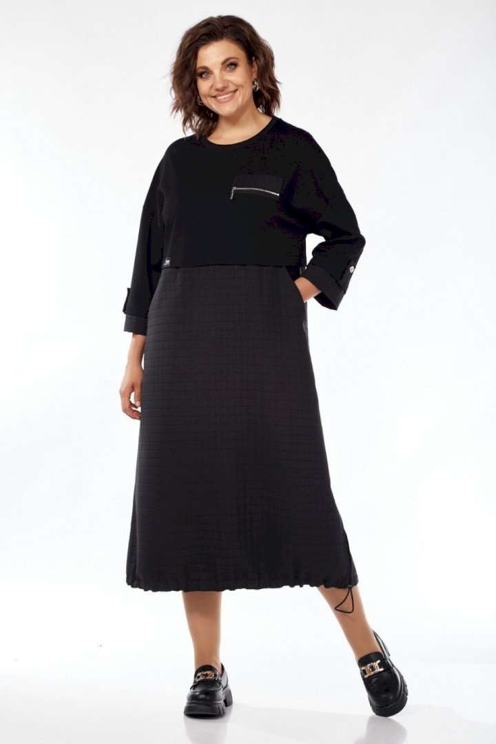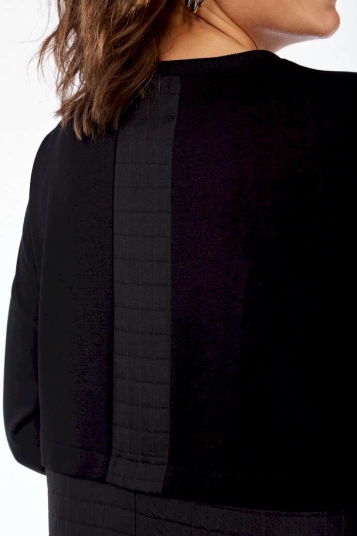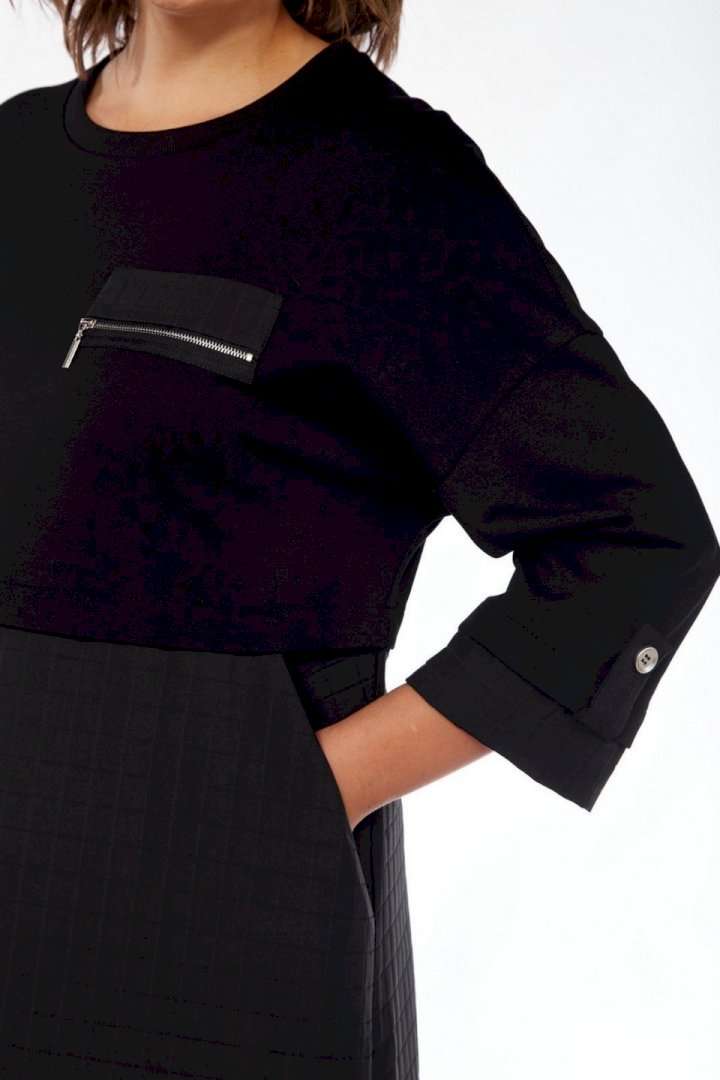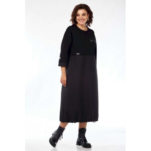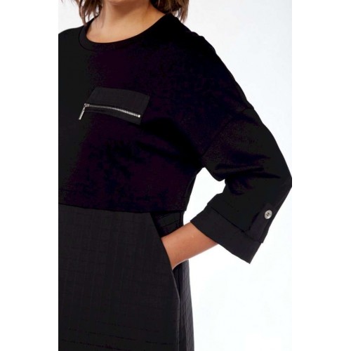 Платье женское повседневное, свободного силуэта, выполнено путем комбинирования тканей двух видов. Трикотажного полотна и фактурной ткани с имитацией стёжка. Платье отрезное по линии талии. Горловина круглой формы обработана бейкой из довяза. Лиф платья с ассиметричным декоративным элементом в виде кармана с молнией. В нижней части платья обработаны карманы с отрезным бочком. Верхняя часть спинки разрезная со вставкой из отделочной ткани. По низу платья кулиса со шнуром. Рукава спущенные с декоративной манжетой и патой. Обращаем Ваше внимание, что цвет на экране может отличаться от реального.