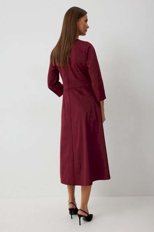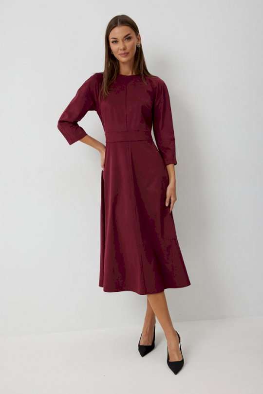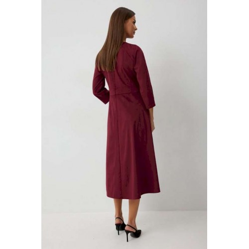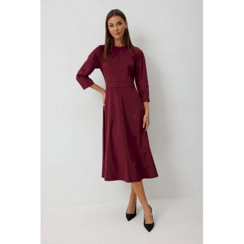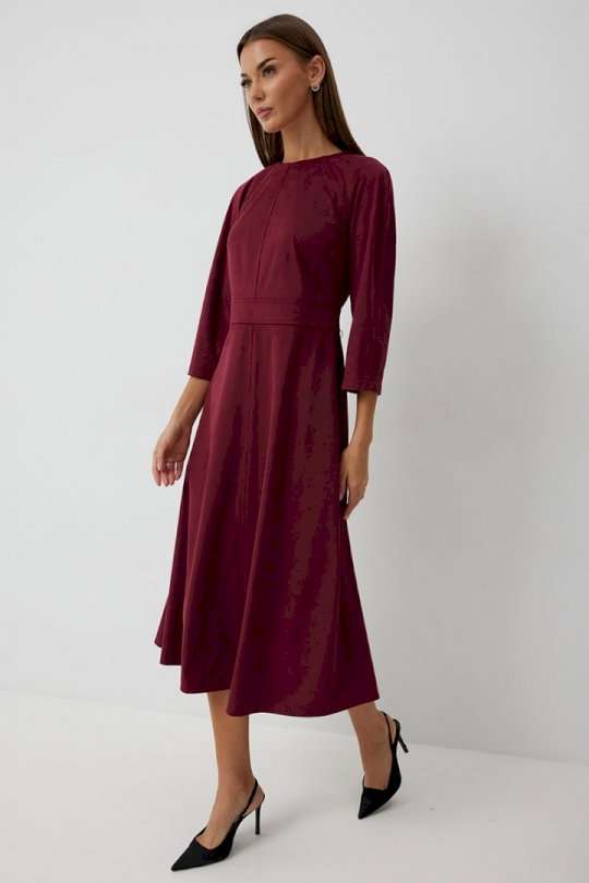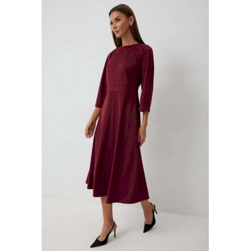 Платье женское полуприлегающего силуэта без подкладки, длиной до середины икры. Платье с отрезным лифом. По переду лиф с центральным швом, отрезными бочками и нагрудными вытачками. Спинка лифа с центральным швом и отрезными бочками. Отрезная юбка по переду и спинке со средним швом. Юбка соединяется с лифом отрезным поясом. Рукав-реглан полной длинны. Низ рукава и платья обработан швом «в подгибку». Горловина платья обработана обтачкой. По среднему шву спинки располагается застежка-молния. Длина изделия по спинке 118 см, 54 р. - 61 см, Длина рукава от горловины 58,5 см.