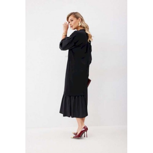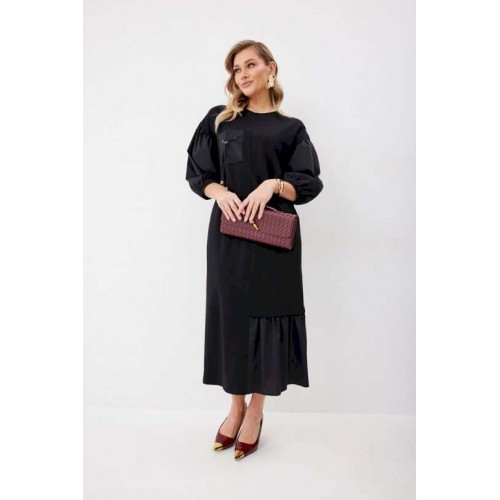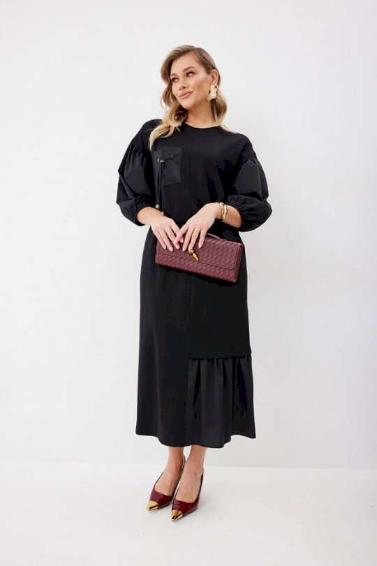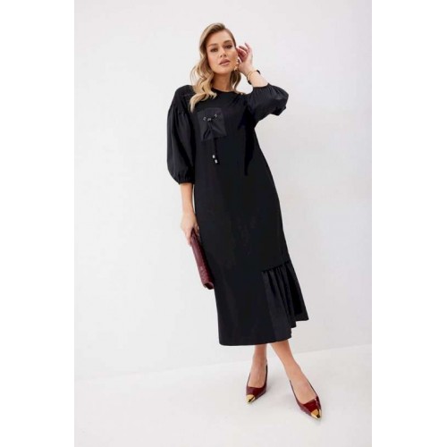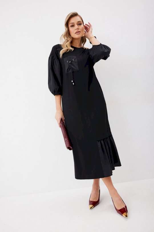 Платье женское прямого силуэта без подкладки из трикотажной ткани длиной до середины икры. Передняя часть платья со средним швом. По левой половинке переда внизу платья пришит волан из ткани – компаньона. По правой половинке переда настрочен нагрудный карман из ткани – компаньона с декоративными элементами. В боковых швах платья функциональные карманы. Спинка платья со средним швом, в котором расположена застежка – «молния». По низу левой половинки спинки пришит волан из ткани – компаньона. Горловина имеет округлую форму. Линия плеча спущена. Рукав выполнен из ткани – компаньона со сборкой вверху рукава и резинкой по низу рукава. Длина изделия по спинке 126 см, длина рукава от горловины 63 см.