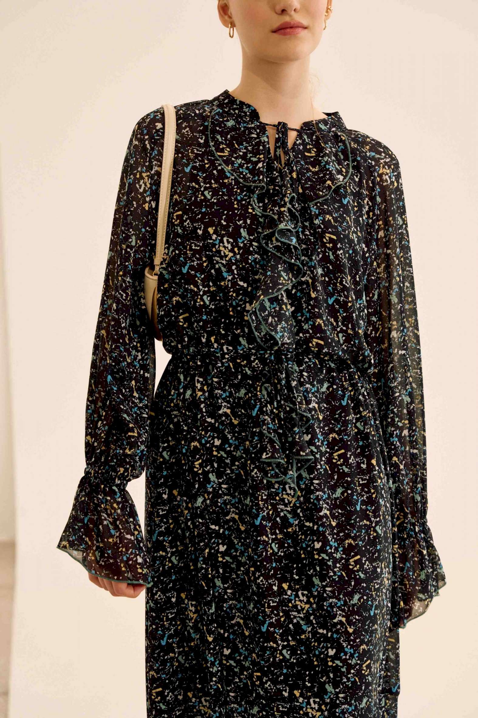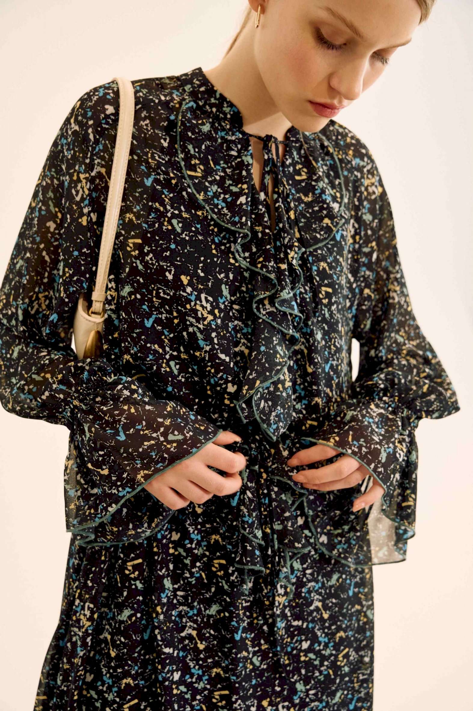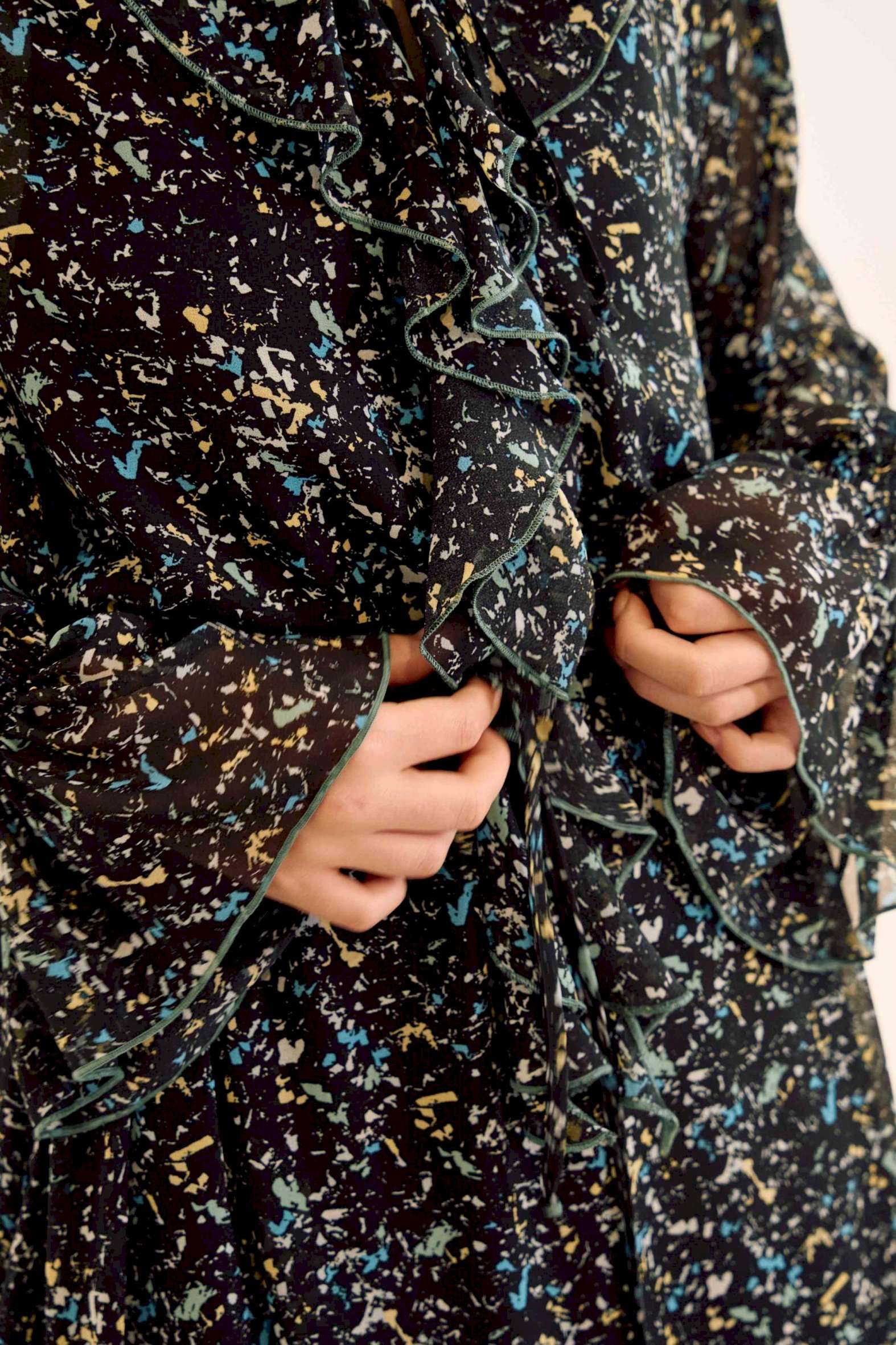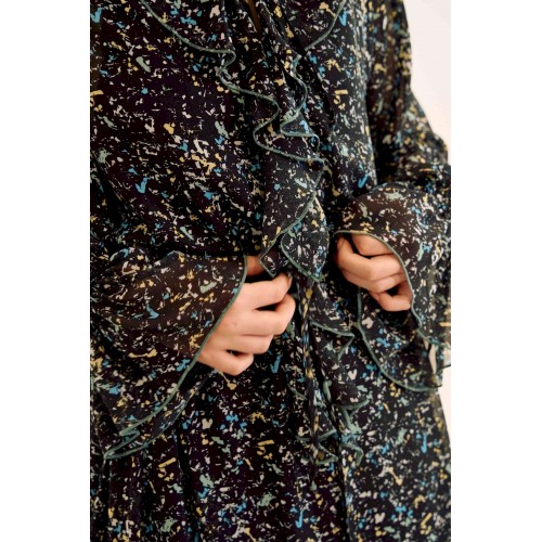 Платье свободного кроя, выполнено из шифона. Рукав длинный реглан, по низу рукава резинка. Глубокий V-образный вырез горловины, в который вставлена рюша, по горловине стойка на завязку, по середине выреза застежка на навесной потайной крючок. По линии талии по переду и спинке кулиса на завязку, по низу платья притачной волан. В комплект входит платье-комбинация из трикотажной подкладки на бретелях. Платье: Длина по спинке от высшей точки горловины: 138 см Длина рукава от горловины: 71 см ОГ: 118-122-126-130-134 см (размер 44-46-48-50-52) ОТ: 124-128-132-136-140 см (размер 44-46-48-50-52) Платье-комбинация: Длина изделия: 96 см ОГ: 94-98-102-106-110 см (размер 44-46-48-50-52) ОТ: 98-102-106-110-114 см (размер 44-46-48-50-52) ОБ: 108-112-116-120-124 см (размер 44-46-48-50-52)
