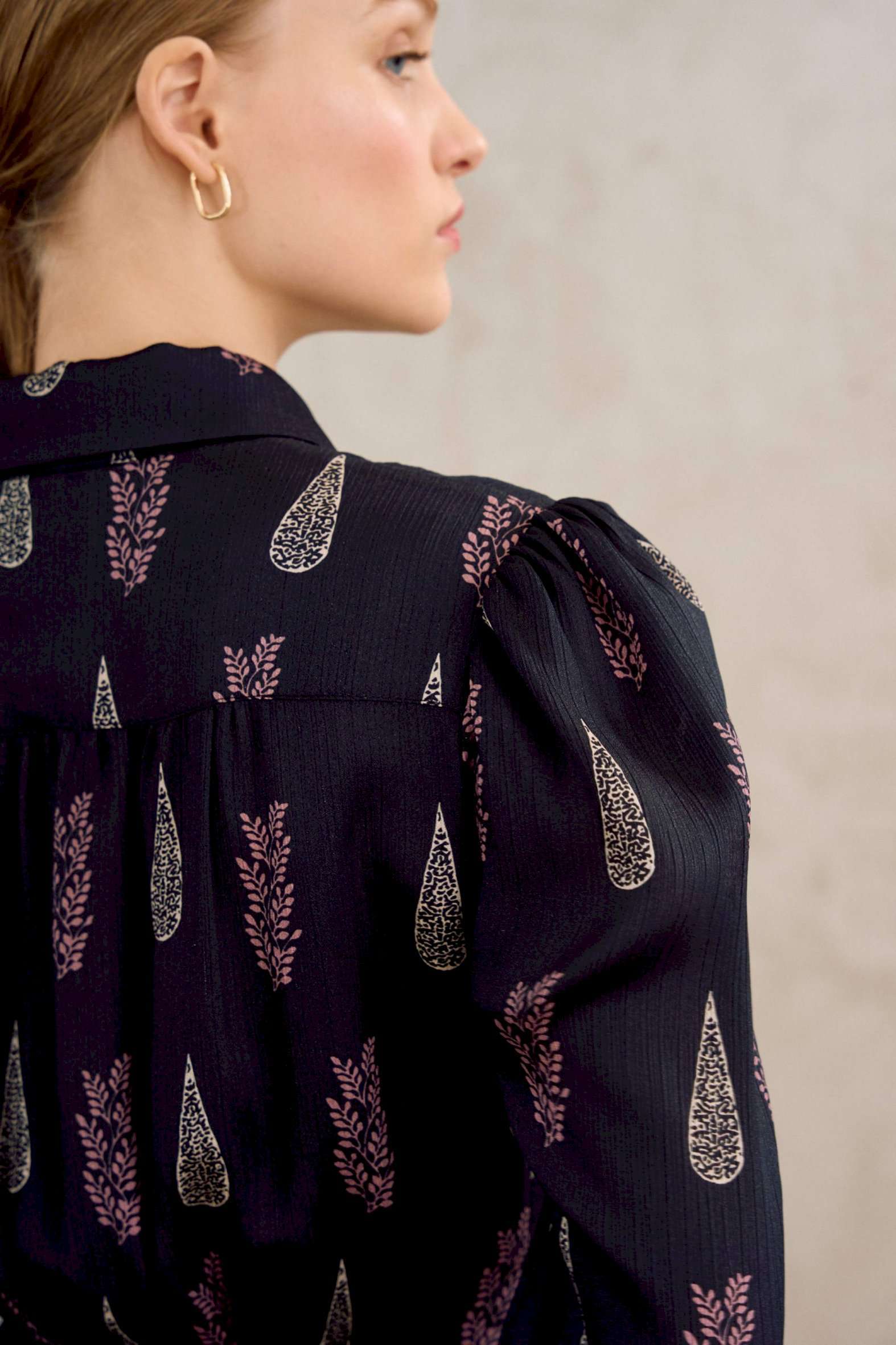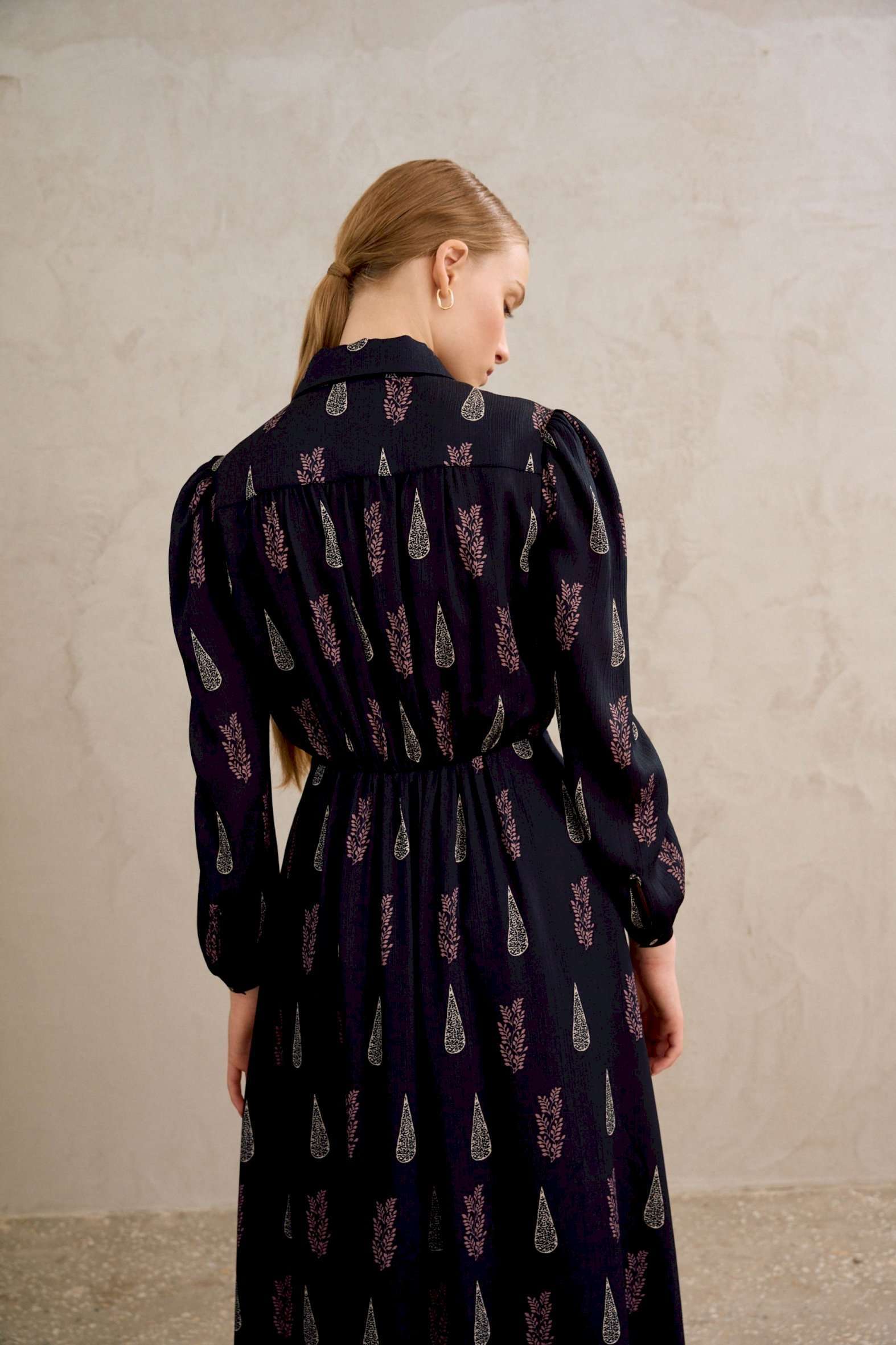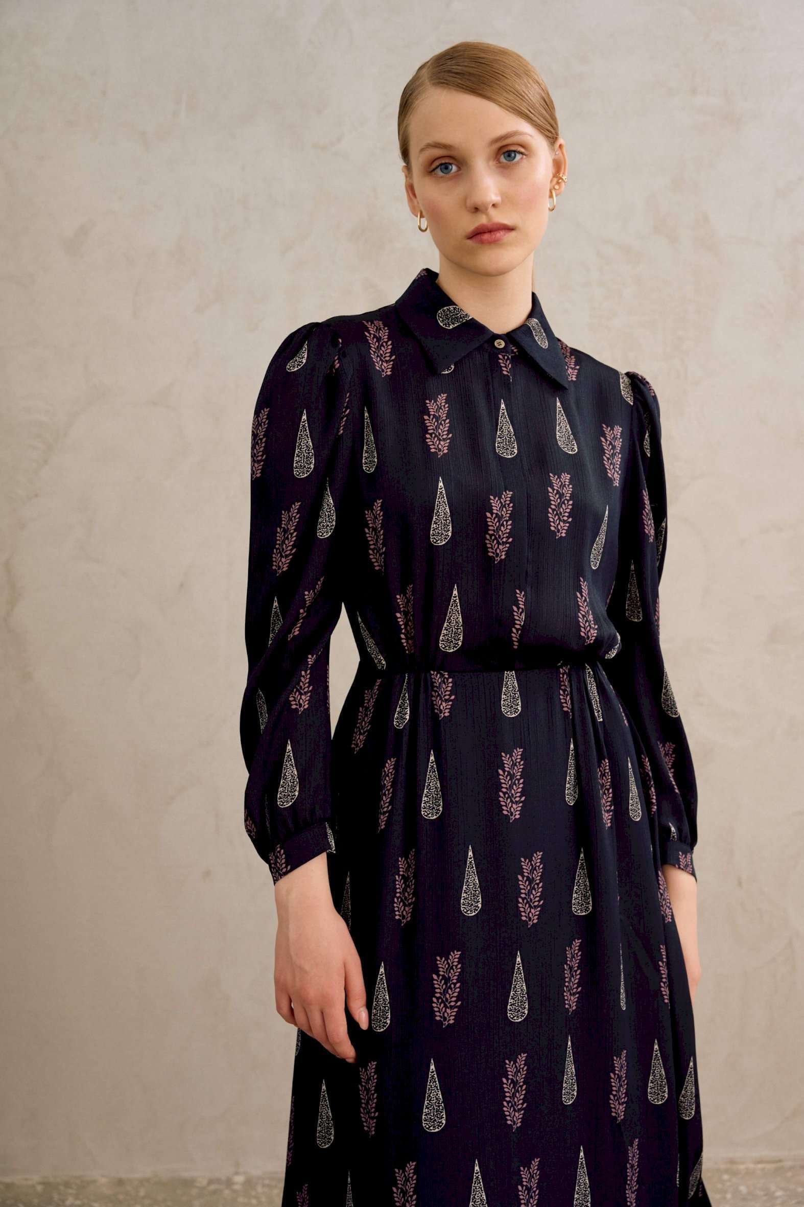 Платье полуприлегающего силуэта, отрезное по талии. Рукав втачной, по низу рукава манжета с застежкой на петли и пуговицы. Воротник рубашечного кроя, по переду центральная потайная застежка на петли и пуговицы до талии. По спинке отрезная кокетка и сборки от кокетки. К платью прилагается пояс. Платье: Длина по спинке от высшей точки горловины: 137 см Длина до талии: 44 см Длина рукава: 59 см ОГ: 88-92-96-100-104 см (размер 42-44-46-48-50) ОТ: 62-66-70-74-78 см (размер 42-44-46-48-50), в растяжении 84-88-92-96-100 см (размер 42-44-46-48-50)