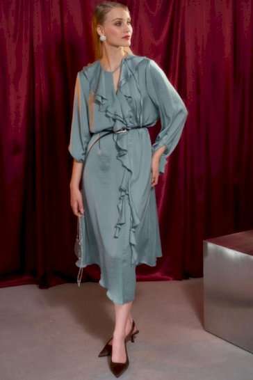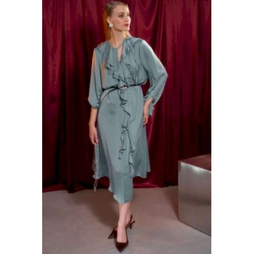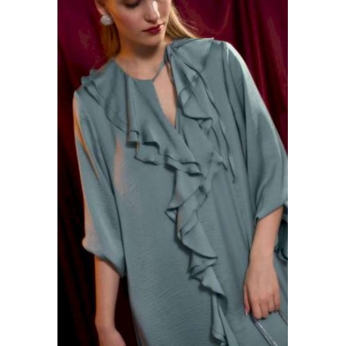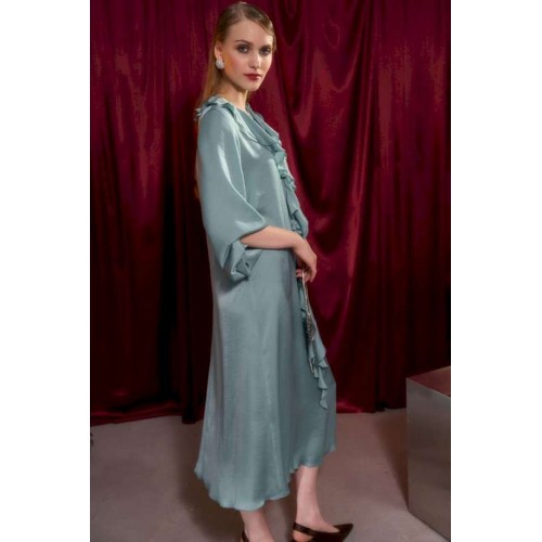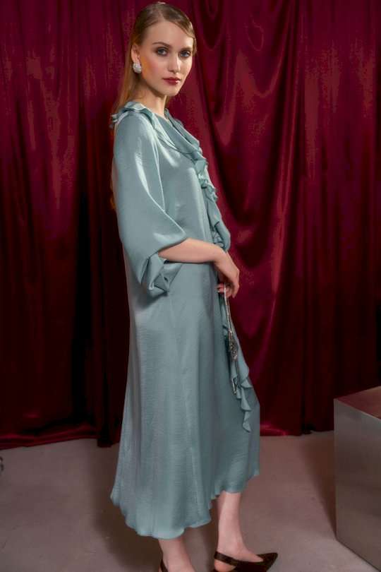 Платье свободного кроя, А силуэта. Рукав втачной на манжете. В Y-образный вырез горловины вшиты воланы. По горловине застежка на завязку. Длина по спинке от высшей точки горловины: 122 см Длина рукава: 64 см ОГ: 110-114-118-122-126-130-134-138 см (размер 42-44-46-48-50-52-54-56) ОТ: 104-108-112-116-120-124-128-132 см (размер 42-44-46-48-50-52-54-56) ОБ: 120-124-128-132-136-140-144-148 см (размер 42-44-46-48-50-52-54-56)
