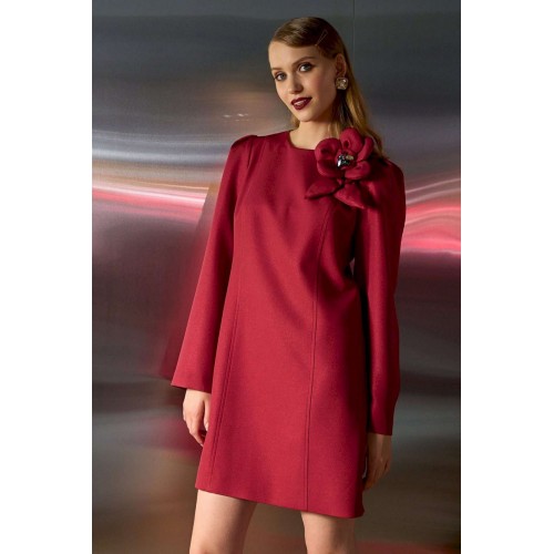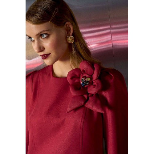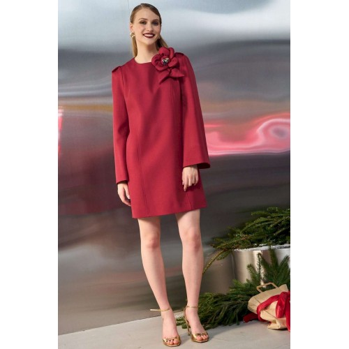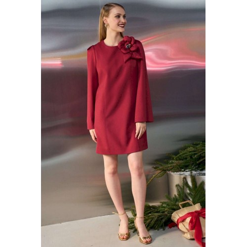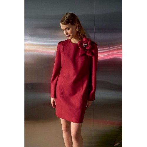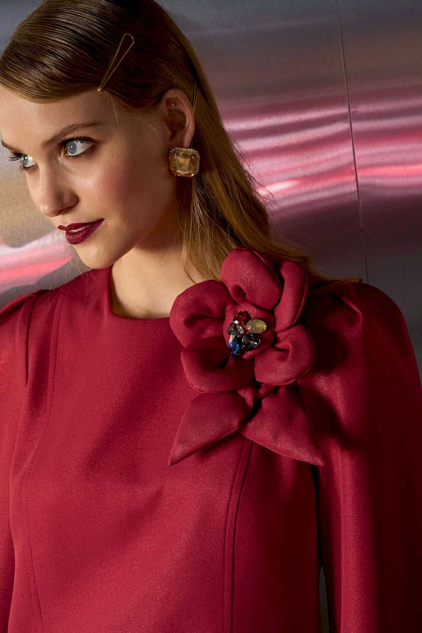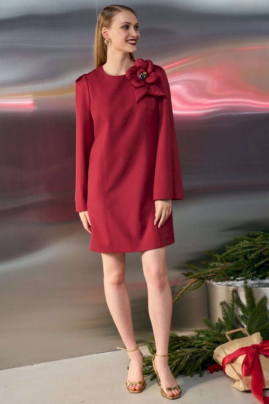 Платье свободного кроя, выполнено из плательной ткани, на подкладке. Рукав втачной, расширенный к низу, по верхней части рукава складки. Округлый вырез горловины, по переду и спинке вертикальные рельефы. По спинке средний шов, переходящий в застежку на потайную молнию. К платью предлагаем брошь-цветок. Платье: Длина по спинке от высшей точки горловины: 87 см Длина рукава: 66 см ОГ: 96-100-104-108-112 см (размер 44-46-48-50-52) ОТ: 90-94-98-102-106 см (размер 44-46-48-50-52)