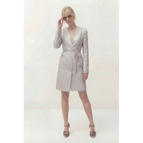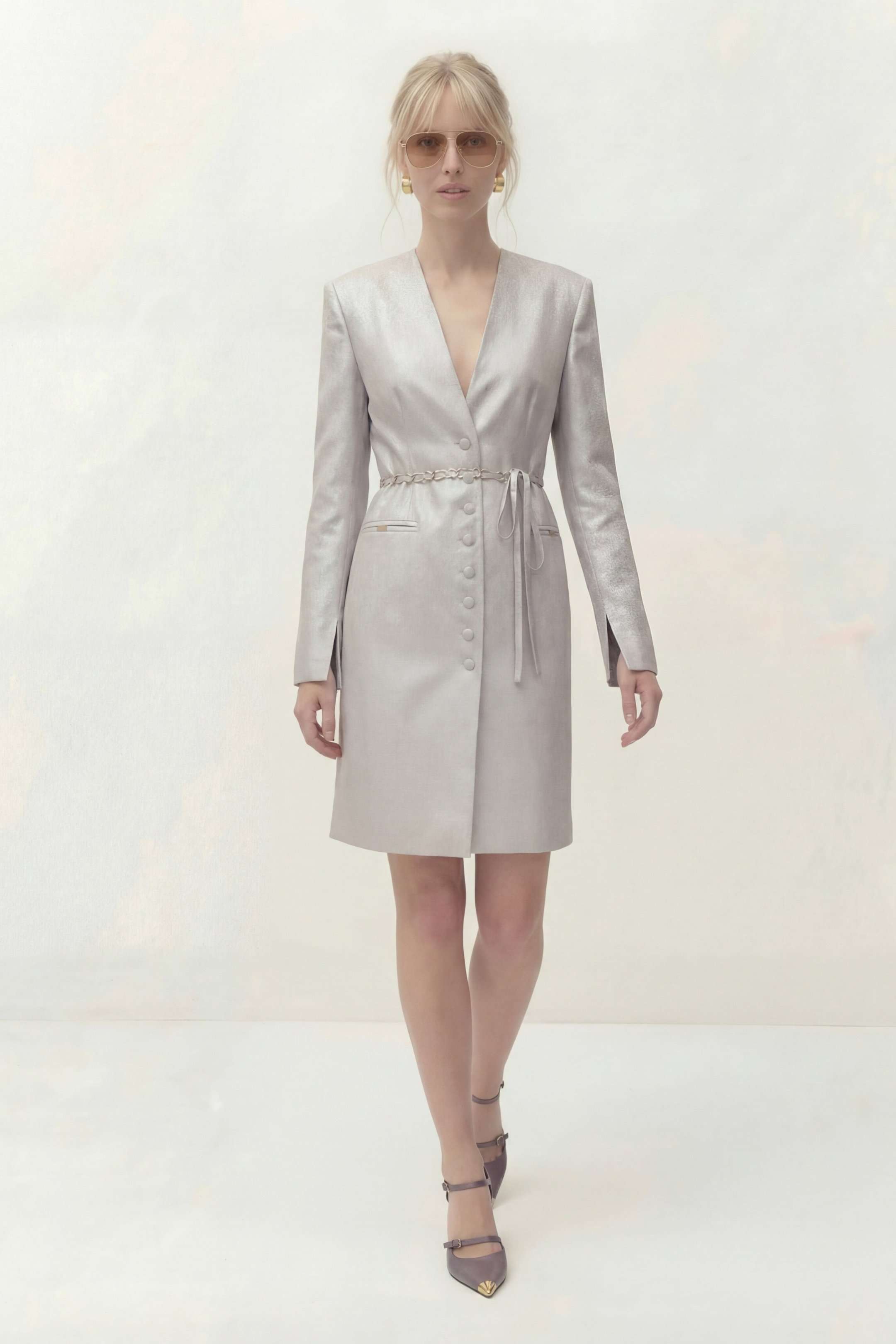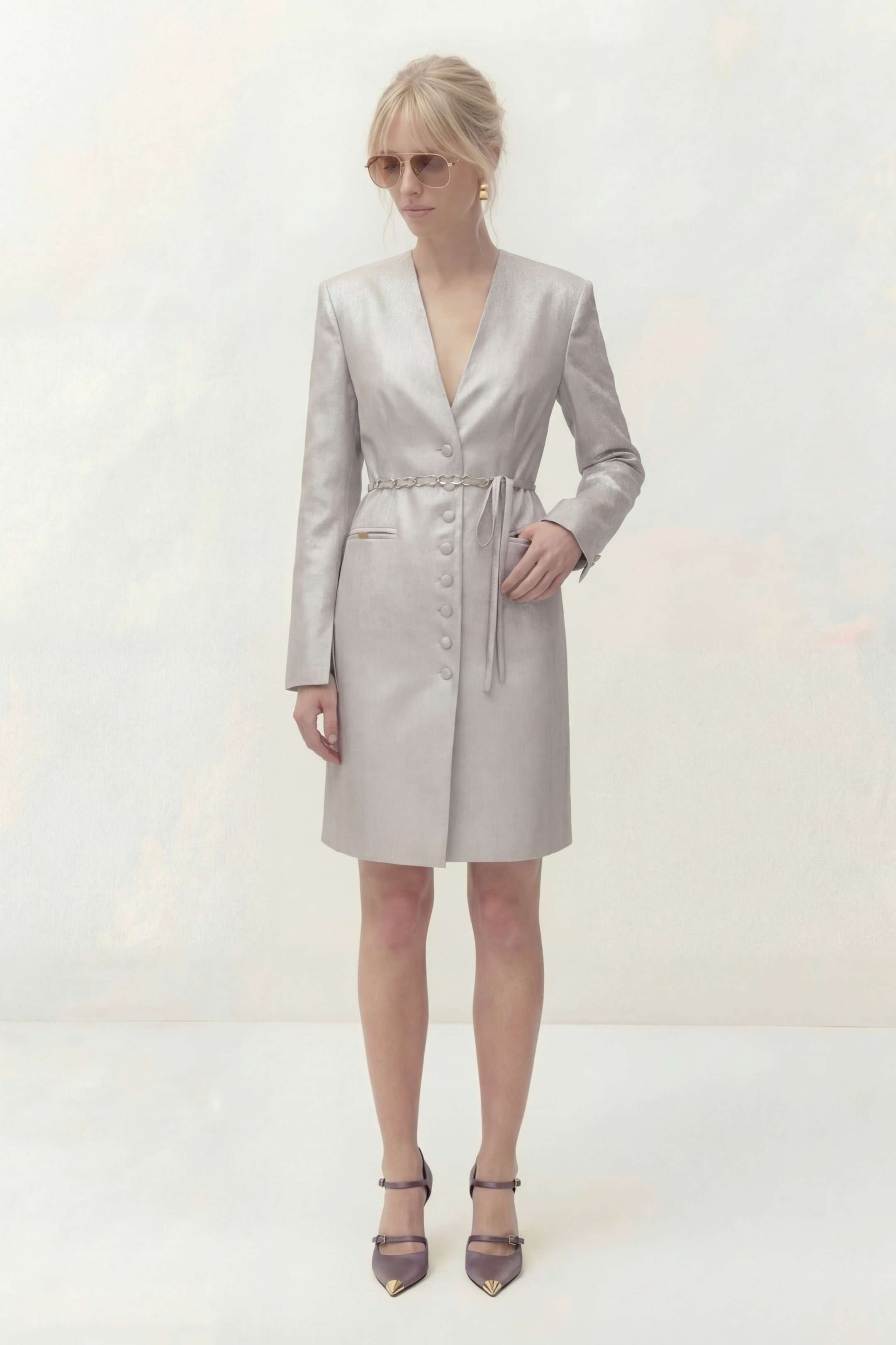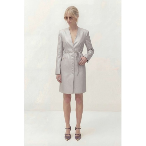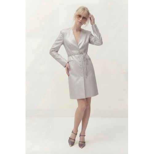 Платье полуприлегающего силуэта на подкладке. Рукав длинный втачной, по по переднему шву разрез. Y-образный вырез горловины. Застежка центральная на петли и пуговицы. По спинке средний шов и выточки. Пояс ручной работы, декорирован цепью и входит в состав платья. Платье: Длина платья по спинке: 96 см Длина рукава: 62 см ОГ: 92-96-100-104-108 см (размер 44-46-48-50-52) ОТ: 78-82-86-90-94 см (размер 44-46-48-50-52) ОБ: 98-102-106-110-114 см (размер 44-46-48-50-52)