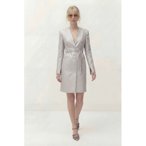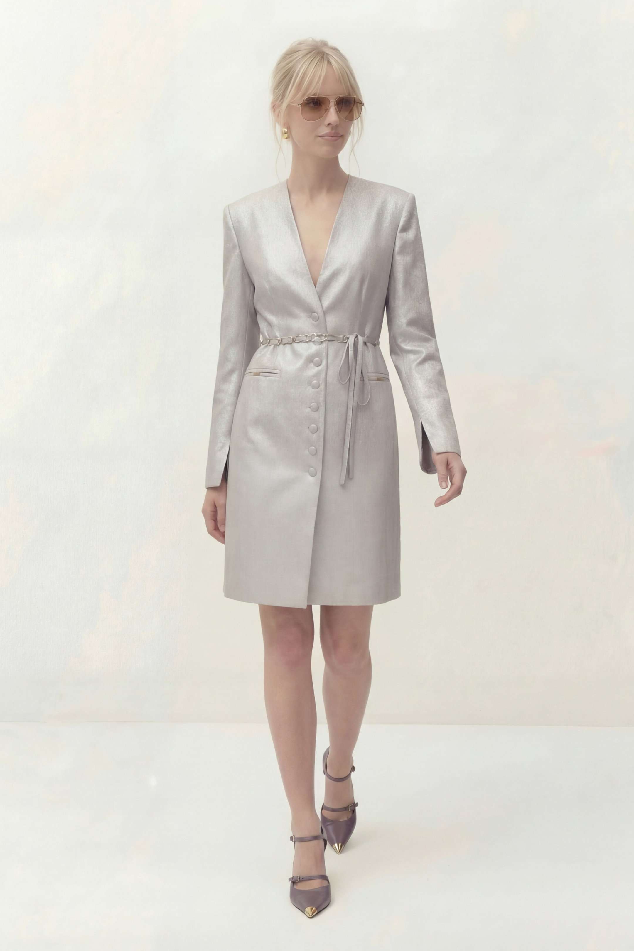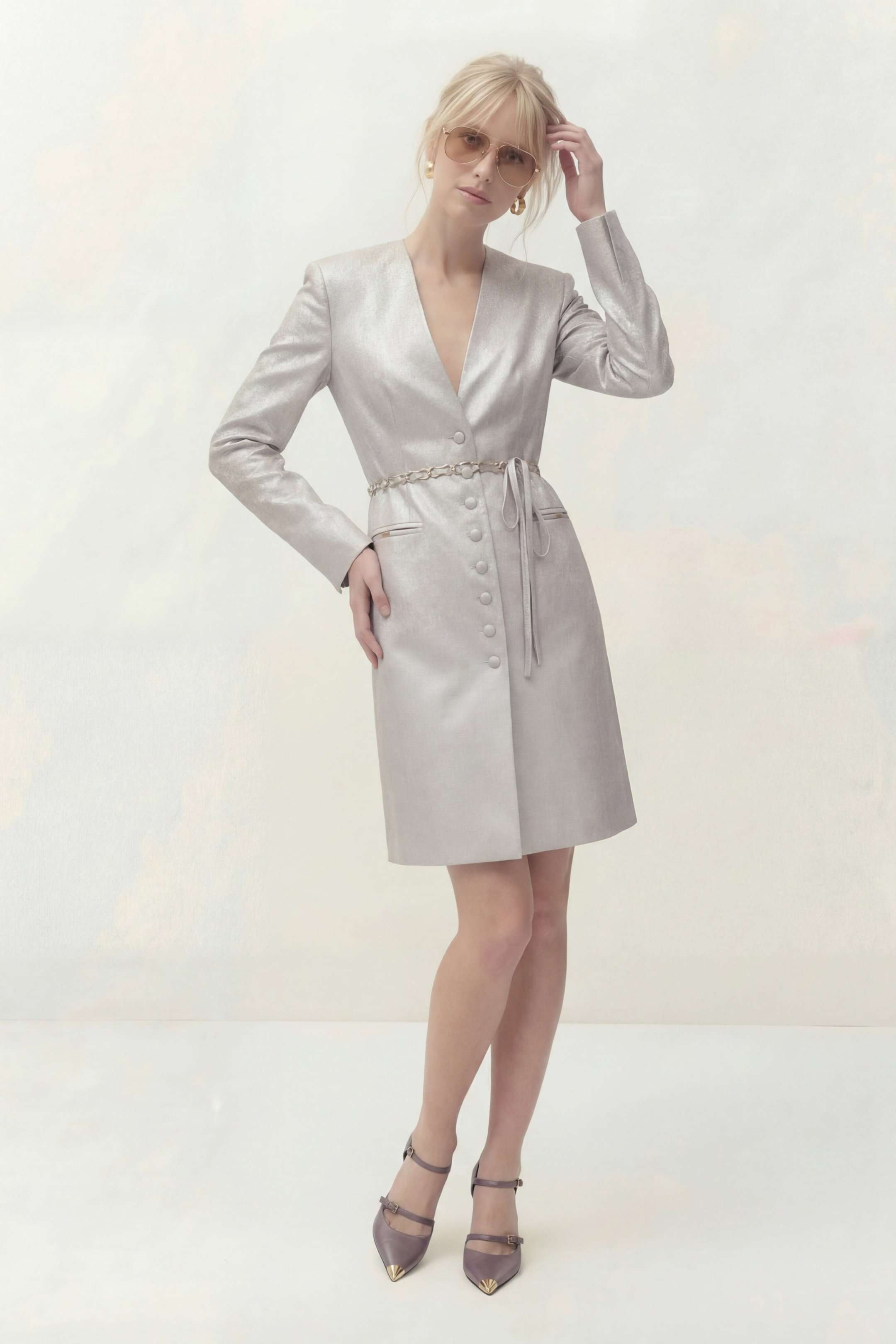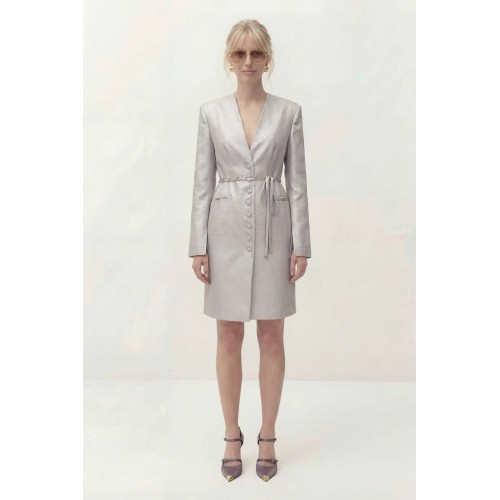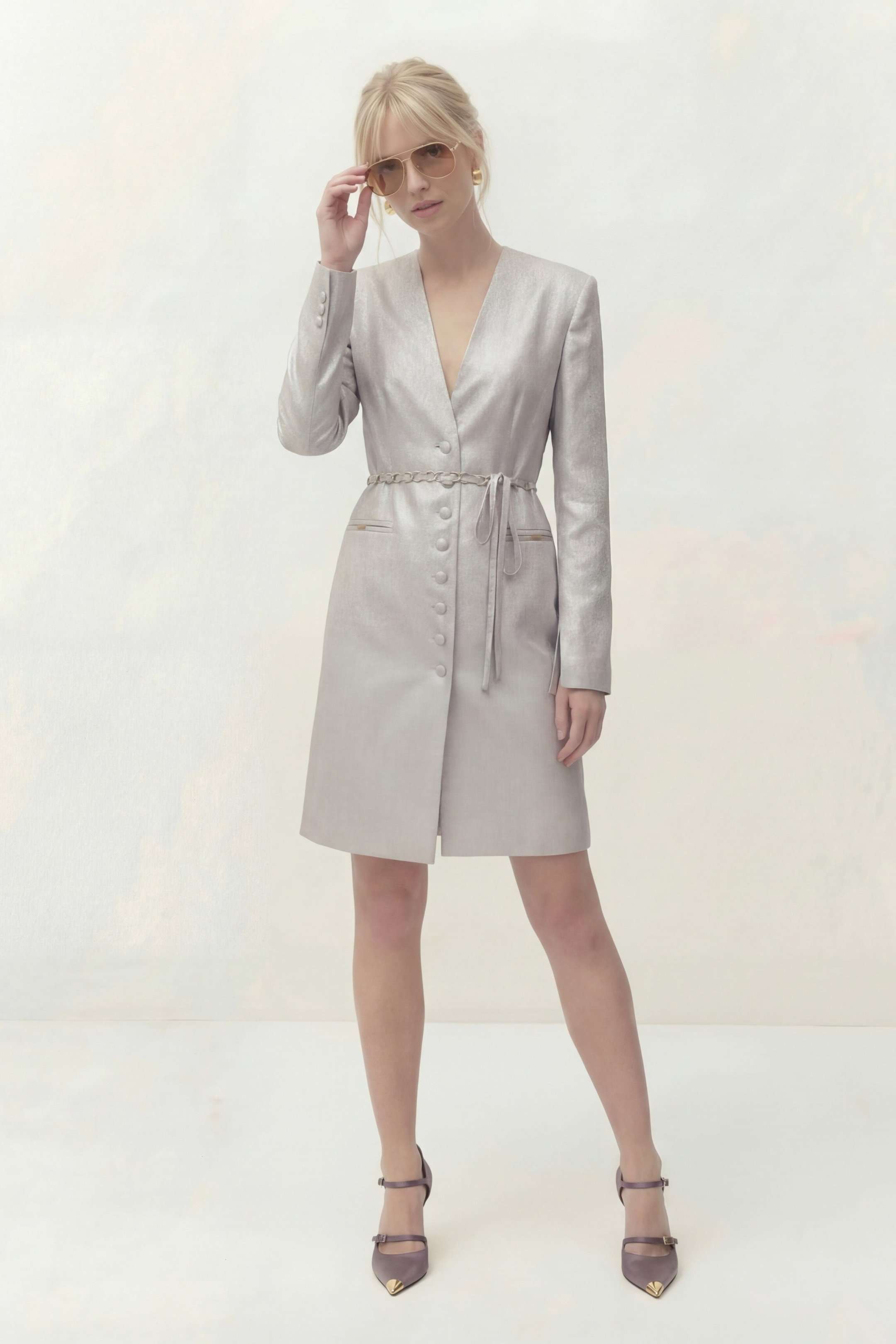 Платье полуприлегающего силуэта на подкладке. Рукав длинный втачной, по по переднему шву разрез. Y-образный вырез горловины. Застежка центральная на петли и пуговицы. По спинке средний шов и выточки. Пояс ручной работы, декорирован цепью и входит в состав платья. Платье: Длина платья по спинке: 96 см Длина рукава: 62 см ОГ: 92-96-100-104-108 см (размер 44-46-48-50-52) ОТ: 78-82-86-90-94 см (размер 44-46-48-50-52) ОБ: 98-102-106-110-114 см (размер 44-46-48-50-52)