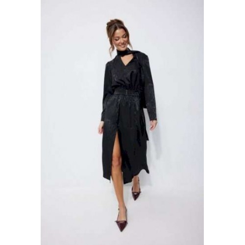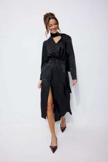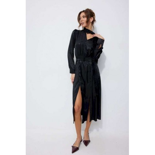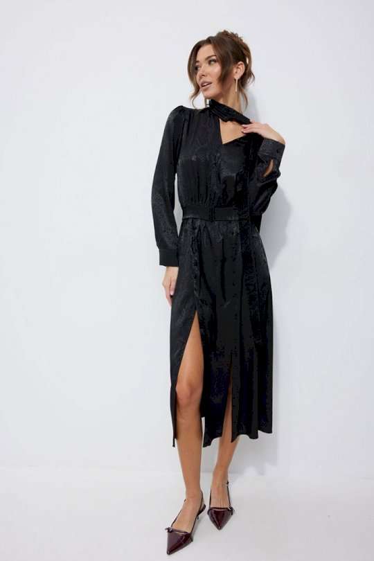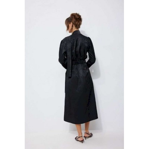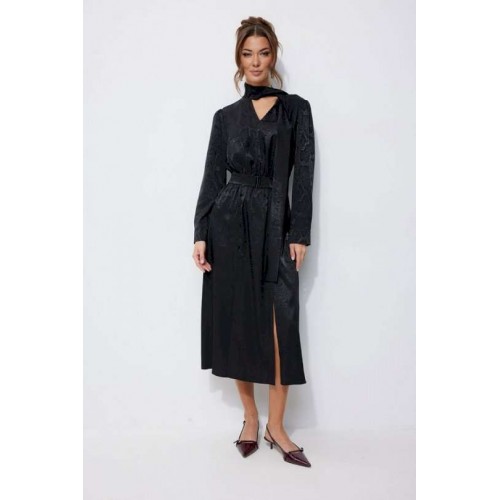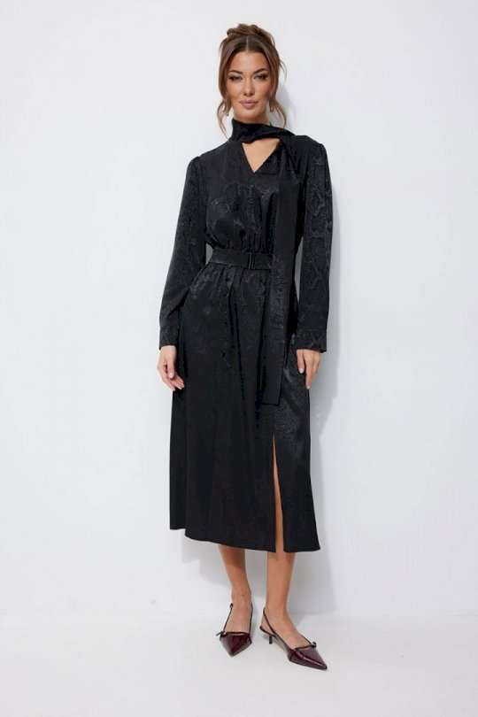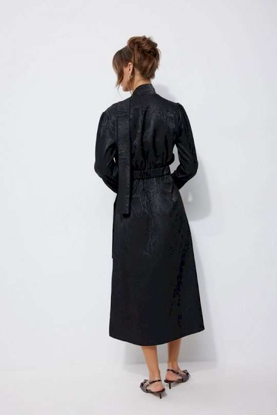 Нарядное платье из жаккардового атласа с анималистичным дизайном. Платье свободного кроя. Отрезное по талии, с резинкой. Рукав длинный, с манжетой с застежкой на петлю с пуговицей. Платье с мягким воротником-стойкой, переходящим в бант-завязки по переду. По переду V-образный вырез по горловине. По переднему полотнищу юбки шлицы в рельефах, рельефы от талии до шлиц декорированы пуговицами. Платье дополняется съемным поясом из основной ткани, с пряжкой. В среднюю часть пояса вставлена резинка. Обращаем Ваше внимание, что фурнитура может незначительно отличаться от фото. Длина платья 130 см во всех размерах. Длина рукава 62 см во всех размерах.
