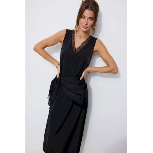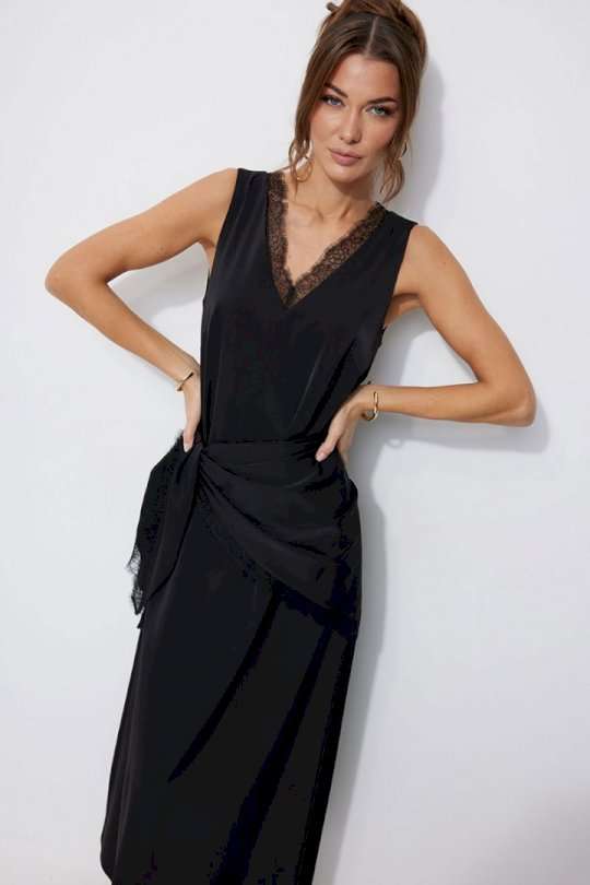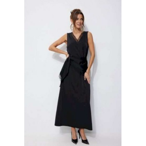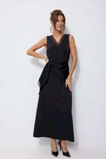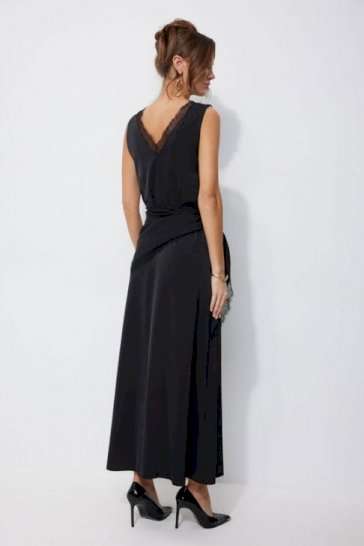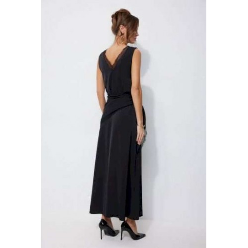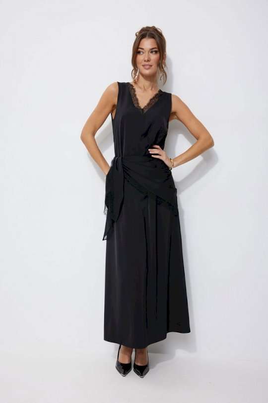 Нарядное платье из струящейся ткани, длина макси. Платье свободного кроя, прямое, расширенное к низу. С глубоким V-образным вырезом горловины по переду и спинке, декорированным французским кружевом. По переду нагрудные вытачки. Без рукава. Платье дополняется платком из основной ткани. Платок декорирован по двум срезам французским кружевом. Обращаем Ваше внимание, что кружево может незначительно отличаться от фото. Длина платья от плеча 139 см во всех размерах.