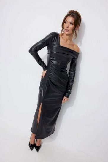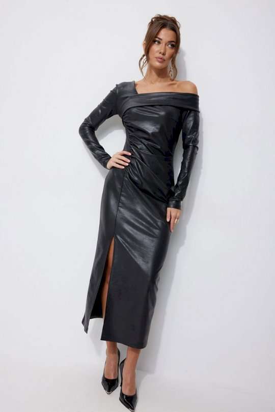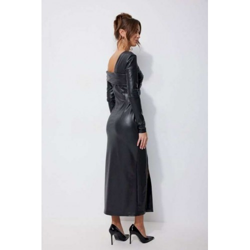Ассиметричное платье прилегающего силуэта из трикотажного полотна. Верхняя часть платья с ассиметричным вырезом. Рукав одношовный втачной. По переду нагрудная вытачка и рельеф со сборкой, по низу в рельефе разрез. На спинке талиевые вытачки. В боковом шве потайная молния. Длина платья от плеча в 44-48р 133см, в 50-54р 135см. Длина рукава 62 см.