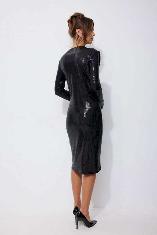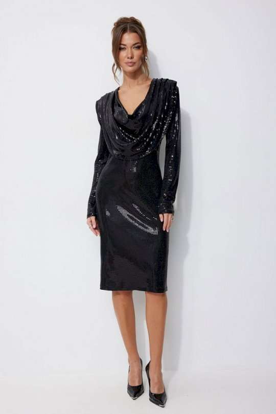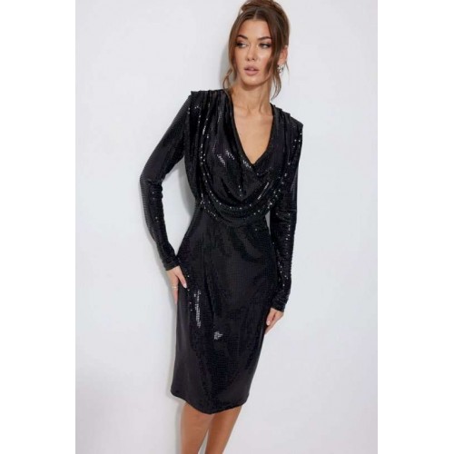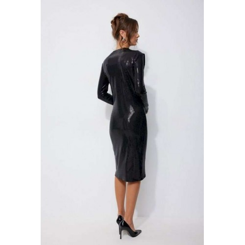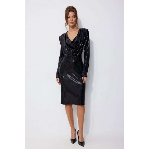 Платье полуприлегающего силуэта из трикотажного полотна. По переду глубокий вырез и декоративная деталь ’качель’. Рукав втачной удлиненный. На спинке талиевые вытачки. Длина платья в 44-48р 106см, в 50-54р 107см. Длина рукава 62 см.
