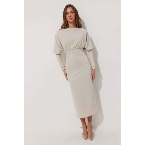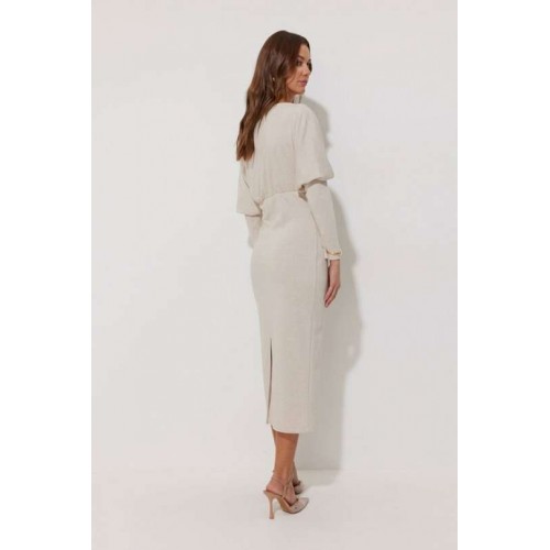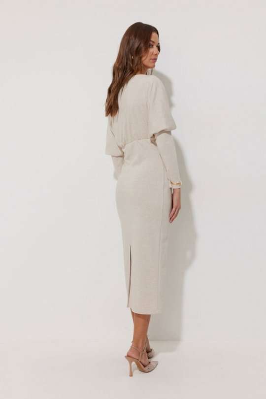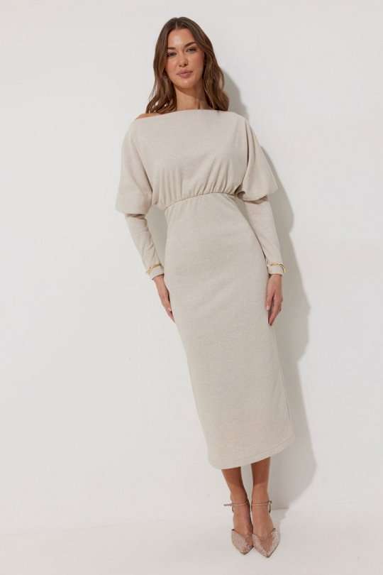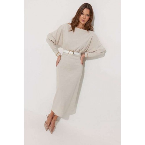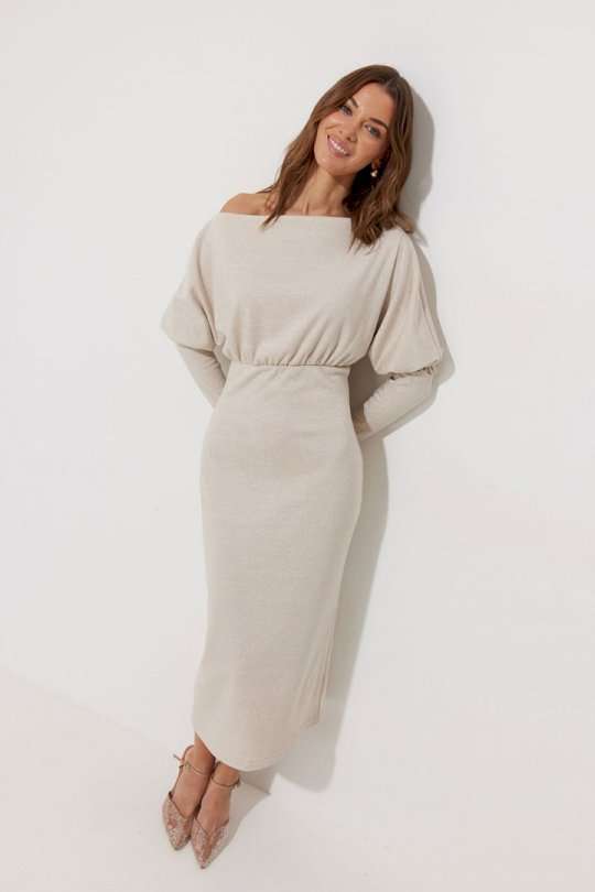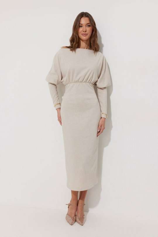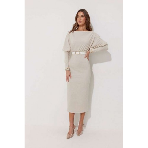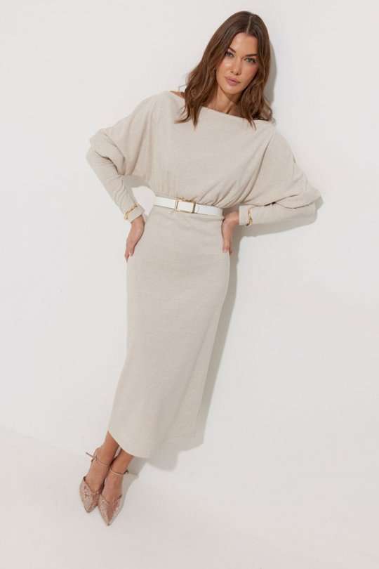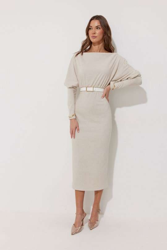 Платье полуприлегающего силуэта из трикотажного полотна. Горловина-лодочка. Рукав цельнокроеный, с подрезом выше уровня локтя и узкой длинной манжетой. По переду и спинке выше линии талии подрез, в который вставлена резинка. Обращаем ваше внимание, что ремень в комплект не входит. Подходит на рост 164-170 см. Длина платья (44-48р - 120см)(50-54р – 121см). Длина рукава от горловины 65см.