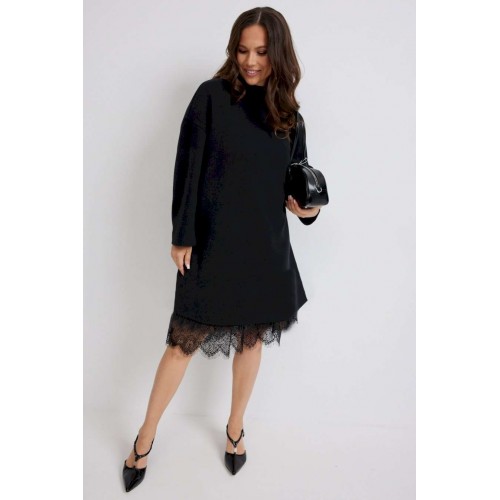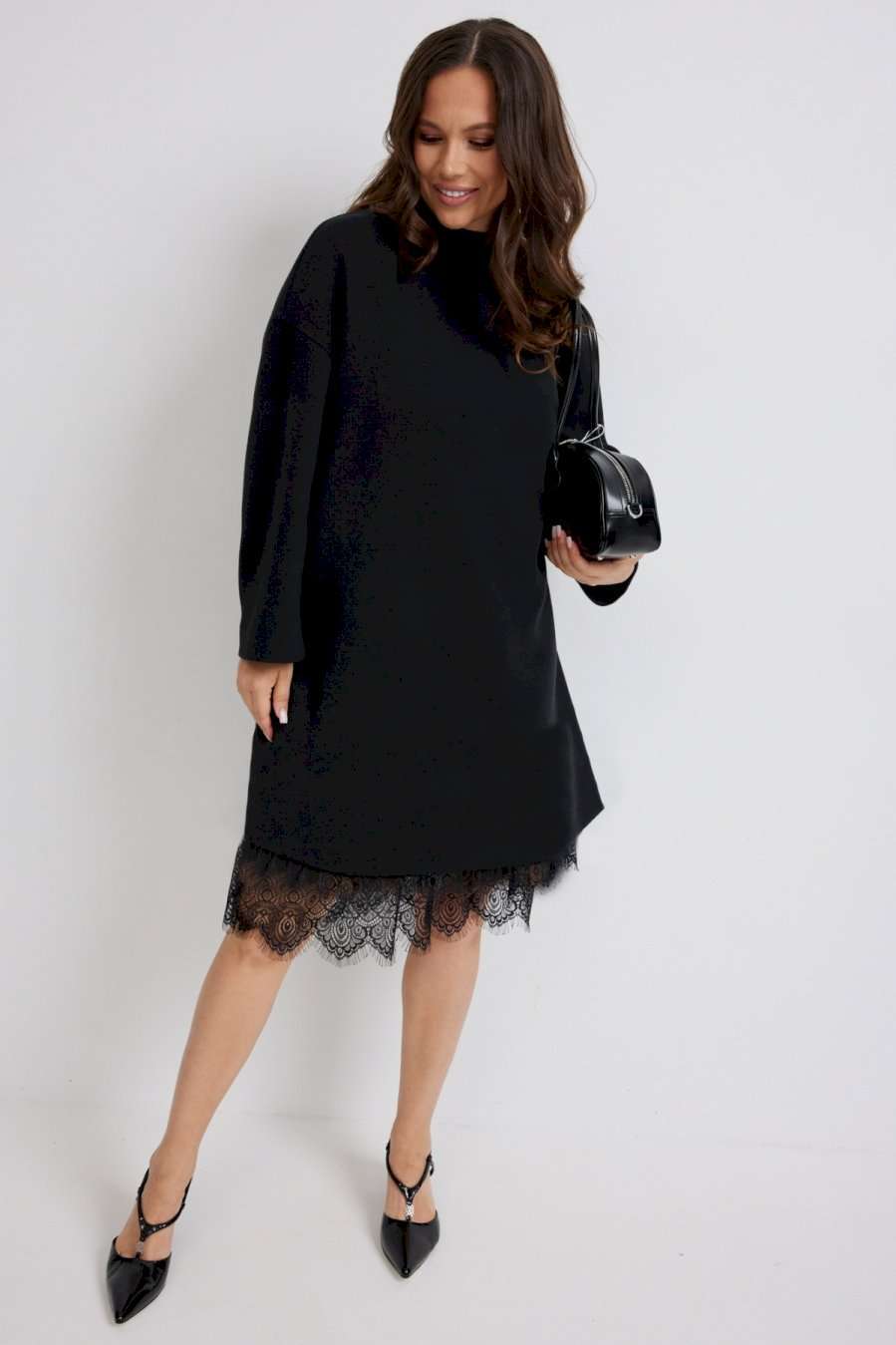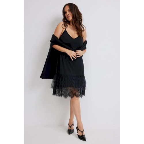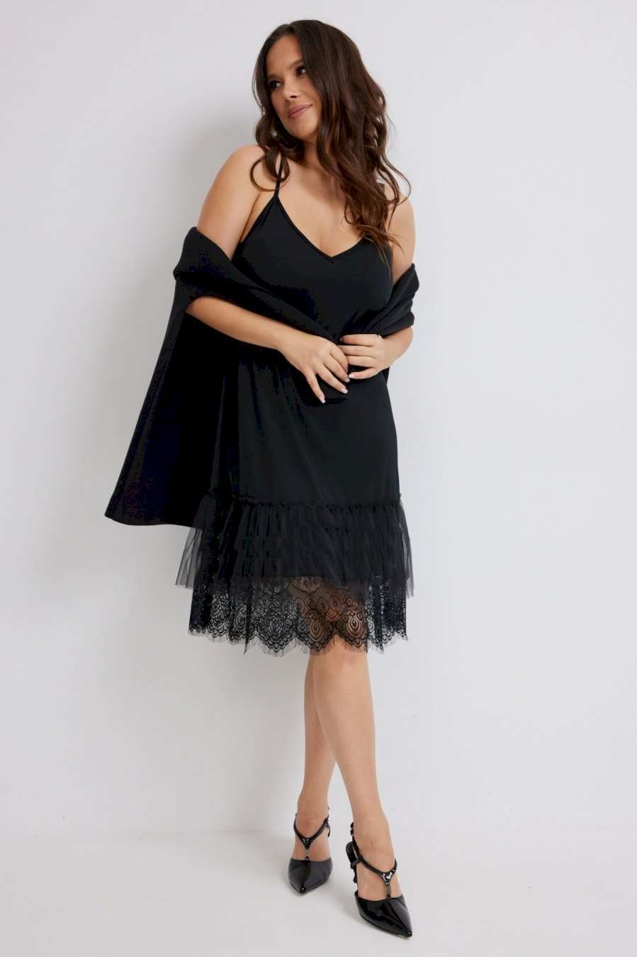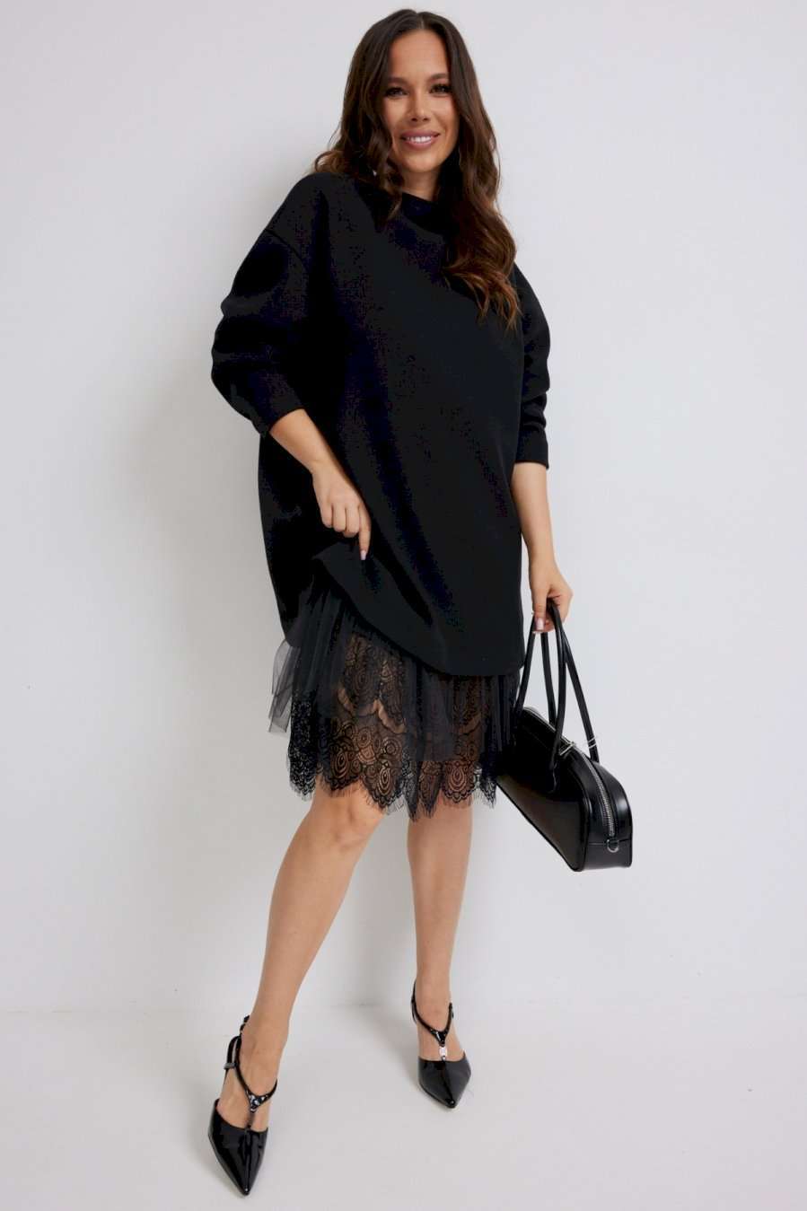 Стильный комплект из верхнего трикотажного платья и нижнего платья-комбинации. Верхнее платье свободного прямого кроя с длинным рукавом. Выполнено из приятного к телу трикотажного полотна средней плотности, который прекрасно держит форму. Нижнее платье-комбинация выполнено из нежного трикотажного полотна, дополненного красивым кружевом и фатином. Комбинация на тонких регулируемых бретелях. Длина верхнего платья от плечевого шва 81см. Длина рукава 60см. Длина нижнего платья 95см.
