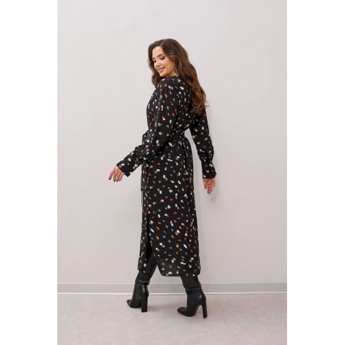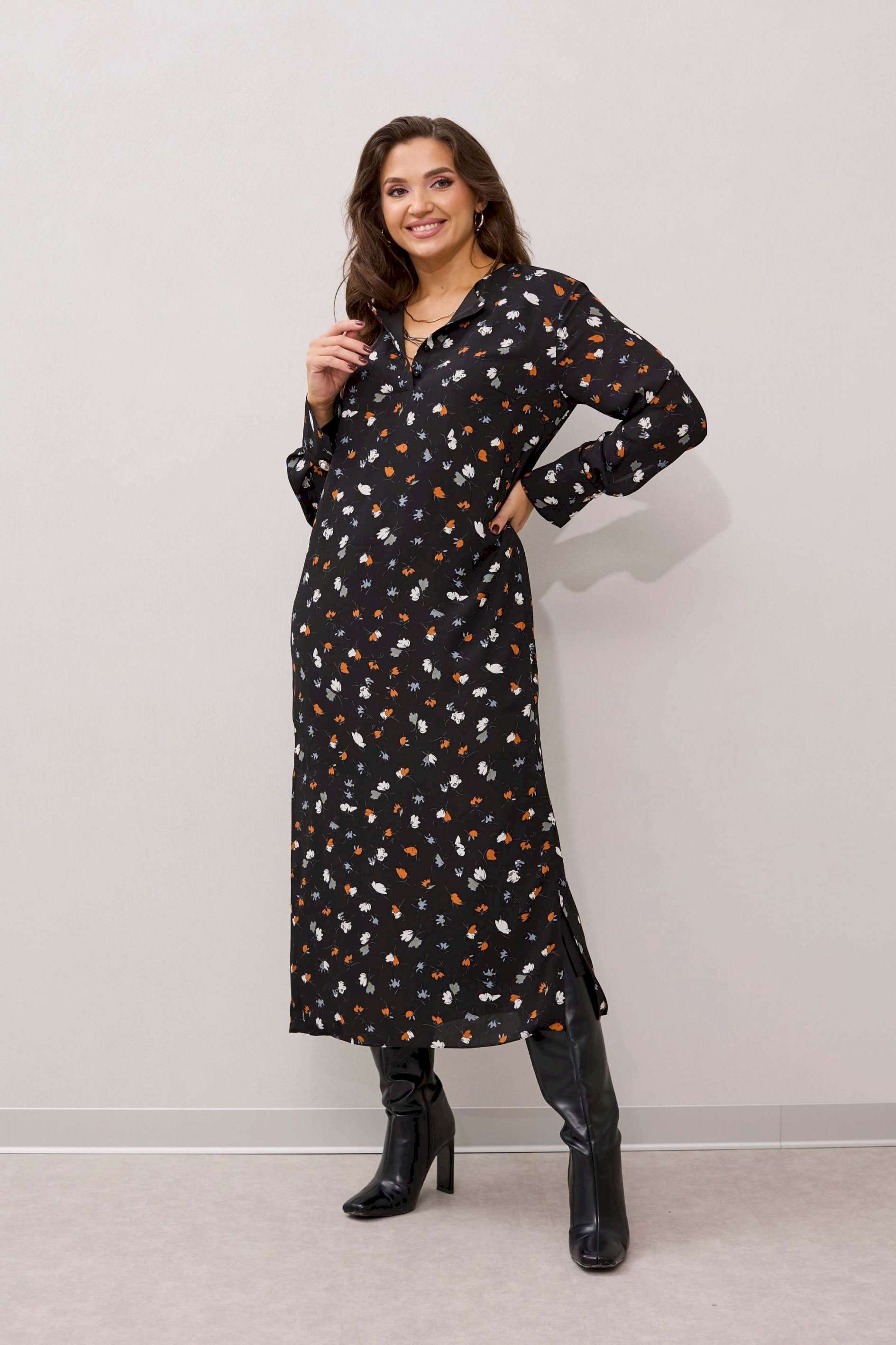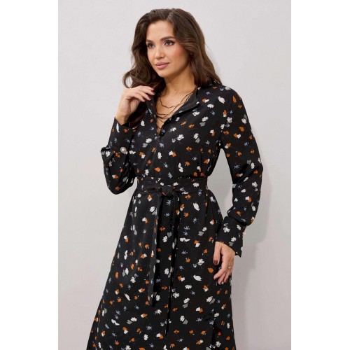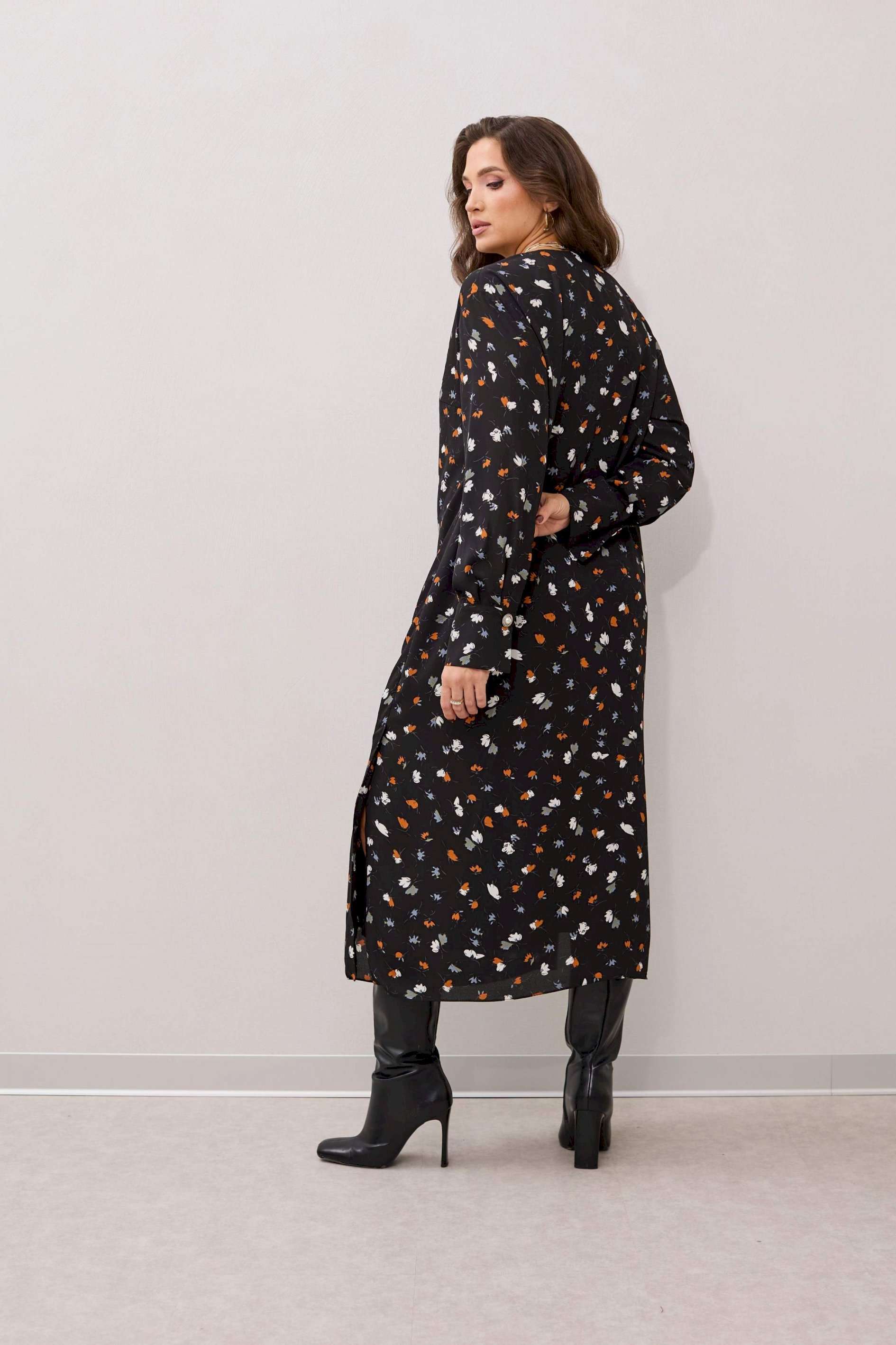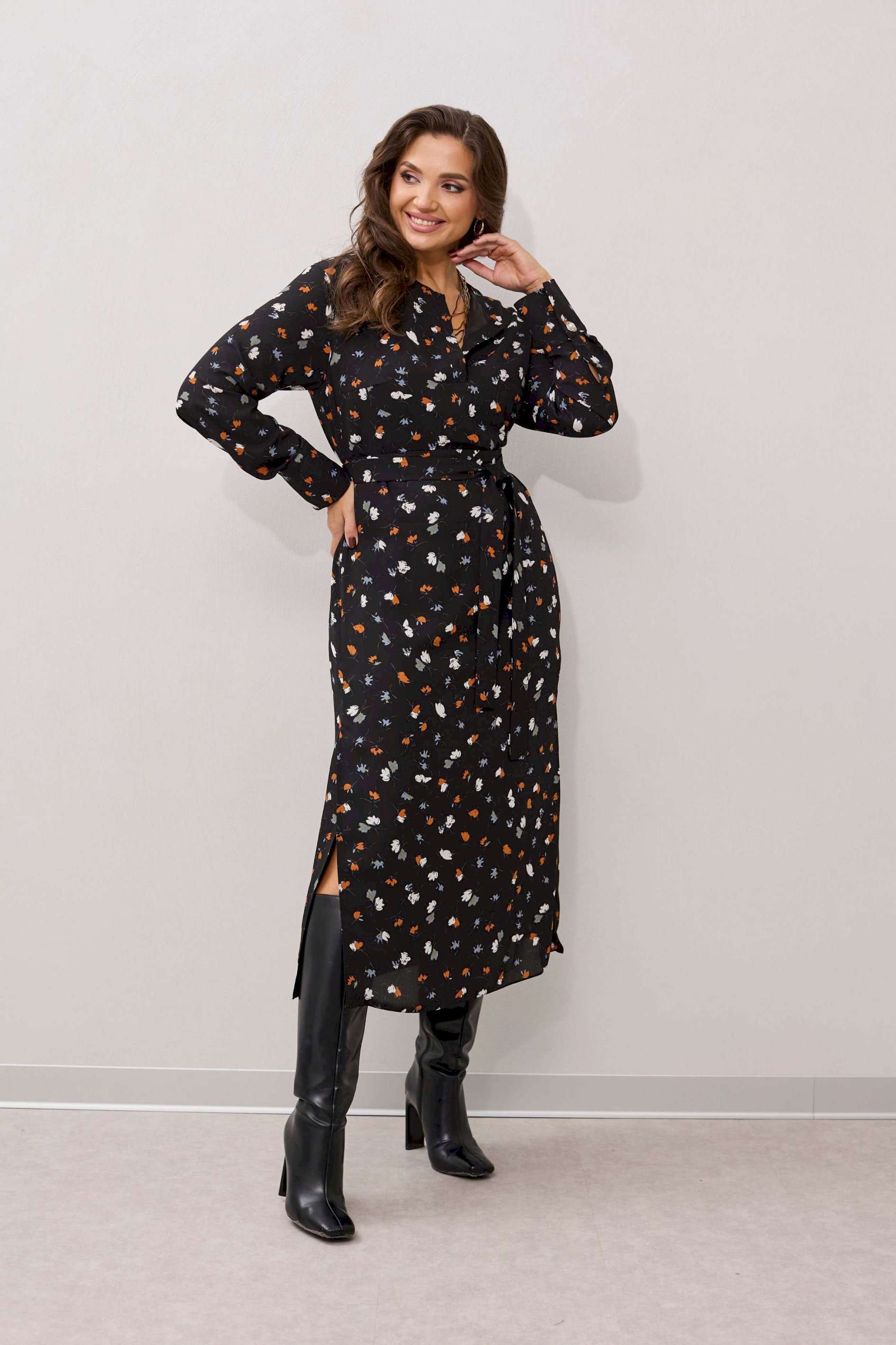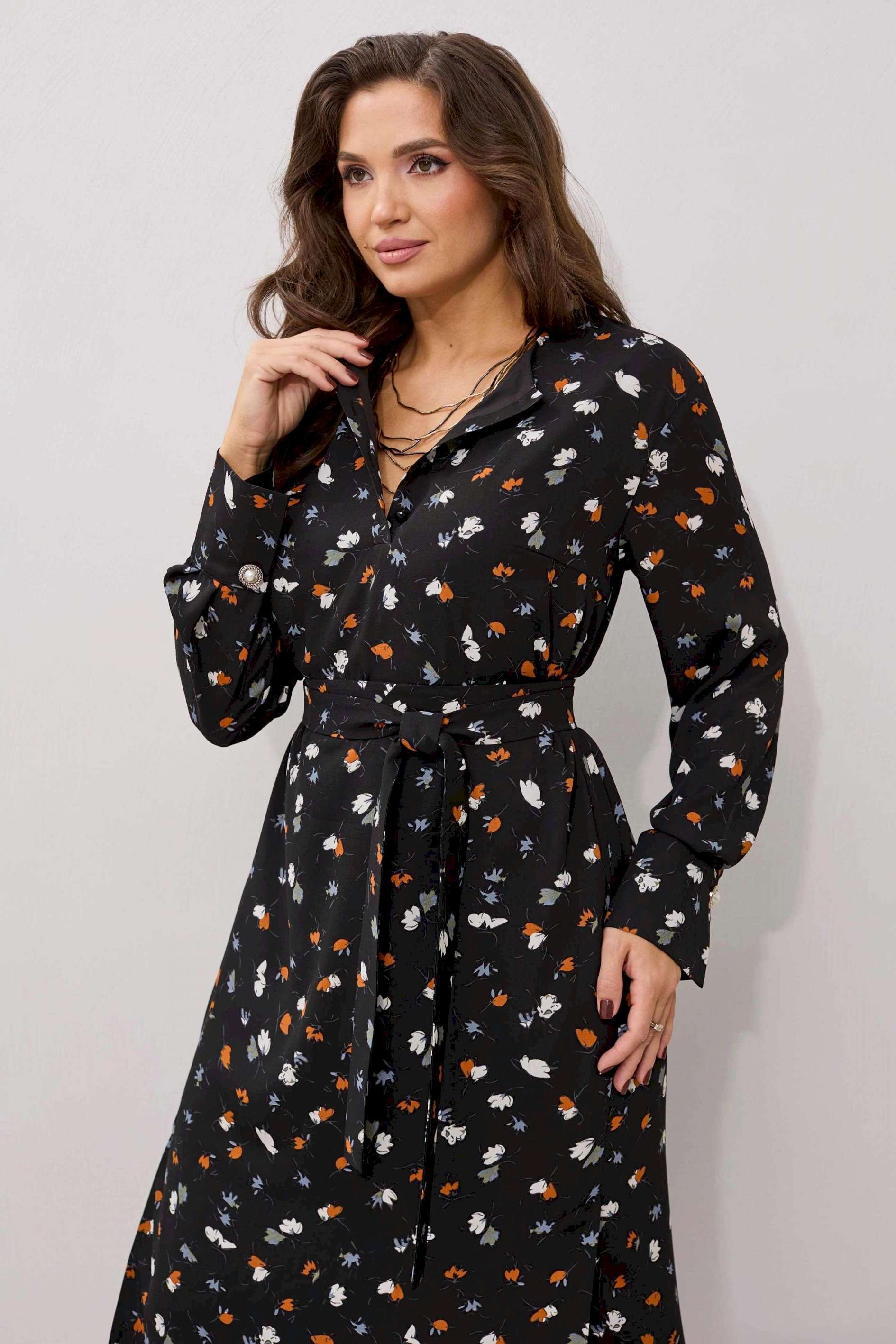 Платье прямого силуэта с длинным втачным рукавом на манжете. Горловина округлой формы с планкой и застежкой на пуговицы. Во бокам снизу шлицы. В комплекте пояс из основной ткани. Платье на подкладке.