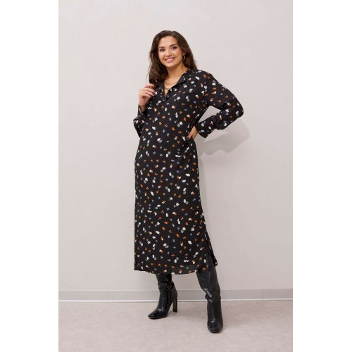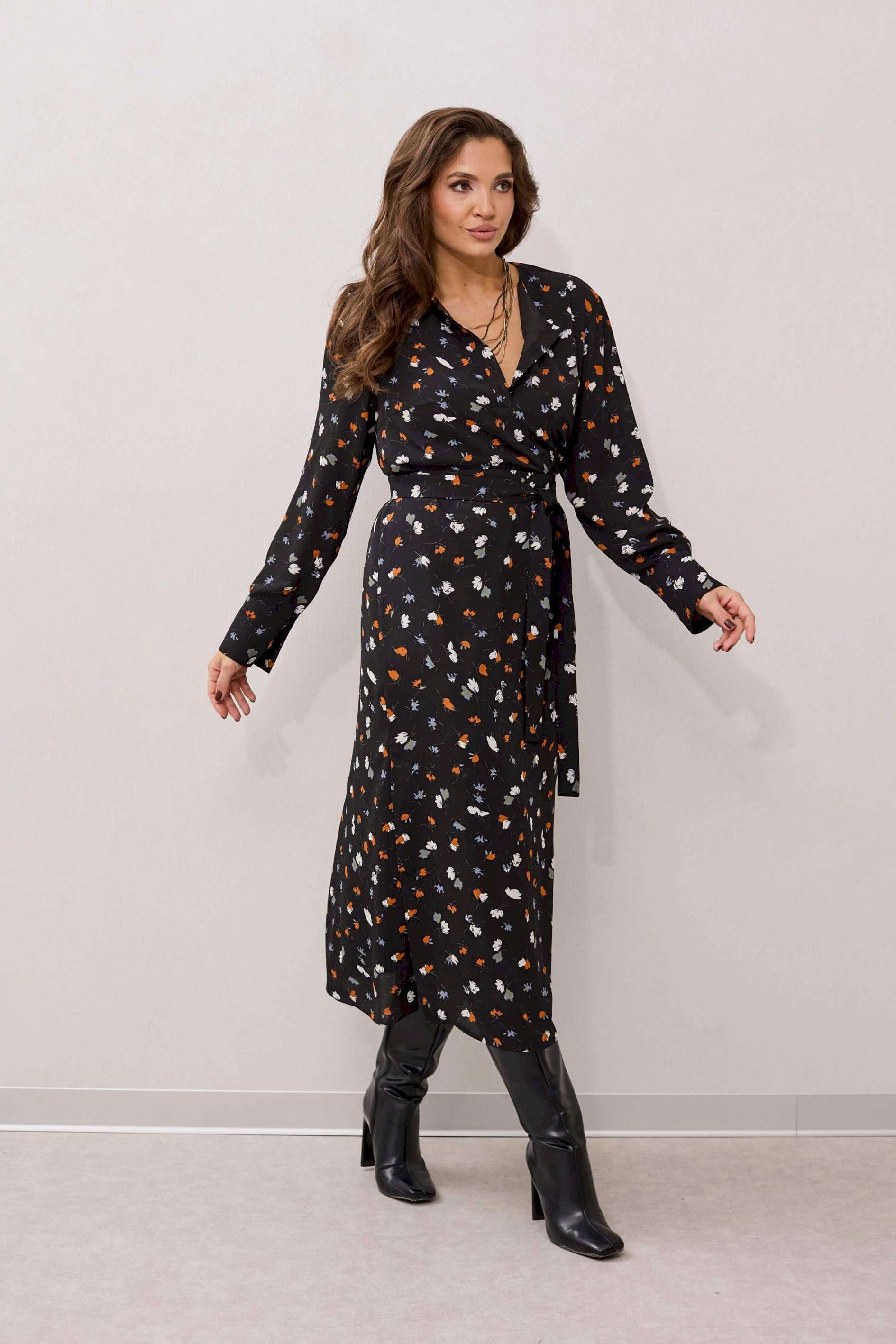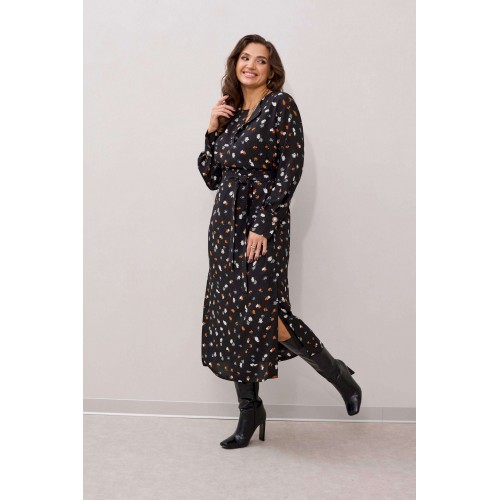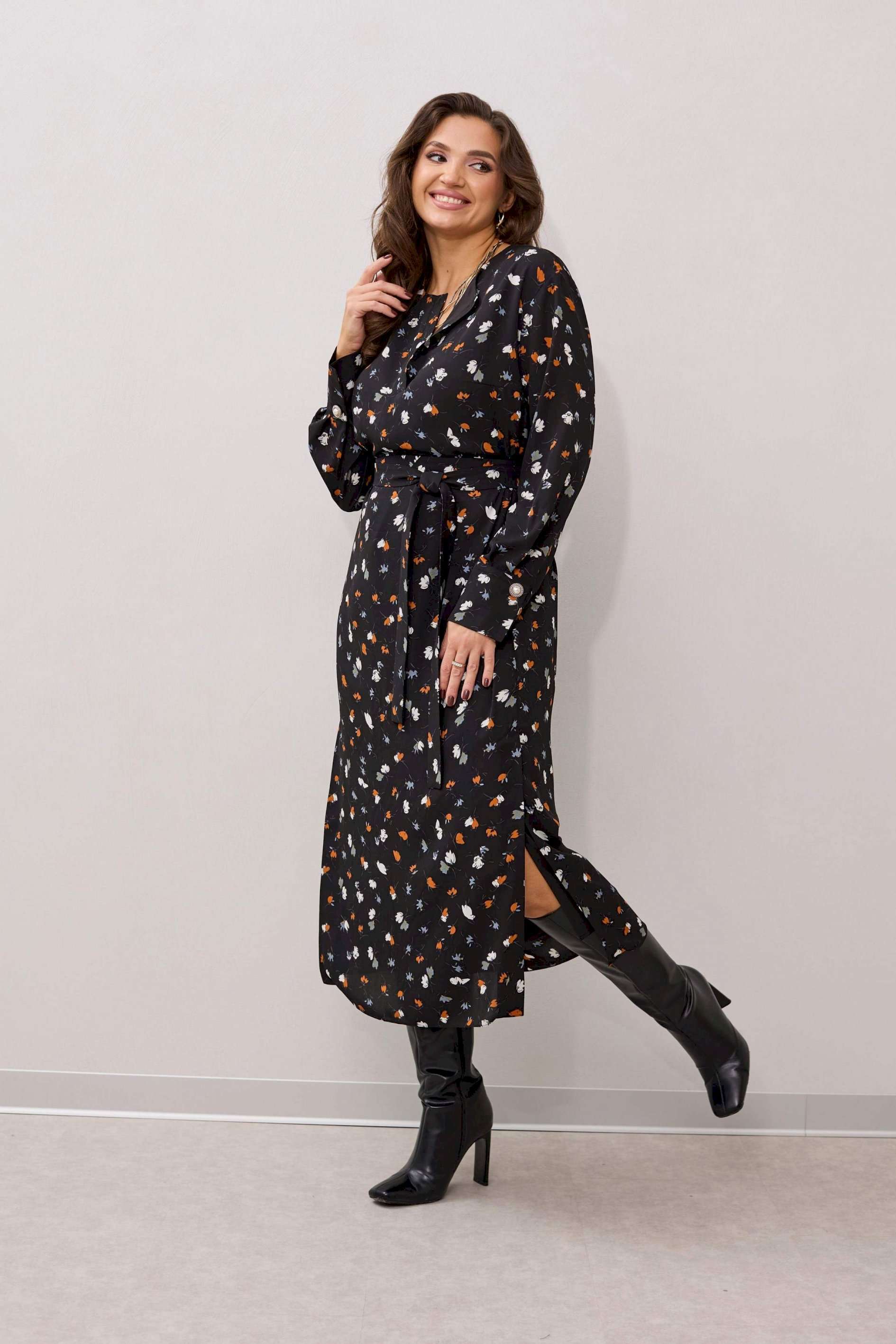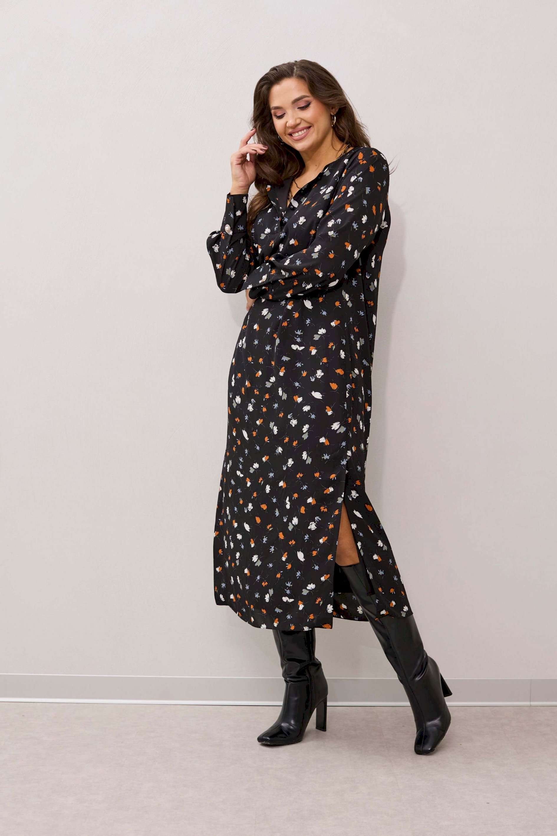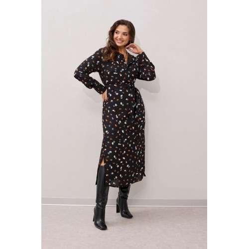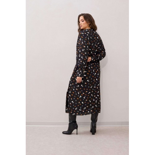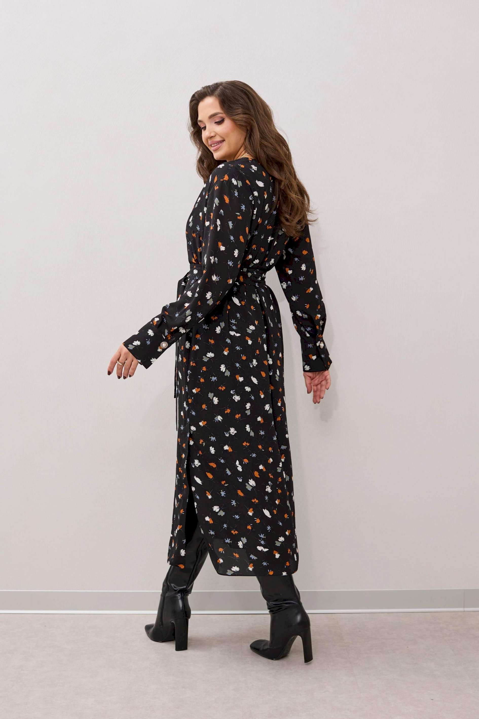 Платье прямого силуэта с длинным втачным рукавом на манжете. Горловина округлой формы с планкой и застежкой на пуговицы. Во бокам снизу шлицы. В комплекте пояс из основной ткани. Платье на подкладке.