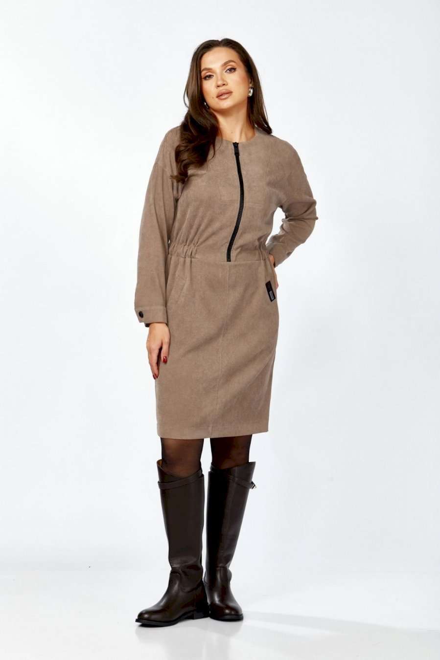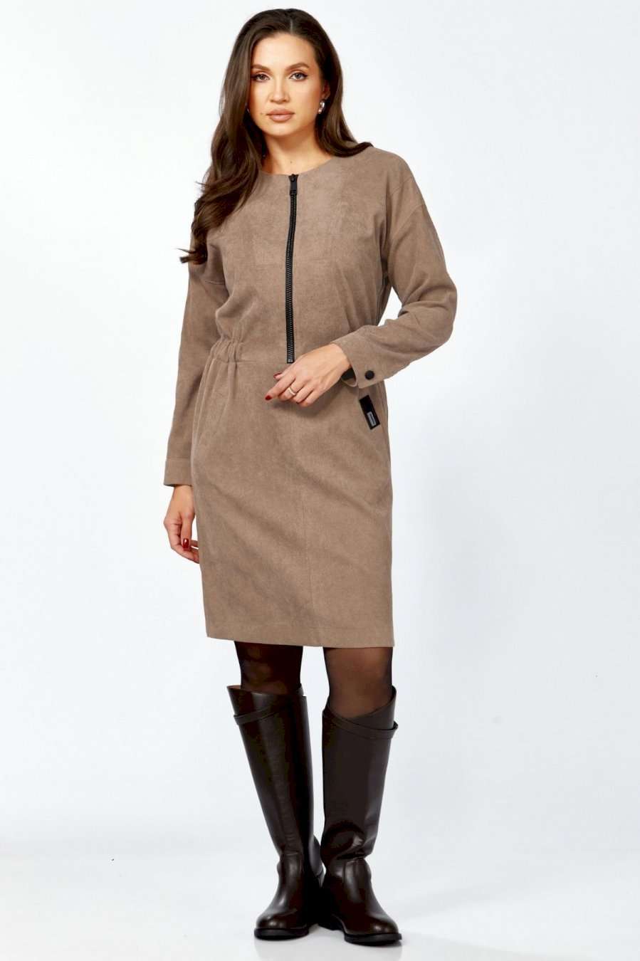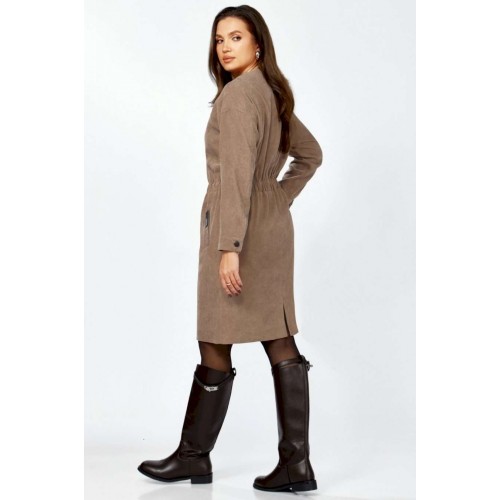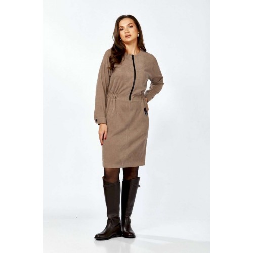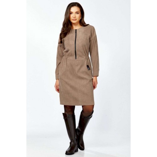 Платье полуприлегающего силуэта из мягкой, комфортной штруксовой ткани. Рукав спущенный, длинный, на манжете с застёжкой на 1 петлю и 1 пуговицу, разрезом. Горловина круглая, застёжка на тесьму-молнию контрастного цвета до талии. По талии подрез, по бокам спереди вставлена резинка, верхняя часть платья имитирует бомбер. Карманы- наклонные листочки, расположены на уровне бёдер по переднему полотнищу юбки, на левой листочке настрочена нашивка контрастного цвета. Перед платья с декоративными подрезами и отстрочкой. Спинка отрезная по талии, на резинке, со средним швом и разрезом по низу.