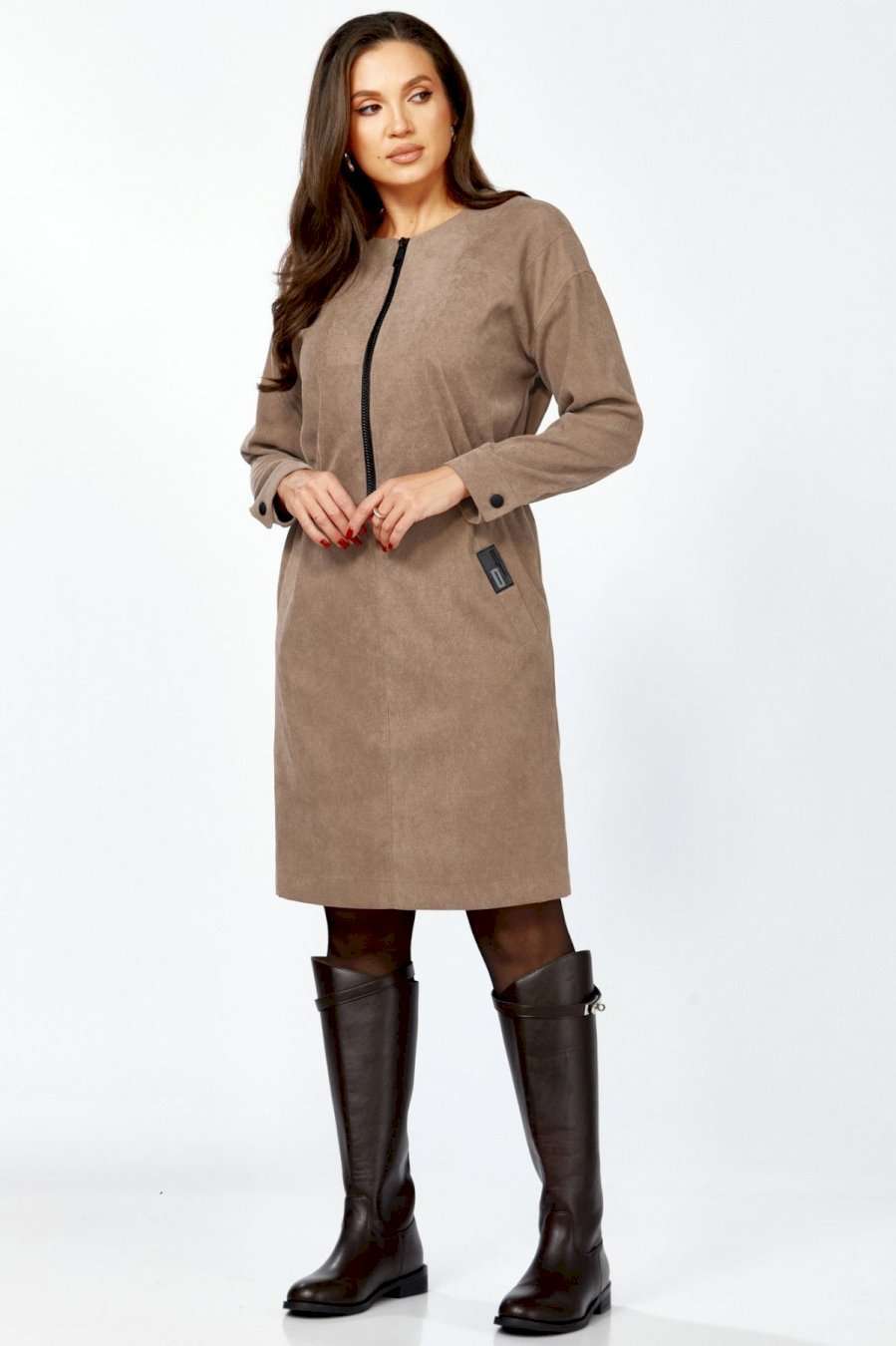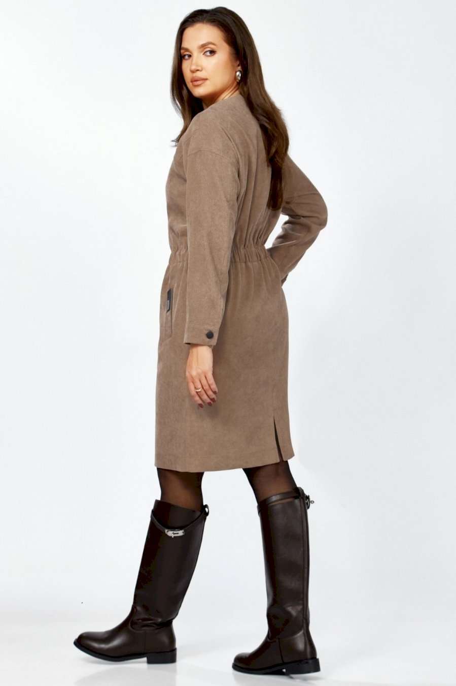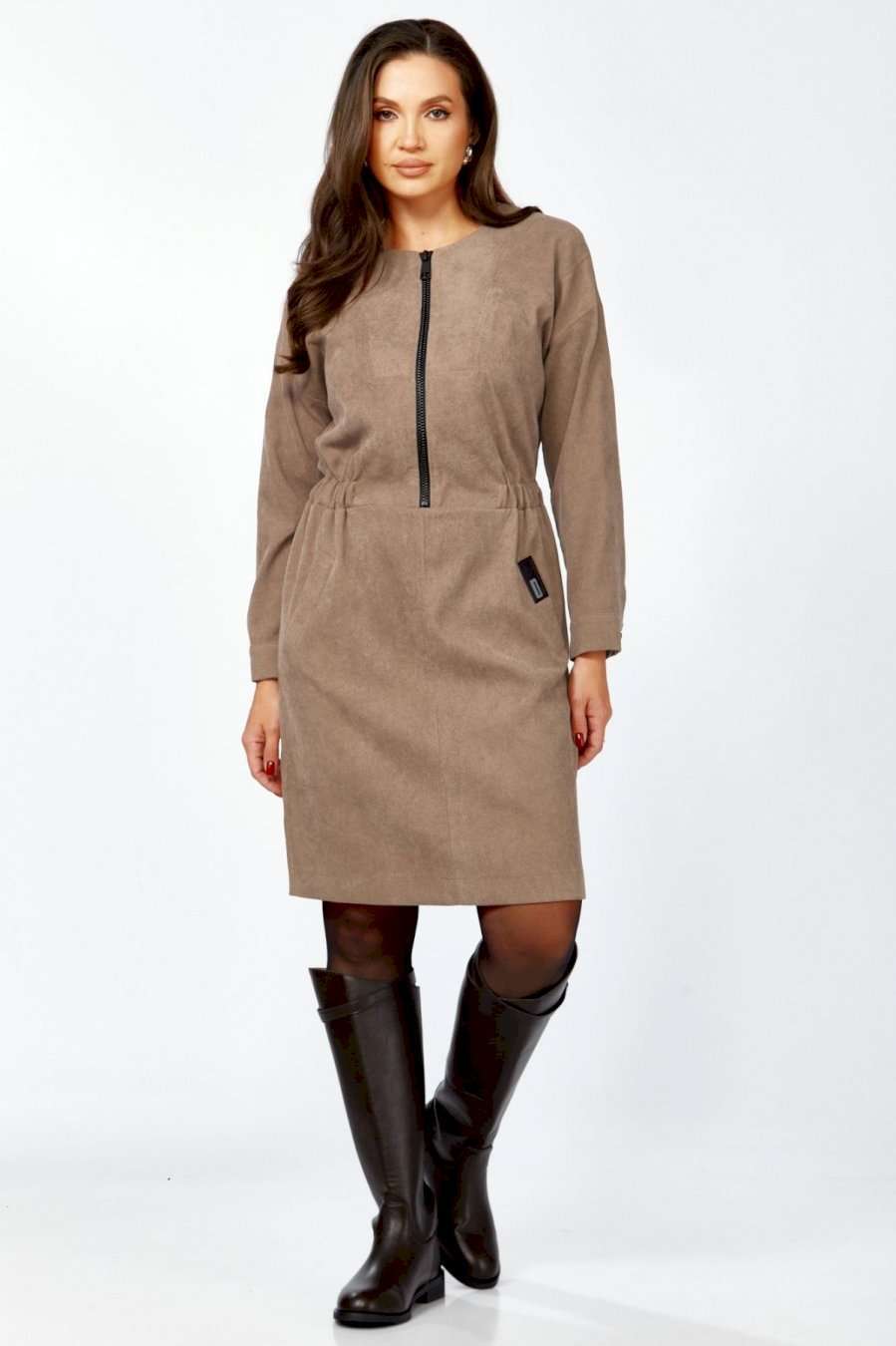 Платье полуприлегающего силуэта из мягкой, комфортной штруксовой ткани. Рукав спущенный, длинный, на манжете с застёжкой на 1 петлю и 1 пуговицу, разрезом. Горловина круглая, застёжка на тесьму-молнию контрастного цвета до талии. По талии подрез, по бокам спереди вставлена резинка, верхняя часть платья имитирует бомбер. Карманы- наклонные листочки, расположены на уровне бёдер по переднему полотнищу юбки, на левой листочке настрочена нашивка контрастного цвета. Перед платья с декоративными подрезами и отстрочкой. Спинка отрезная по талии, на резинке, со средним швом и разрезом по низу.