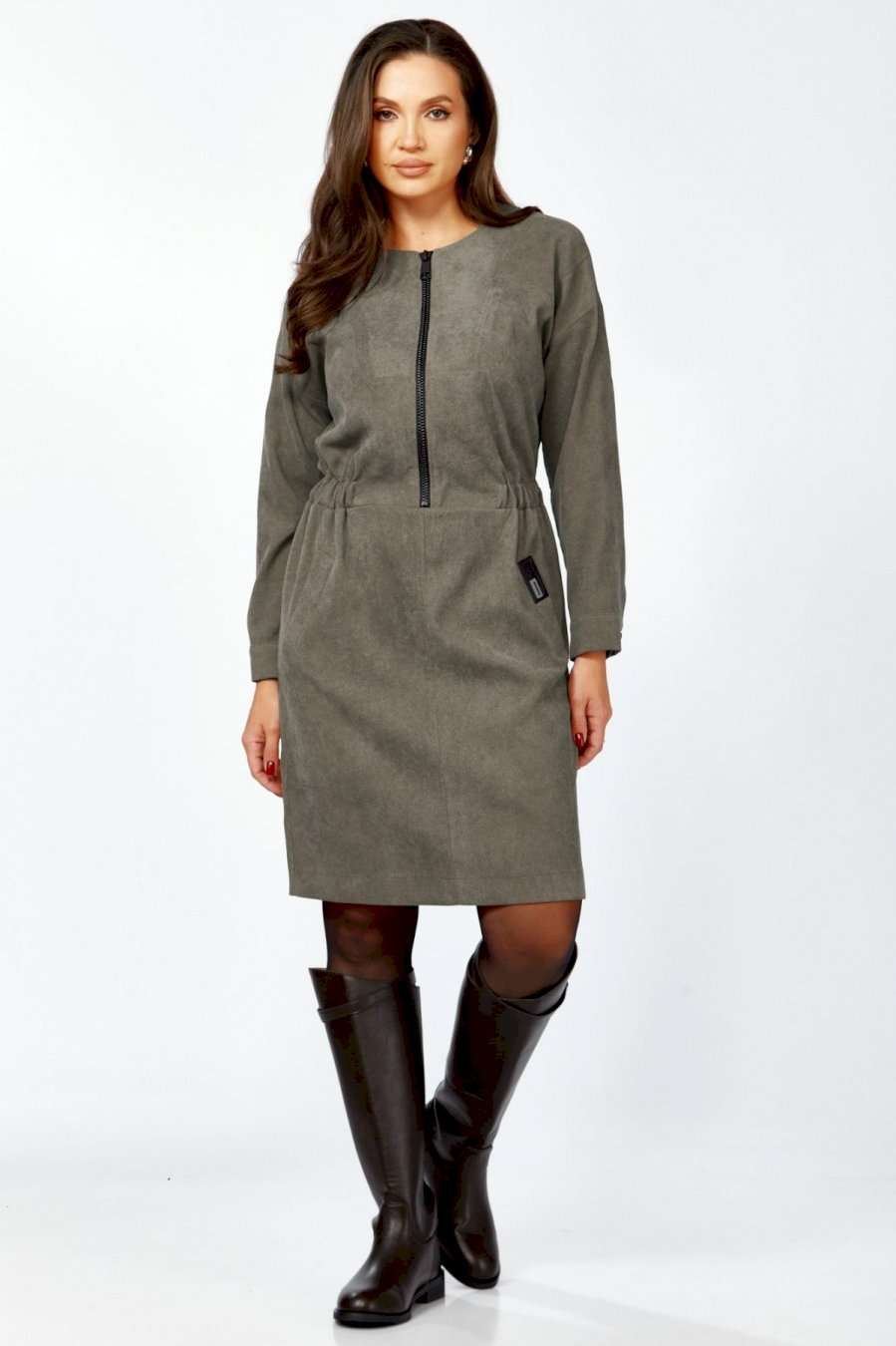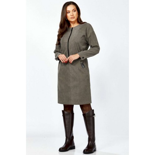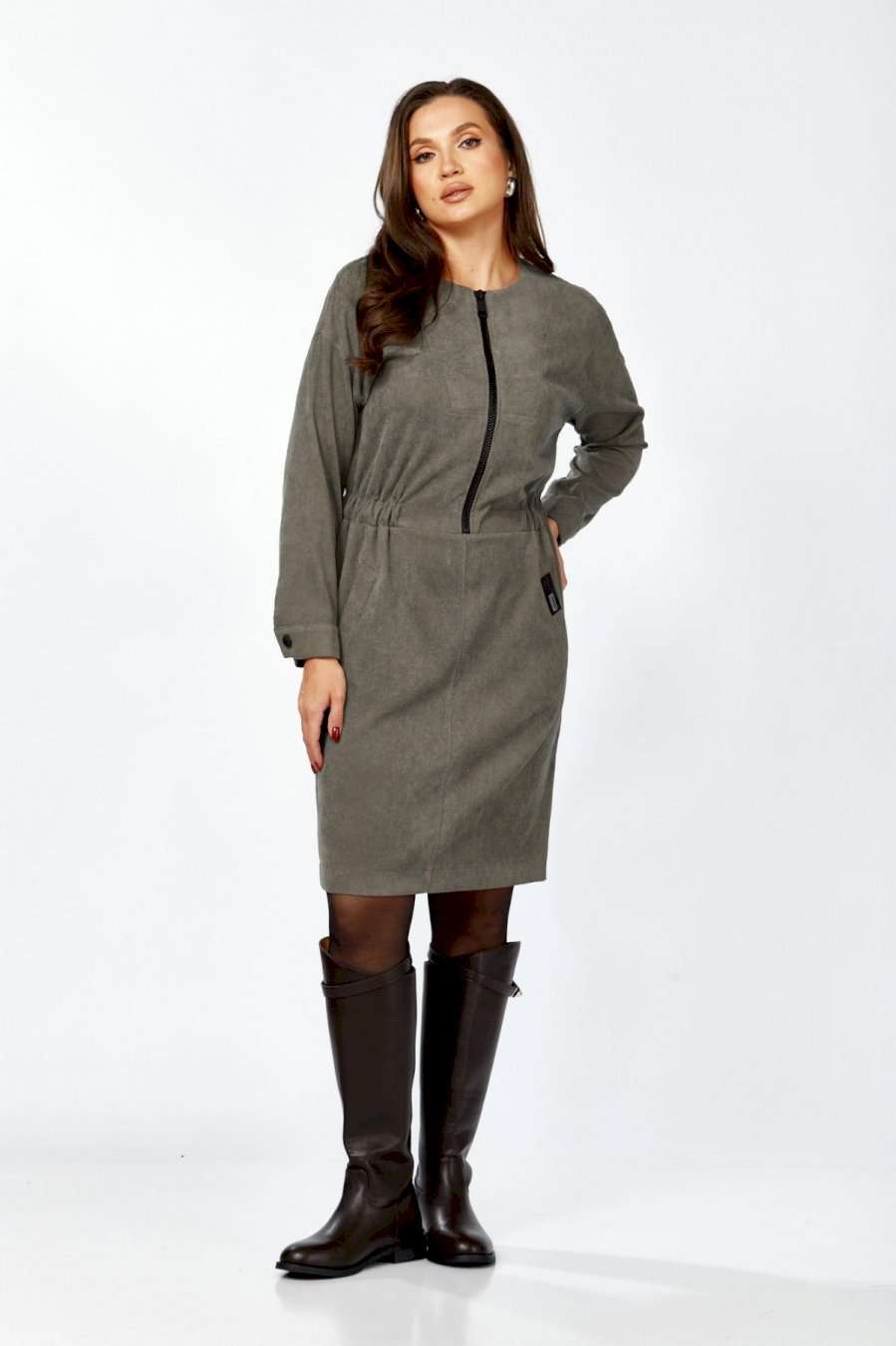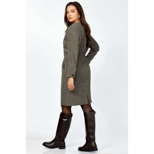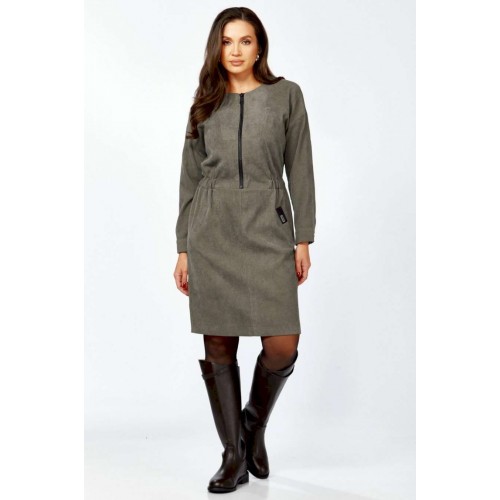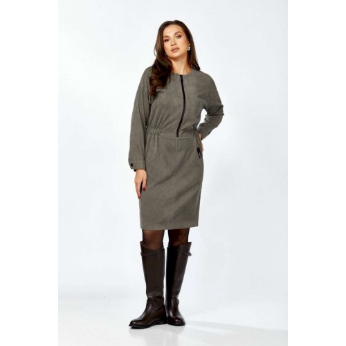 Платье полуприлегающего силуэта из мягкой, комфортной штруксовой ткани. Рукав спущенный, длинный, на манжете с застёжкой на 1 петлю и 1 пуговицу, разрезом. Горловина круглая, застёжка на тесьму-молнию контрастного цвета до талии. По талии подрез, по бокам спереди вставлена резинка, верхняя часть платья имитирует бомбер. Карманы- наклонные листочки, расположены на уровне бёдер по переднему полотнищу юбки, на левой листочке настрочена нашивка контрастного цвета. Перед платья с декоративными подрезами и отстрочкой. Спинка отрезная по талии, на резинке, со средним швом и разрезом по низу.