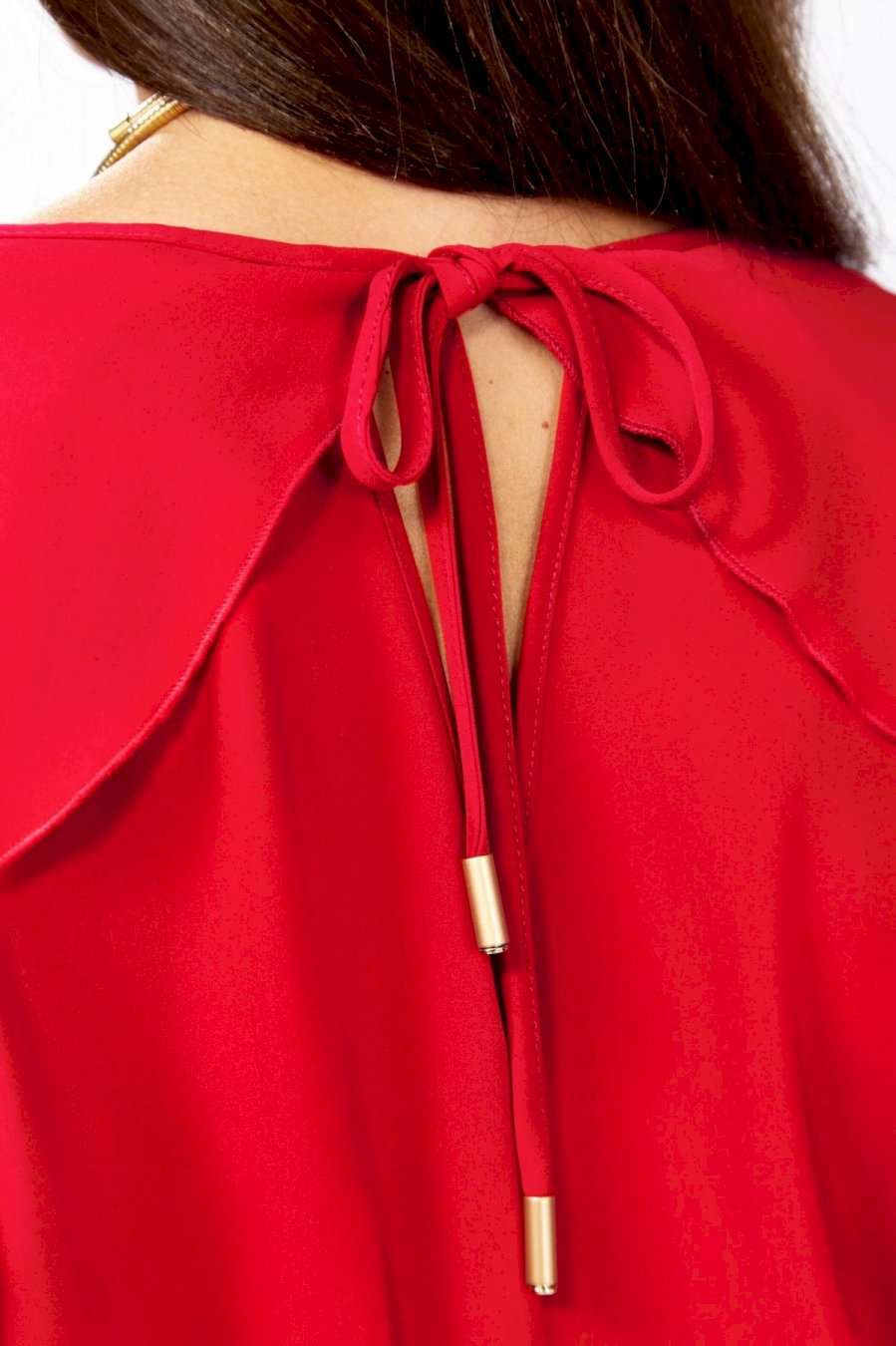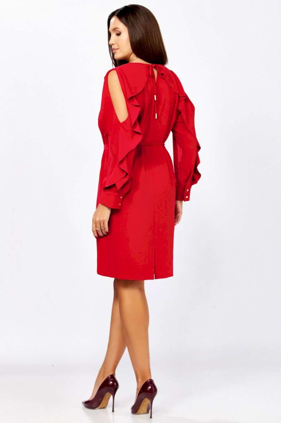 Романтичное платье прямого силуэта, без подкладки. Округлый вырез горловины обработан бейкой. Перед с нагрудной вытачкой. Рукав реглан с вырезом и двумя рюшами. Рукав с манжетой по низу. застегивается на 2 пуговицы и петли. Спинка со средним швом и вырезом «капелька» с завязками на концах с наконечниками. Имеется съемный пояс-завязки с кольцом и наконечниками на концах. Длина рукава от горловины- 69см, длина по синке-97см.