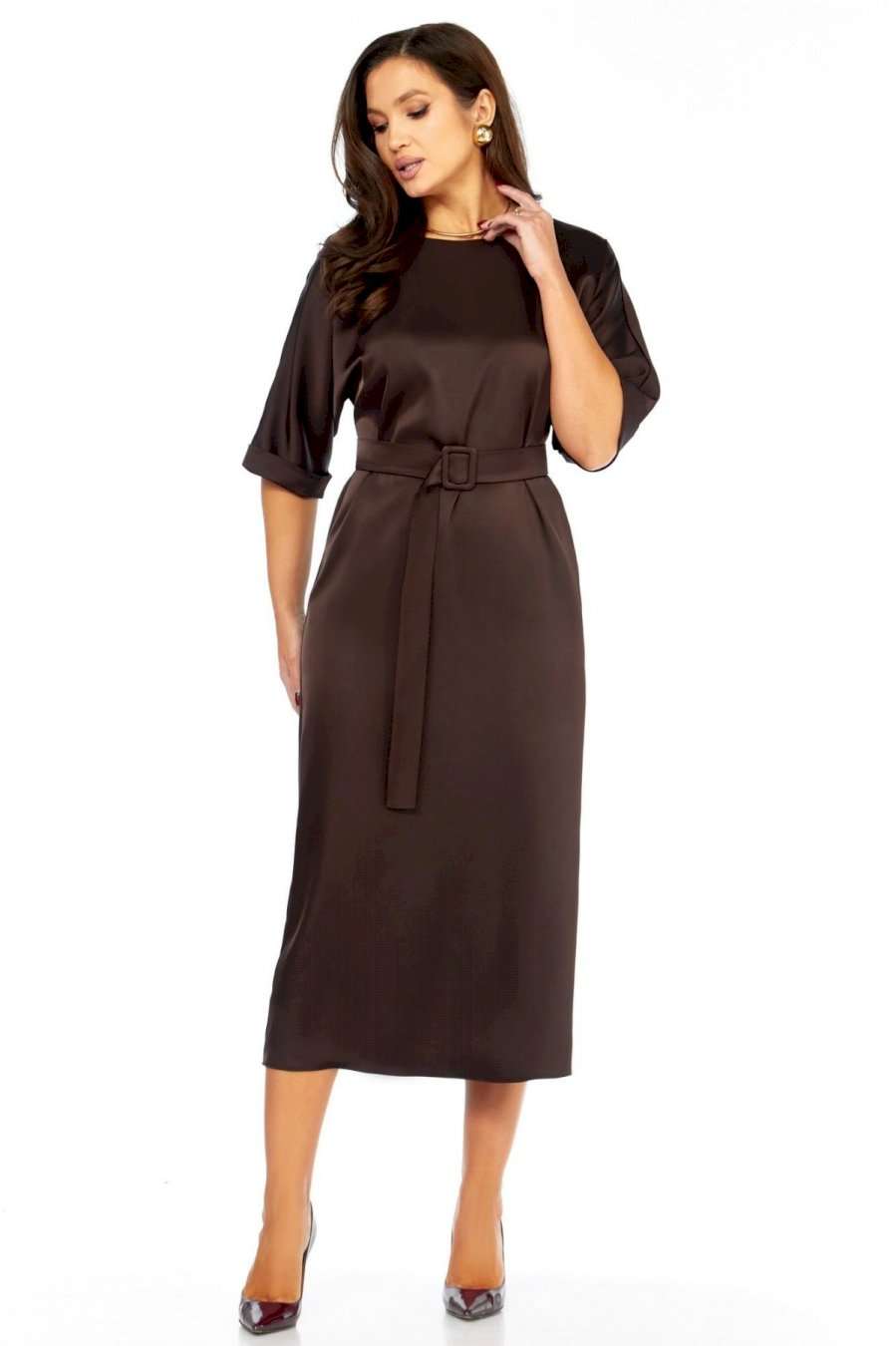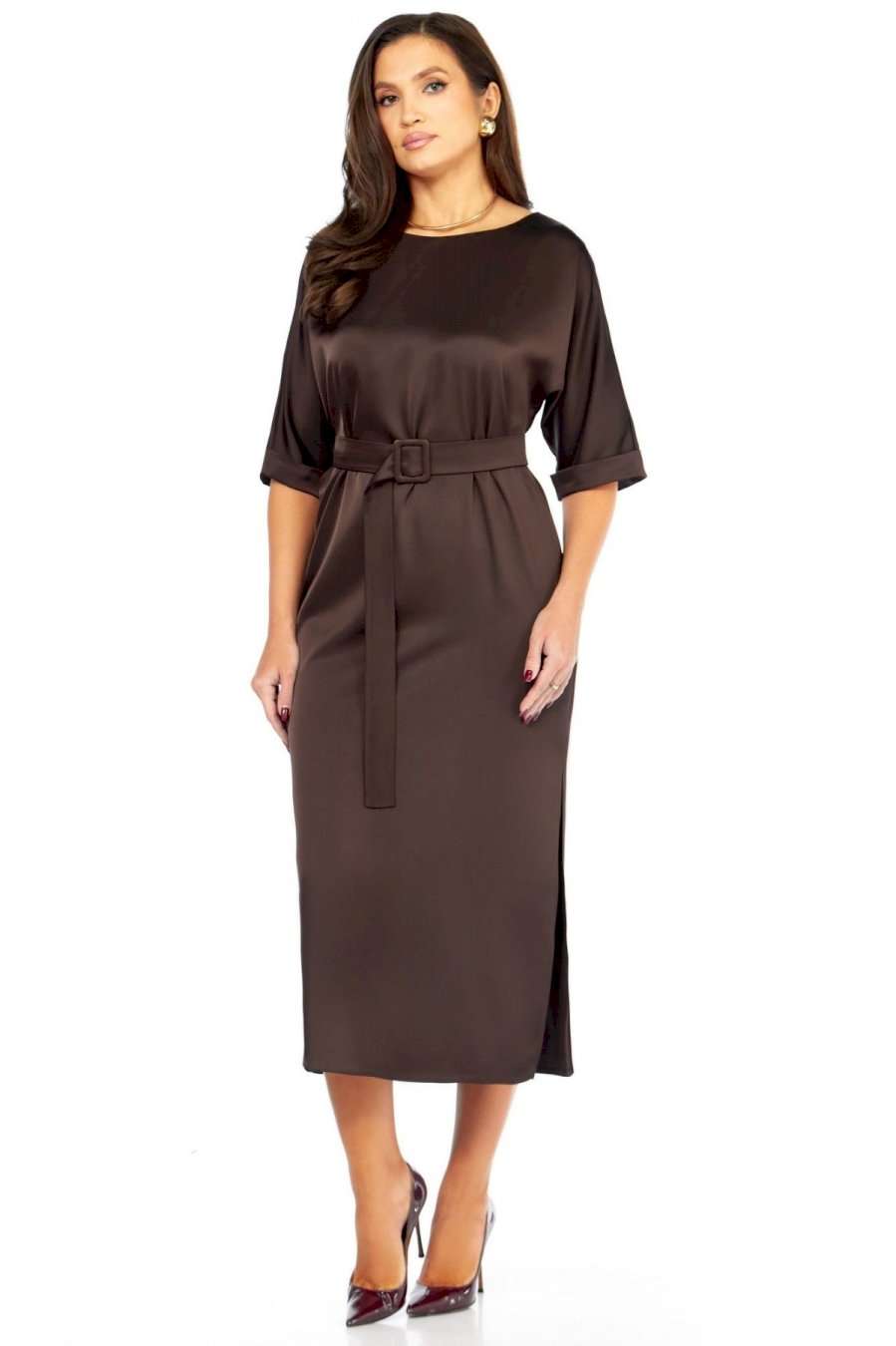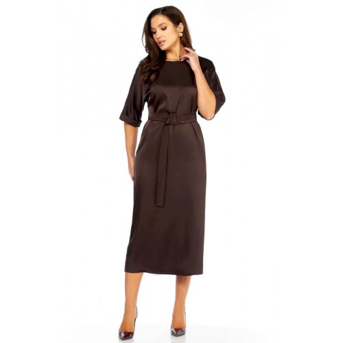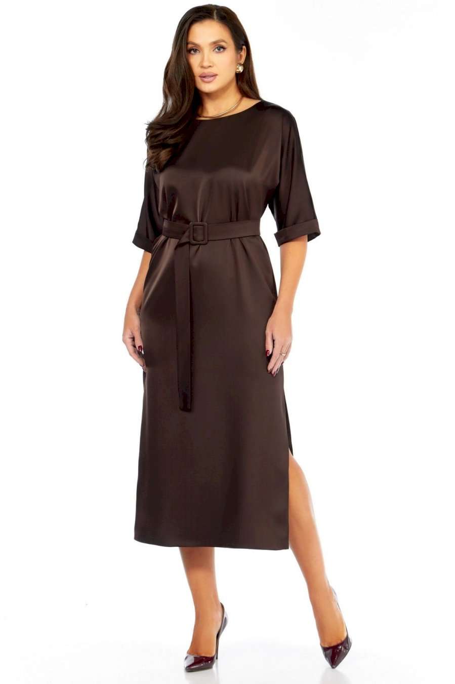 Платье прямого силуэта выполнено из атласа. Округлый вырез горловины. С левой стороны имеется разрез. Рукав цельнокроеный с отложной манжетой. Спинка со средним швом. Имеется съемный пояс. Длина по спинке-120 см, длина рукава –22 см.