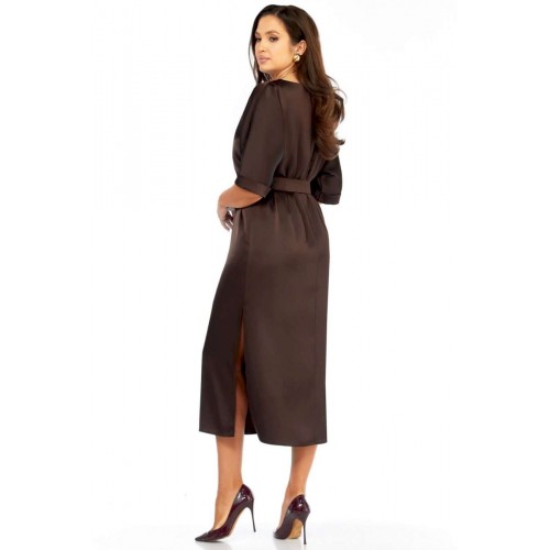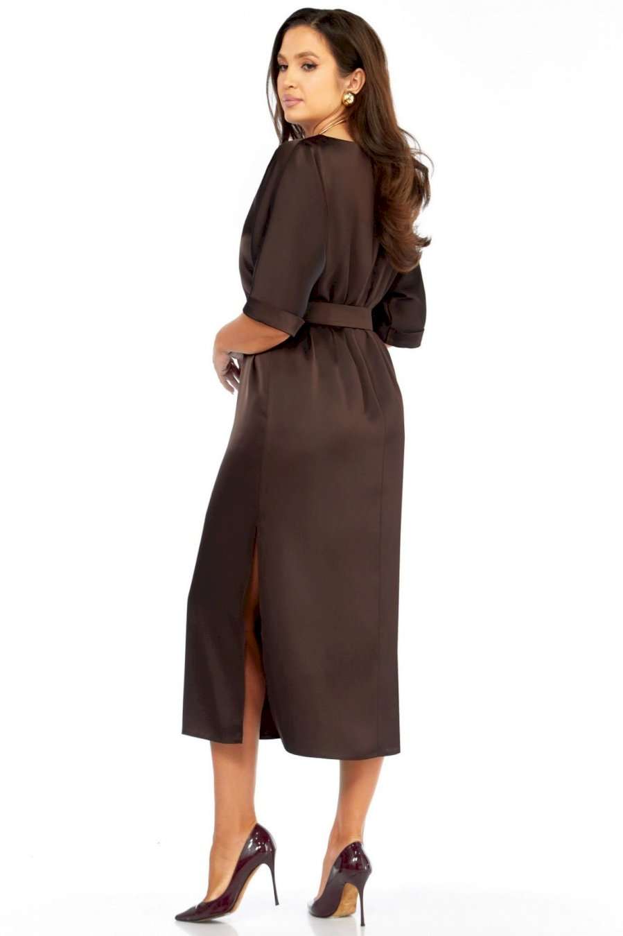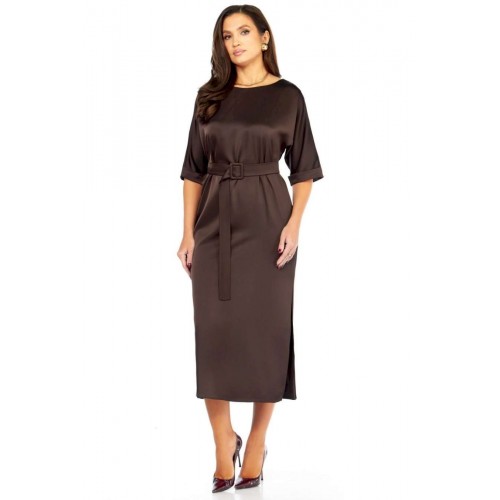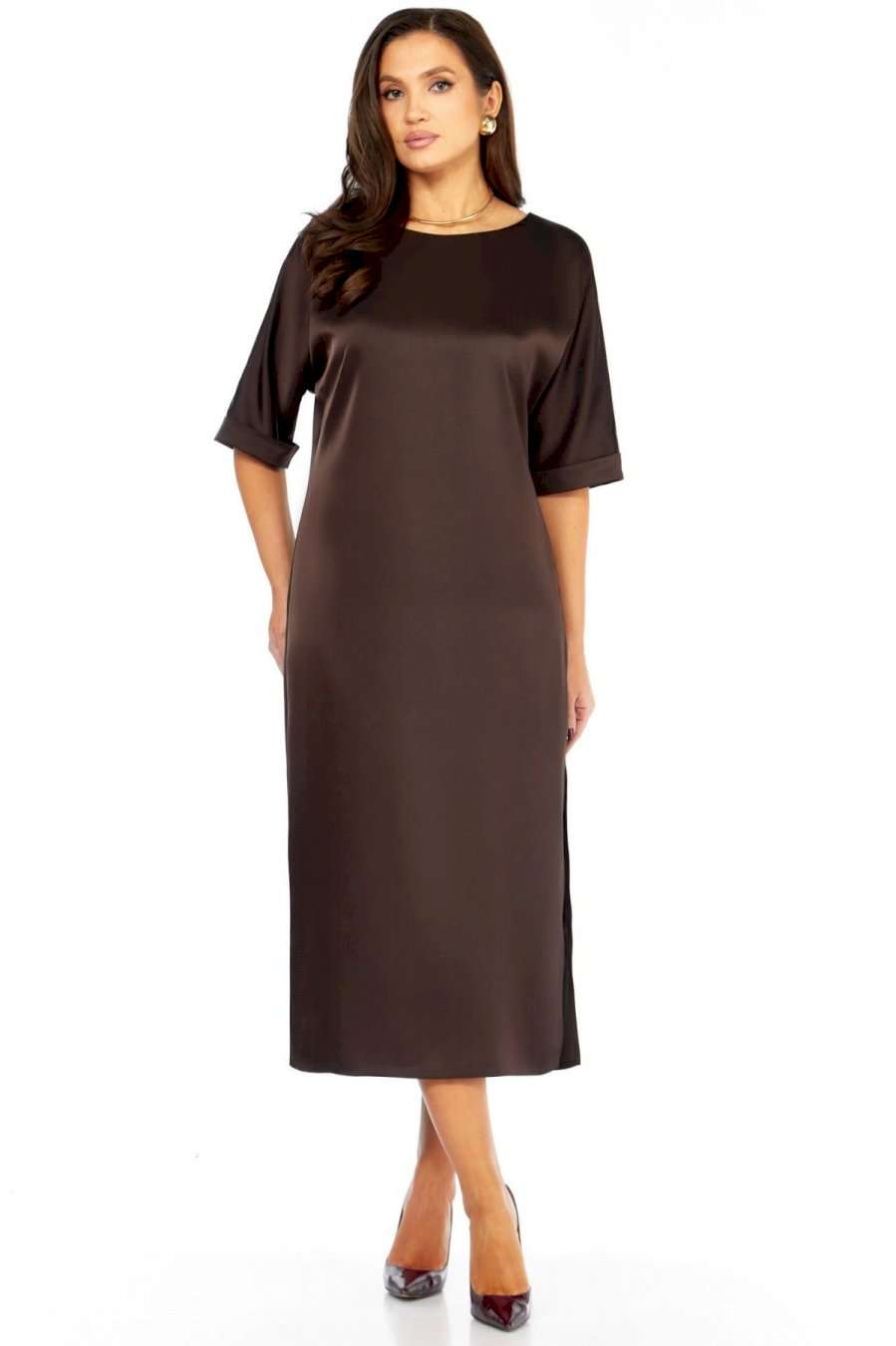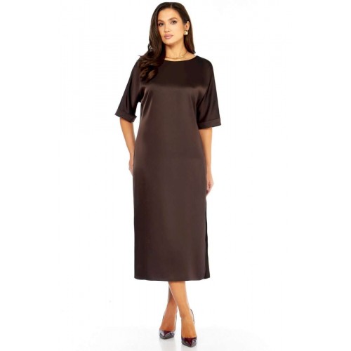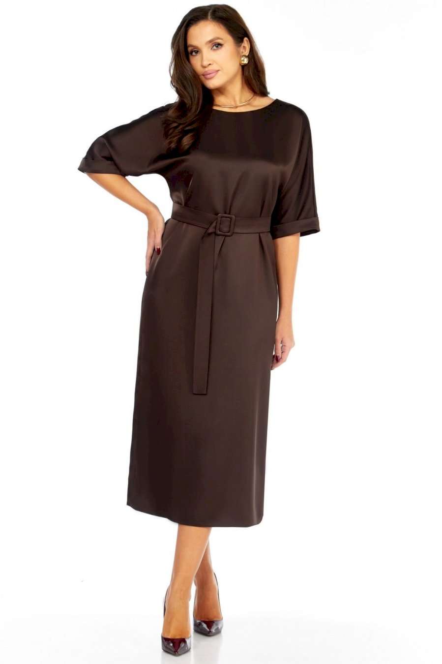 Платье прямого силуэта выполнено из атласа. Округлый вырез горловины. С левой стороны имеется разрез. Рукав цельнокроеный с отложной манжетой. Спинка со средним швом. Имеется съемный пояс. Длина по спинке-120 см, длина рукава –22 см.