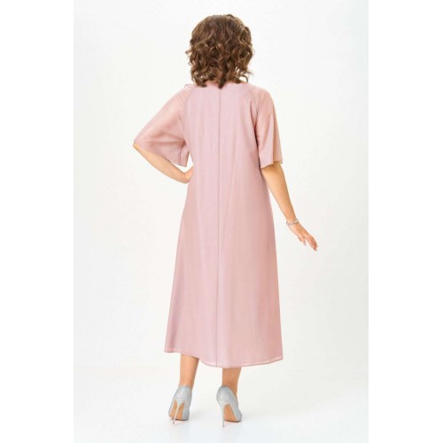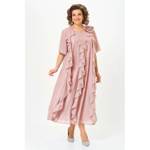Эффектное платье для обладательниц роскошных форм, свободного покроя, выполнено из шифона, на трикотажной подкладке. Горловина платья округлой формы, на обтачке, на переднем полотнище выполнены вертикальные подрезы с воланами. Спинка со средним швом, рукав покроя реглан, расклешенного покроя, по горловине декор в виде съемного цветка. Легкое, нарядное платье отличный вариант для любительниц комфортных и изящных нарядов!