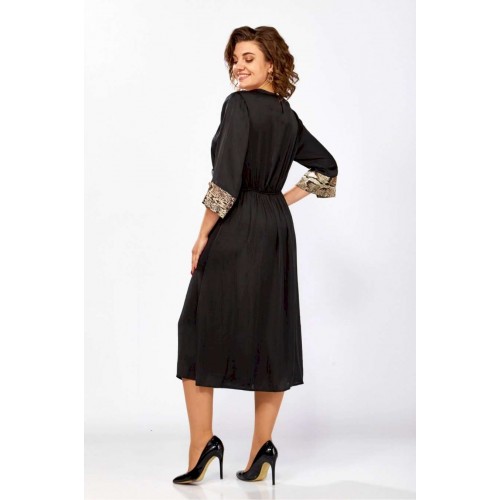 Женское платье, полуприлегающего силуэта, выполнено из легкой текстильной ткани, отделка из сетки с пайетками. Горловина округлой формы, на обтачке, по линии талии отрезное. Лиф с драпировкой по линии талии, по горловине декоративная обтачка из сетки с пайетками и бусинами. Юбка платья расклешенного силуэта, из основной ткани. Спинка также отрезная по линии талии, с резинкой, рукав втачной, оптимальной длины, по низу на манжете из сетки с пайетками. Эффектное платье на любой случай жизни! в 52р. Ширина груди- 55см, Ширина талии -43см резинка, Ширина бедер- 64см, длина рукава- 35см, ширина рукава -19,5см.