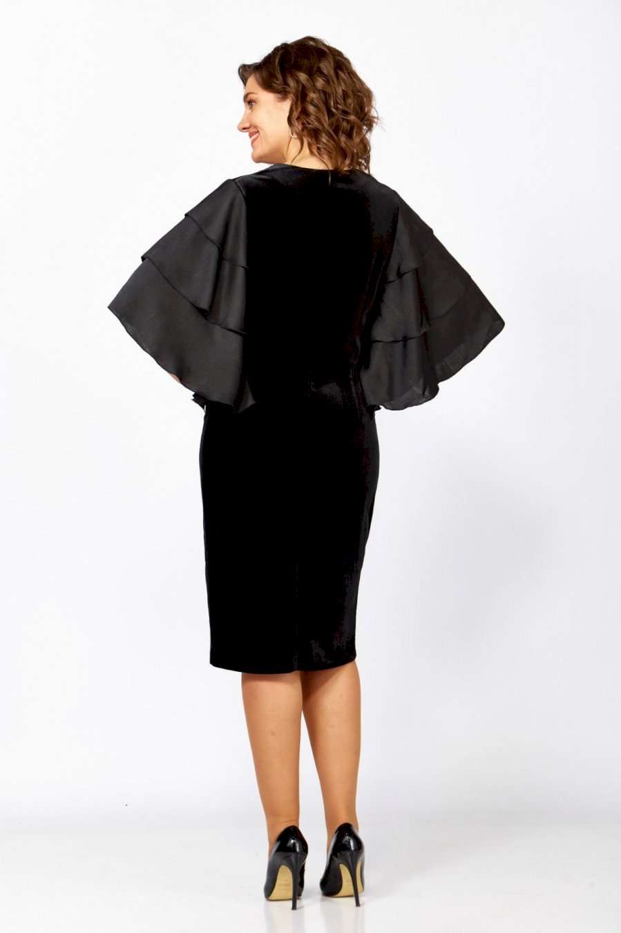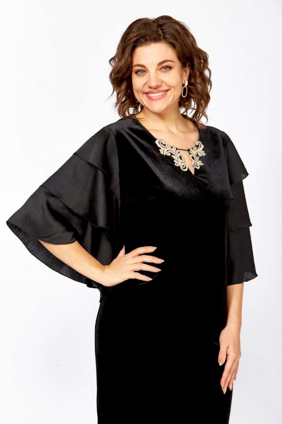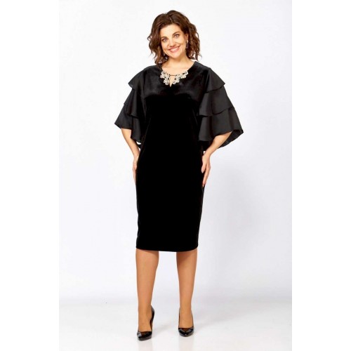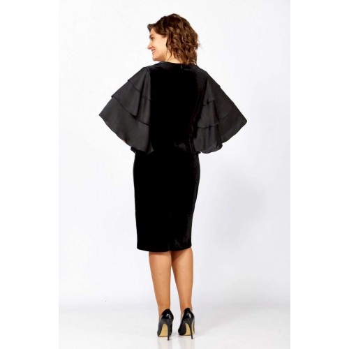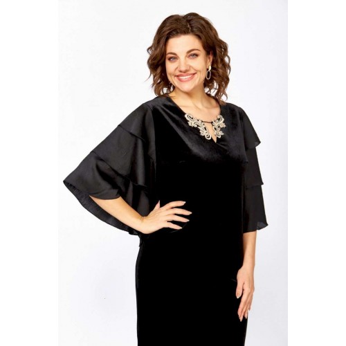 Женское платье полуприлегающего силуэта, выполнено из велюра и крэш-атласа. Горловина платья округлой формы, на обтачке, декорирована небольшим разрезом и украшена аппликацией и цепочкой. Спинка платья со средним швом и вытачками, выполнена из велюра. Рукав втачной, выполнен из крэш-атласа, состоит из расклешенных воланов в три яруса, что придает платью нарядности. Платье с эффектным кроем рукавов и элегантным декором отличный выбор для любого мероприятия! в 52р. Ширина груди- 52см, Ширина талии -50см, Ширина бедер- 56см, длина рукава- 35см.