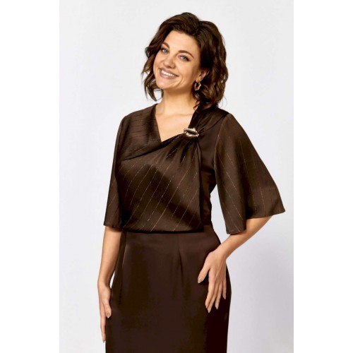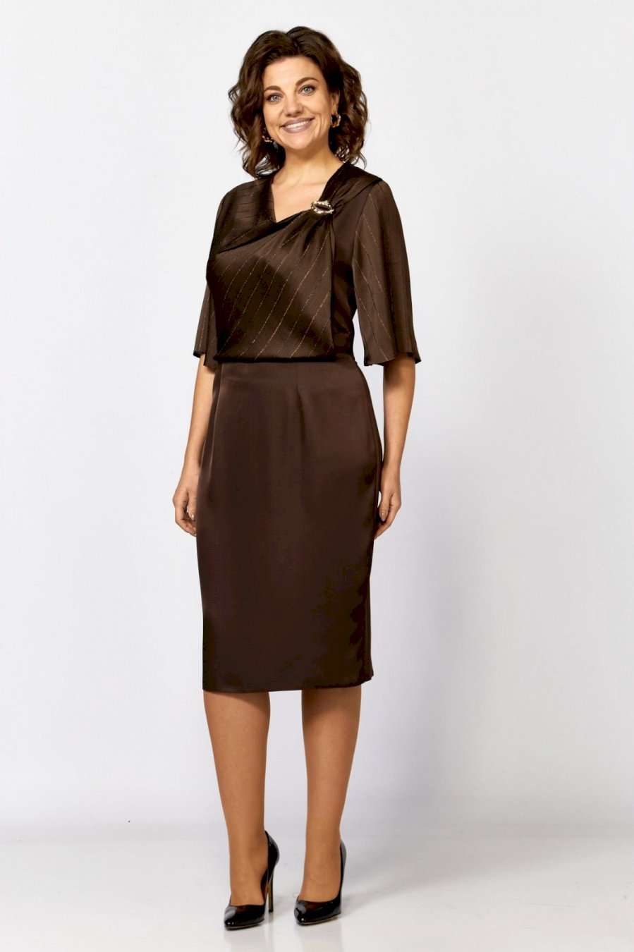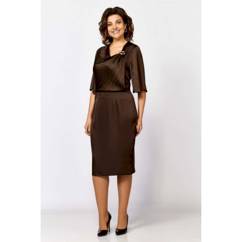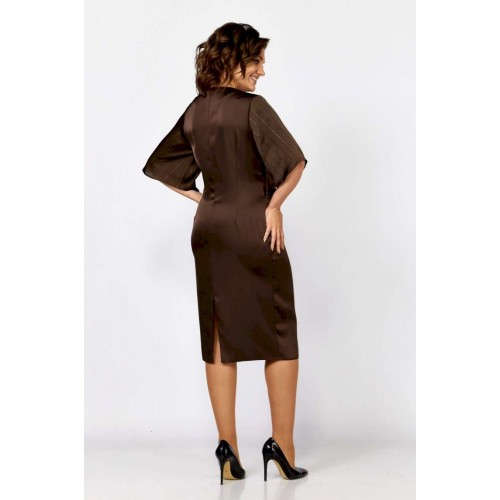 Женское платье полуприлегающего силуэта, выполнено из однотонного атласа и атласа в полоску. Лиф платья двойной и отрезной по линии талии, горловина нижнего слоя лифа округлой формы, второй слой лифа на полочке выполнен из атласа в полоску и по горловине задрапирован на эффектную пряжку. Юбка платья заужена к низу, с вытачками, выполнена из однотонного атласа. Спинка платья из однотонного атласа, со средним швом и вытачками, в среднем шве потайная молния, по низу разрез. Рукав укороченный, втачной, из атласа в полоску. Элегантное платье из приятной на ощупь ткани, с эффектным декором отличный выбор для любого мероприятия. в 52р. Ширина груди- 53см, Ширина талии -47см, Ширина бедер- 57см, длина рукава- 35см, ширина рукава 24см.