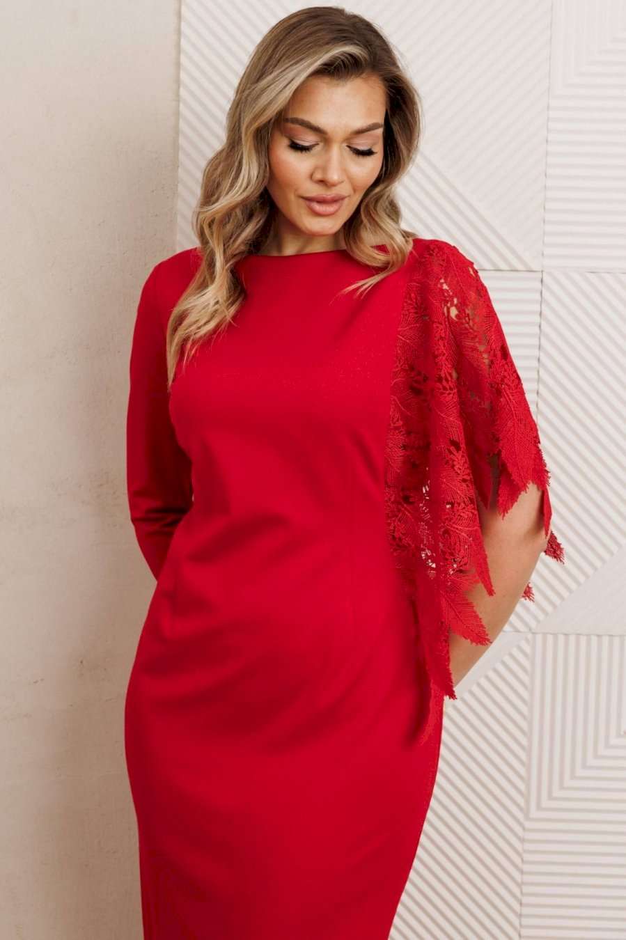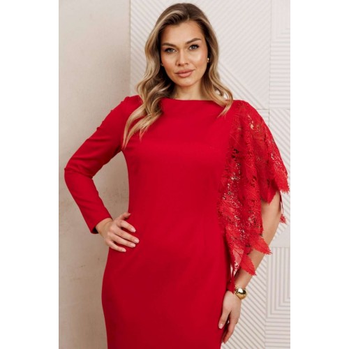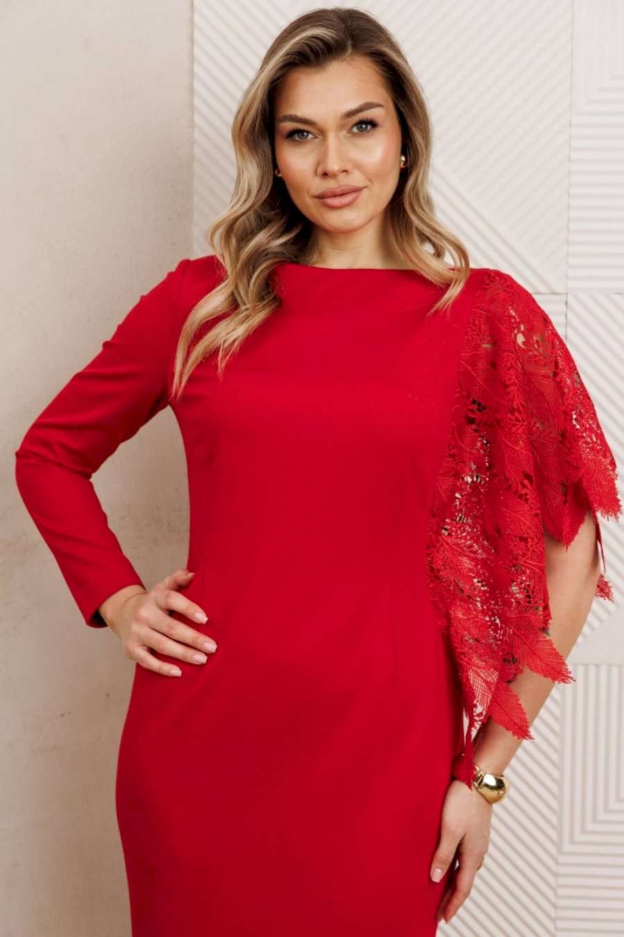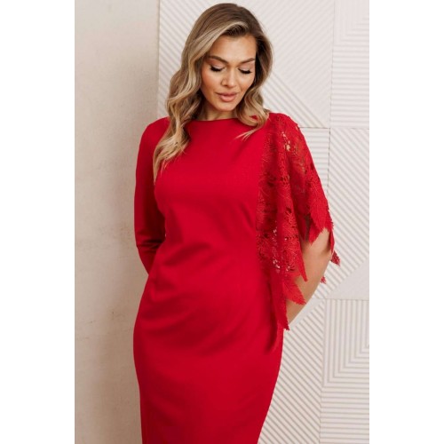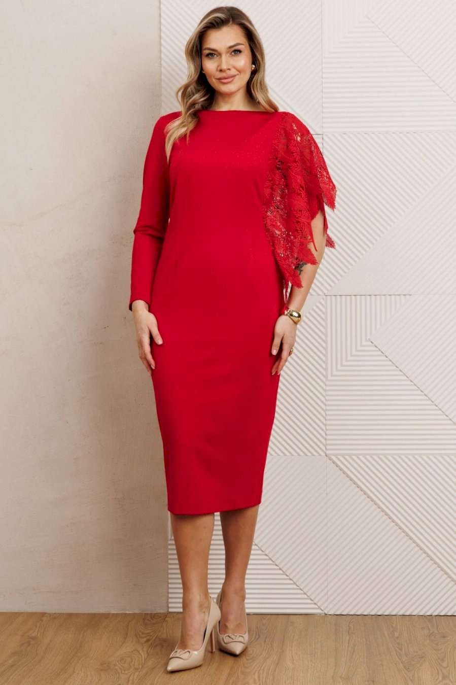 Платье женское приталенное из трикотажного полотна и гипюра, длиной ниже колена, нарядное. В левой части платья -фигурные рельефы, в которые вставлена фантазийная отлетная кокетка из гипюра, имитирующая рукав. В правой части -двухшовный длинный рукав. Вырез горловины спереди «лодочкой», сзади - v-образный. Платье приталено вытачками. В среднем шве спинки обработана шлица и потайная молния. Платье на подкладке. длина платья : 101 см длина рукава: 60 см