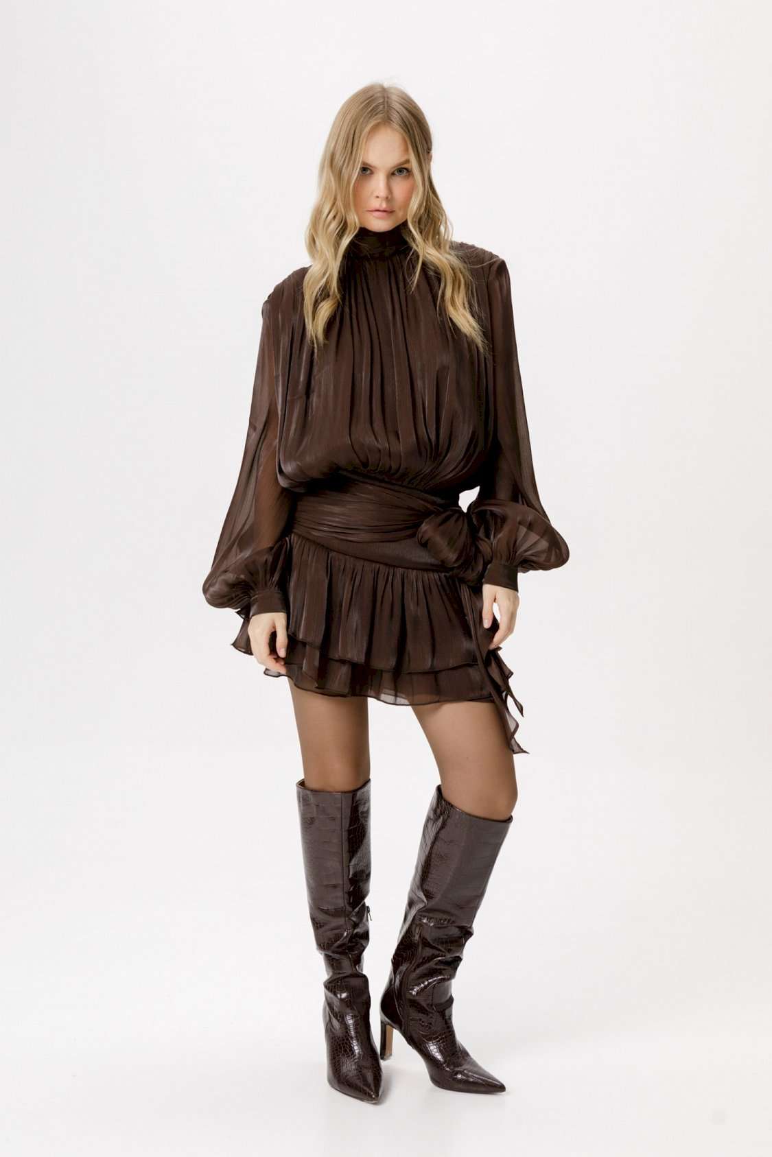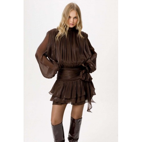 Платье-мини со съёмными шортами из фактурной полупрозрачной ткани. Детали: полуприлегающий силуэт, воротник-стойка со сборкой и застёжкой на навесные петли и пуговицы, юбка платья с воланами, настрочной пояс в боковом шве юбки, рукава втачные удлиненные с манжетами, платье застёгивается на потайную молнию в среднем шве спинки. Длина платья по спинке в размерах 40-46 около 88 см, длина рукава около 67 см