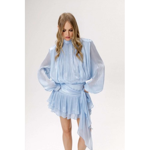 Платье-мини со съёмными шортами из фактурной полупрозрачной ткани. Детали: полуприлегающий силуэт, воротник-стойка со сборкой и застёжкой на навесные петли и пуговицы, юбка платья с воланами, настрочной пояс в боковом шве юбки, рукава втачные удлиненные с манжетами, платье застёгивается на потайную молнию в среднем шве спинки. Длина платья по спинке в размерах 40-46 около 88 см, длина рукава около 67 см