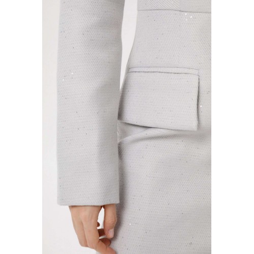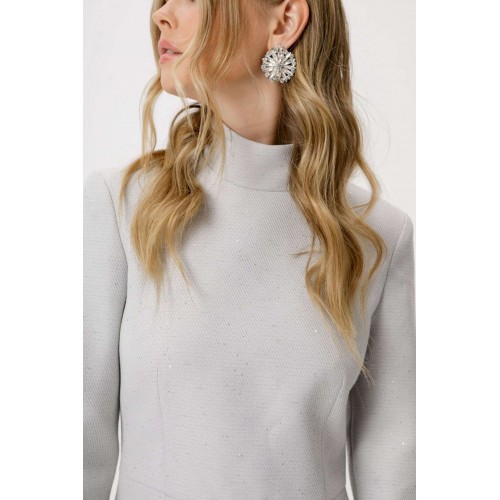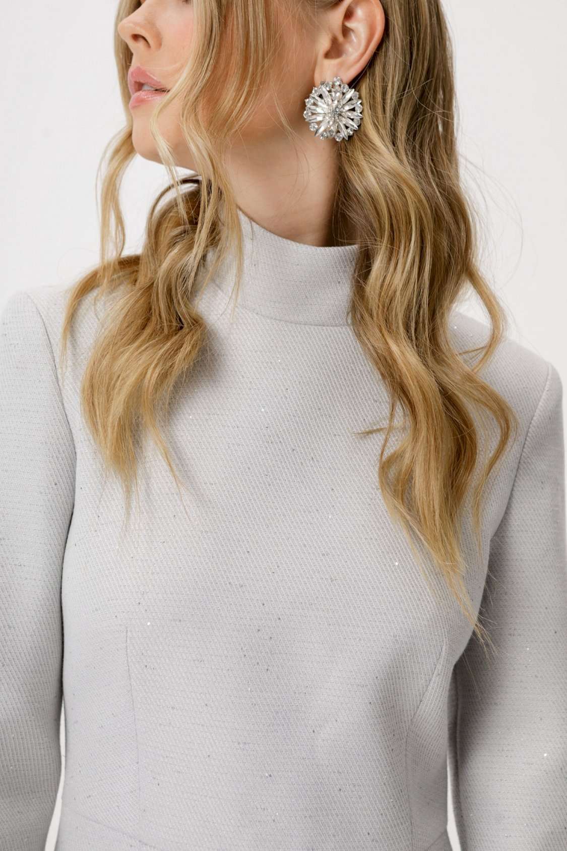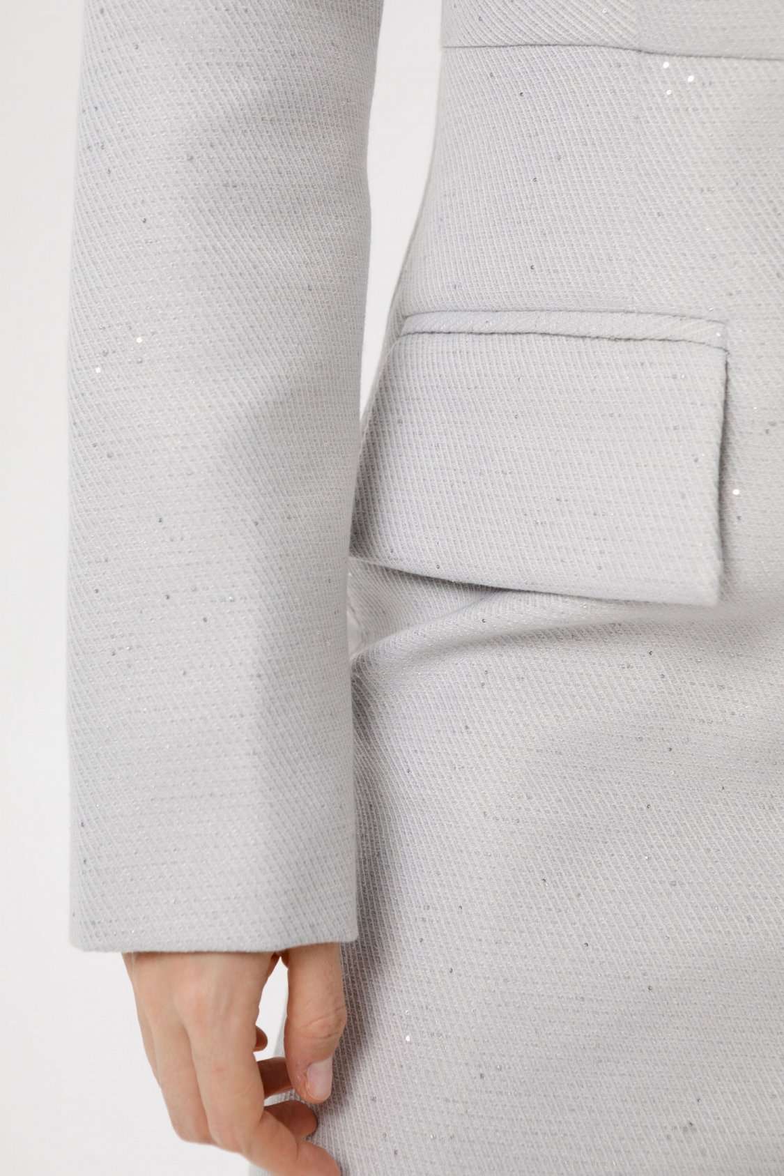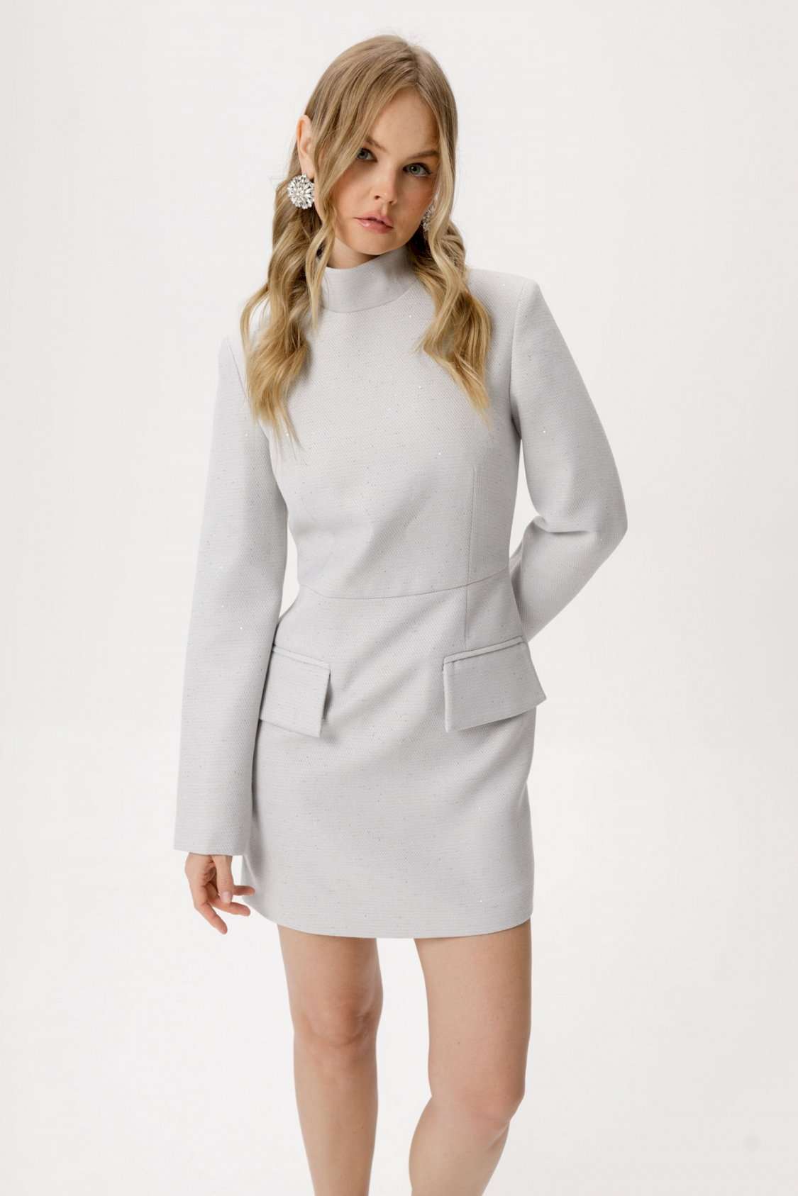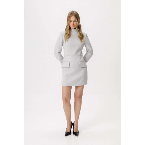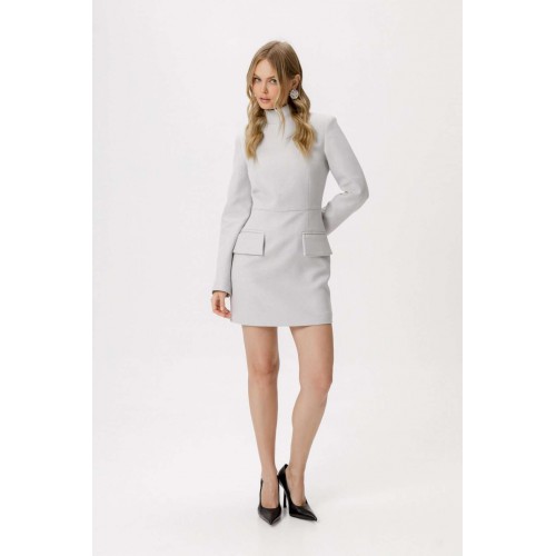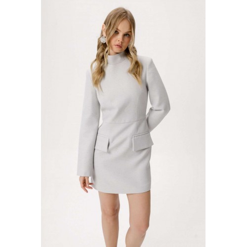 Текстильное платье длины мини. Детали: полуприлегающий силуэт, отрезное по линии талии, перед с талиевыми вытачками, функциональные карманы с фигурными клапанами, спинка со средним швом и талиевыми вытачками, втачные одношовные рукава, воротник-стойка, застёжка на потайную молнию в среднем шве спинки, платье на подкладке. Длина платья по спинке в размерах 40-46 около 81 см, в размерах 48-52 около 85 см, длина рукава около 62 см