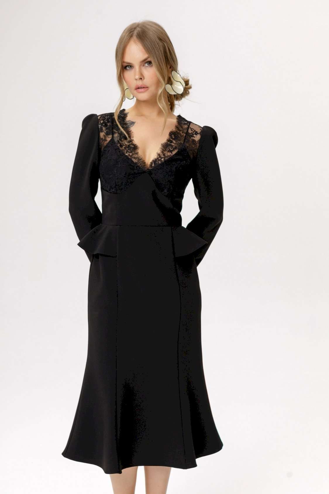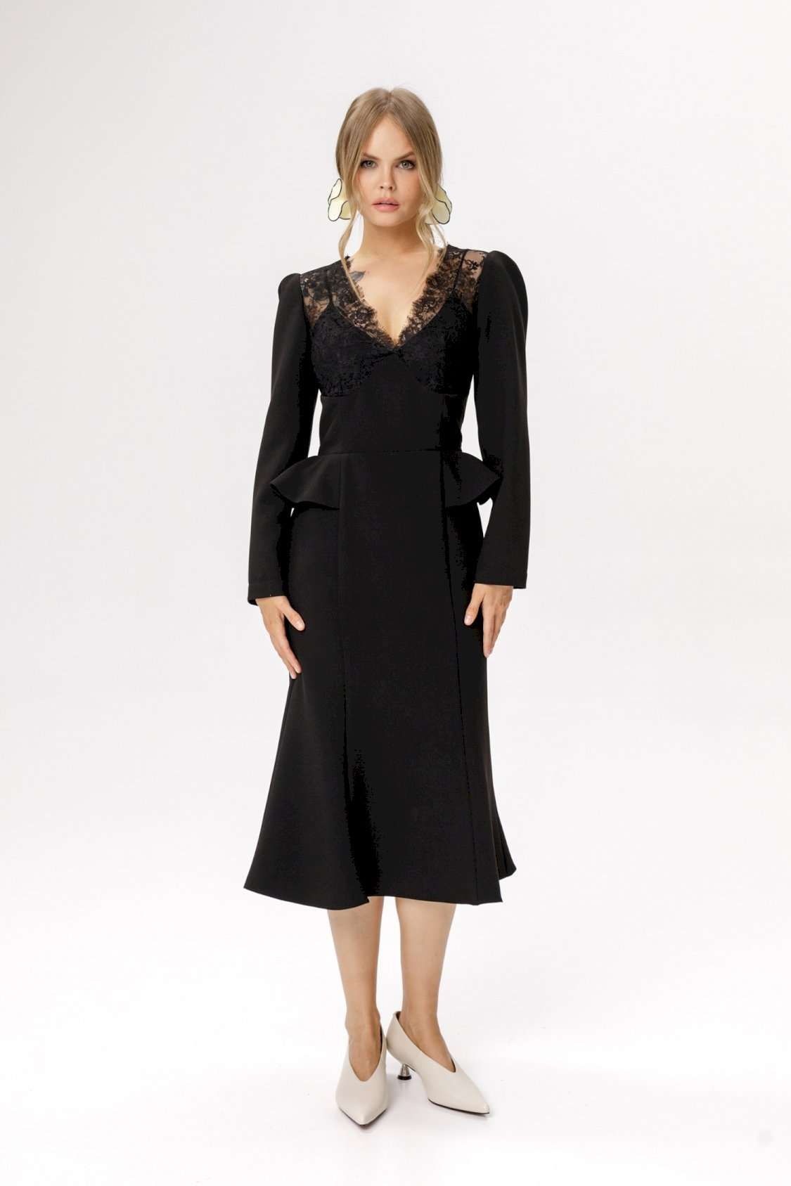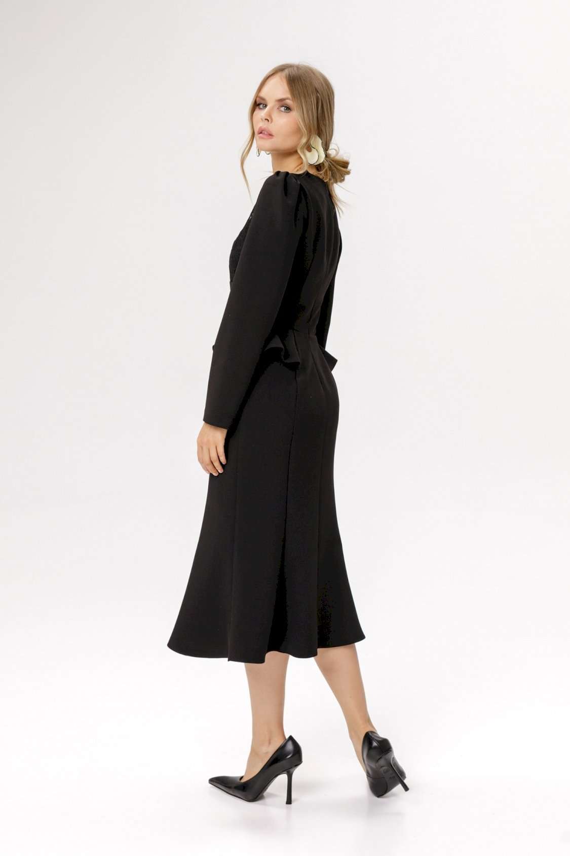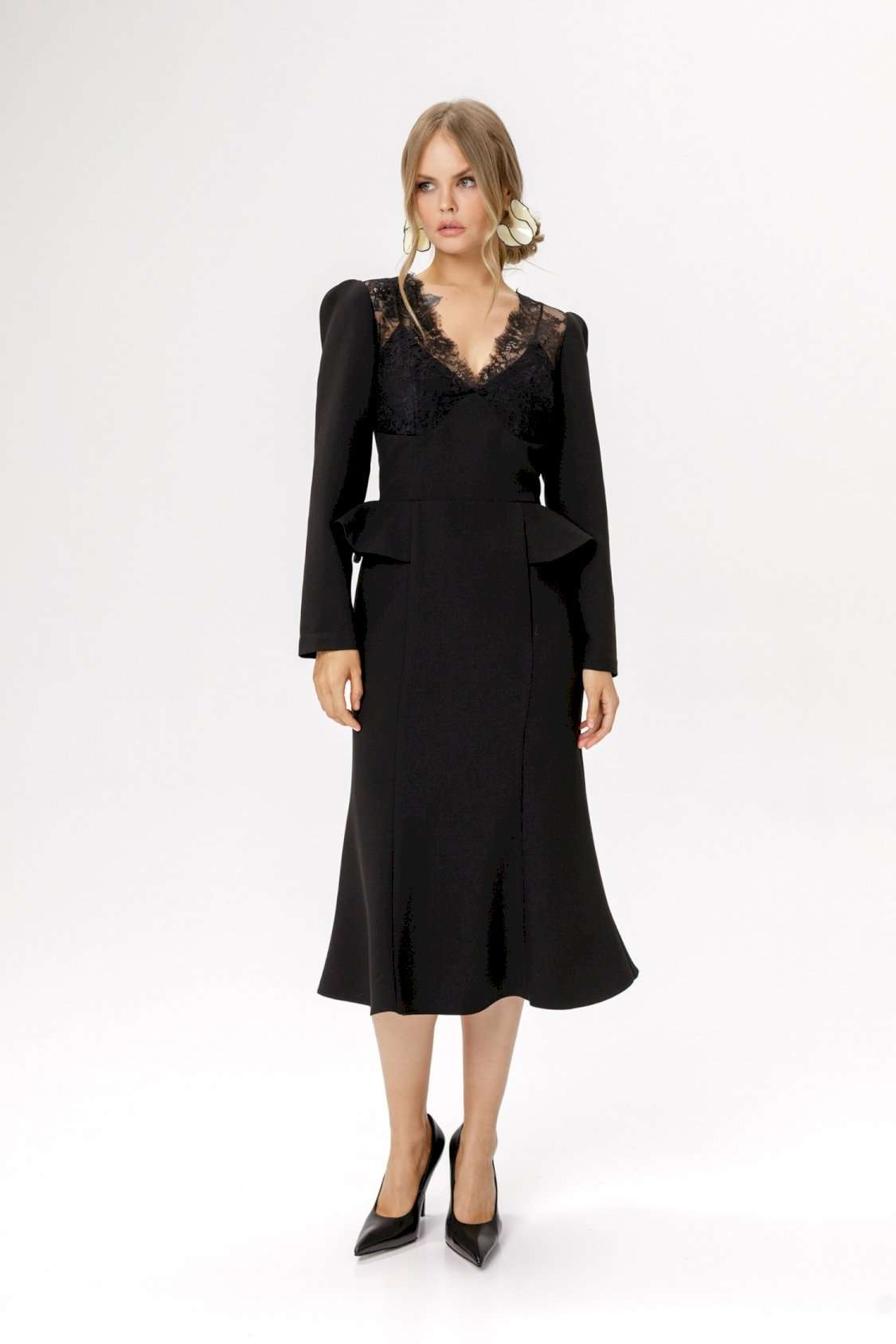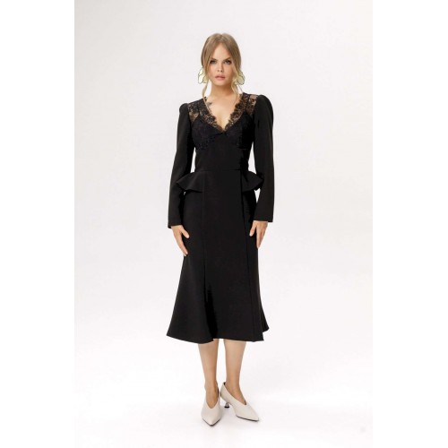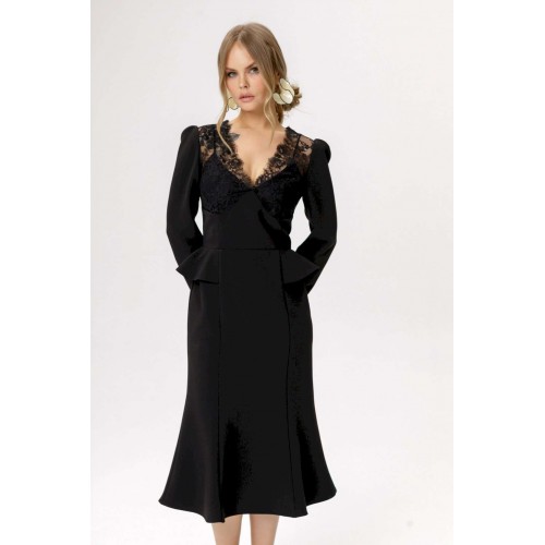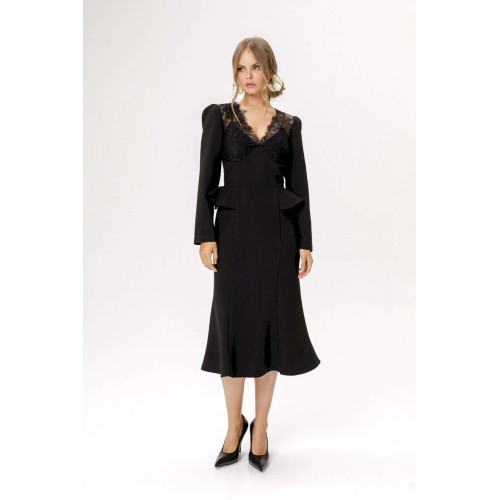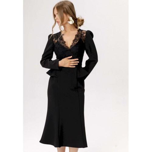 Приталенное платье с кружевным лифом и отлетными деталями по талии. Детали: прилегающий силуэт, фигурный лиф переда, отрезная линия талии, рельефные швы по юбке платья, потайная застежка по спинке, втачные длинные рукава со сборкой по окату, на подкладке. Длина по спинке около 111 см, длина рукава около 59 см
