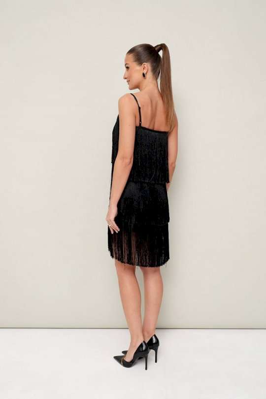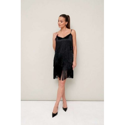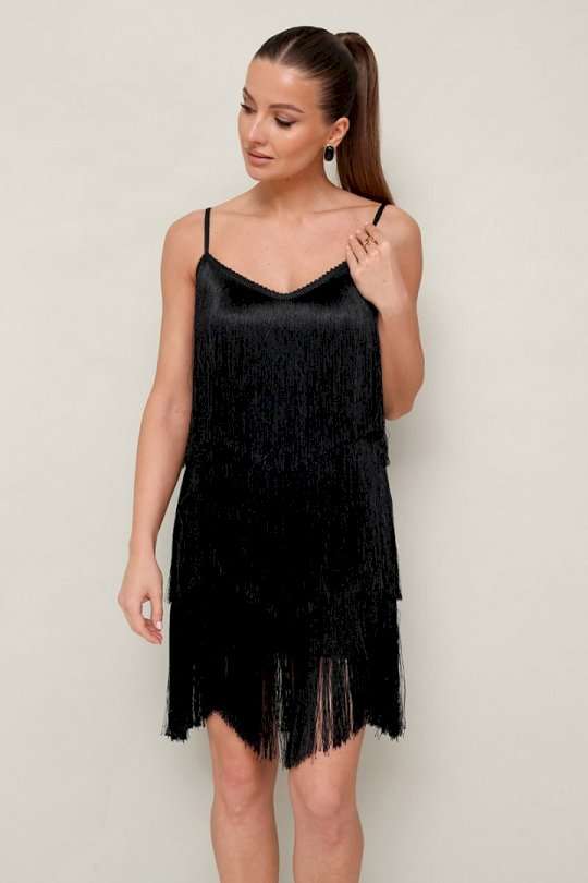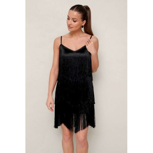 Нарядное платье, декорированное отделочной бахромой. Бахрома пришивная, ниточки не вылазят. Шлейки регулируются по длине.