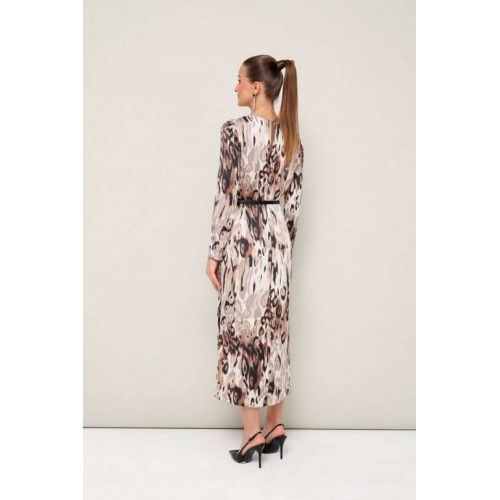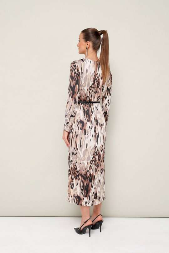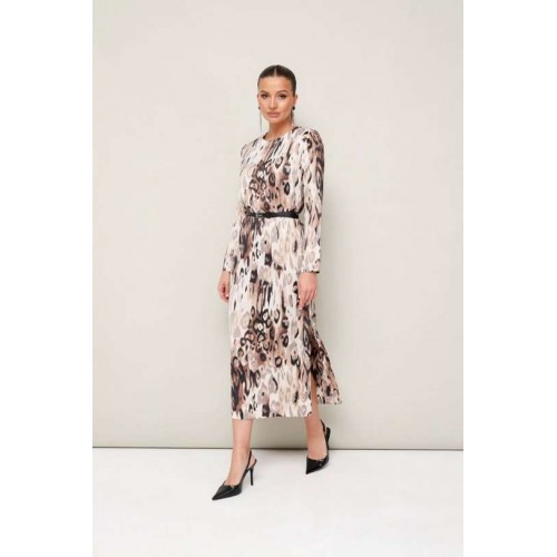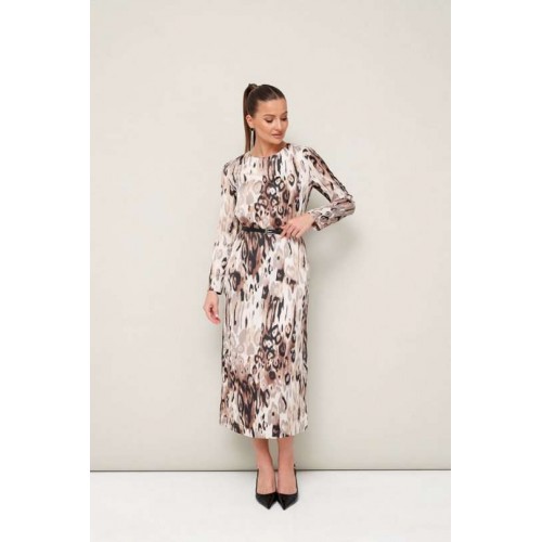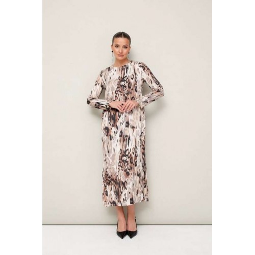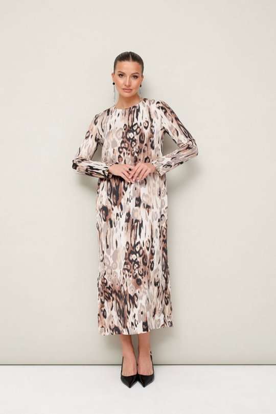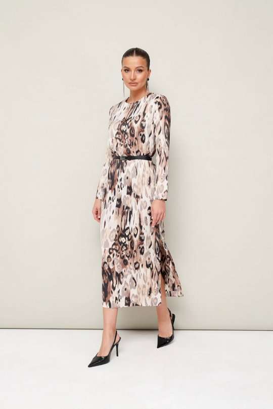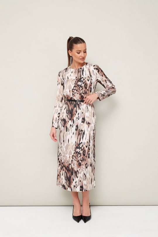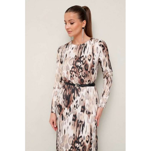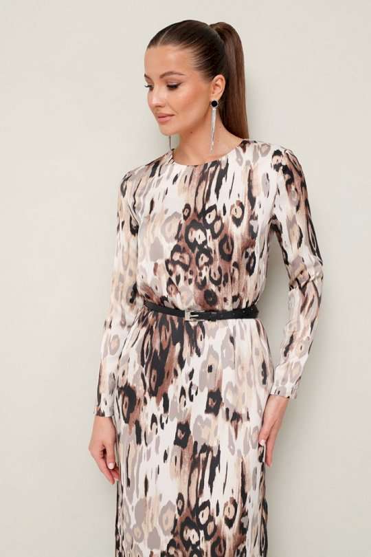 Платье прямого силуэта в длине миди, выполнено из струящейся ткани с благородным матовым блеском и актуальным анималистичным принтом. Округлый вырез горловины. Рукава длинные втачные. Застежка по спинке в среднем шве «капля» на пуговицу и навесную петлю. По низу в боковых швах обработаны высокие разрезы.