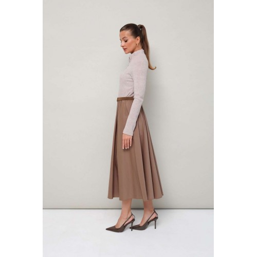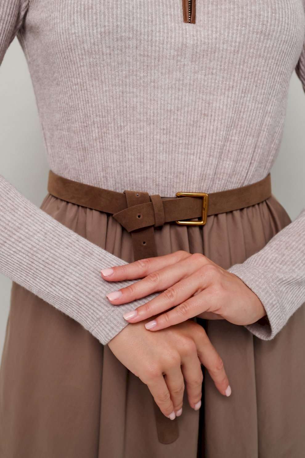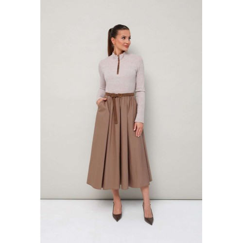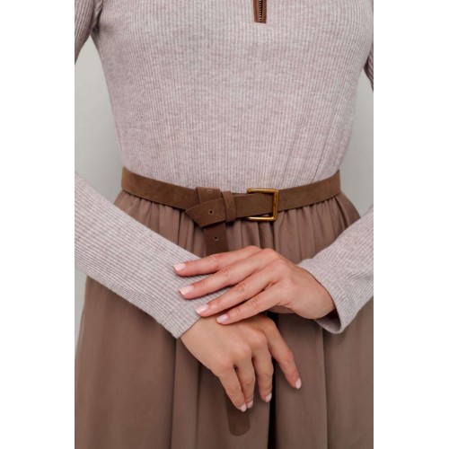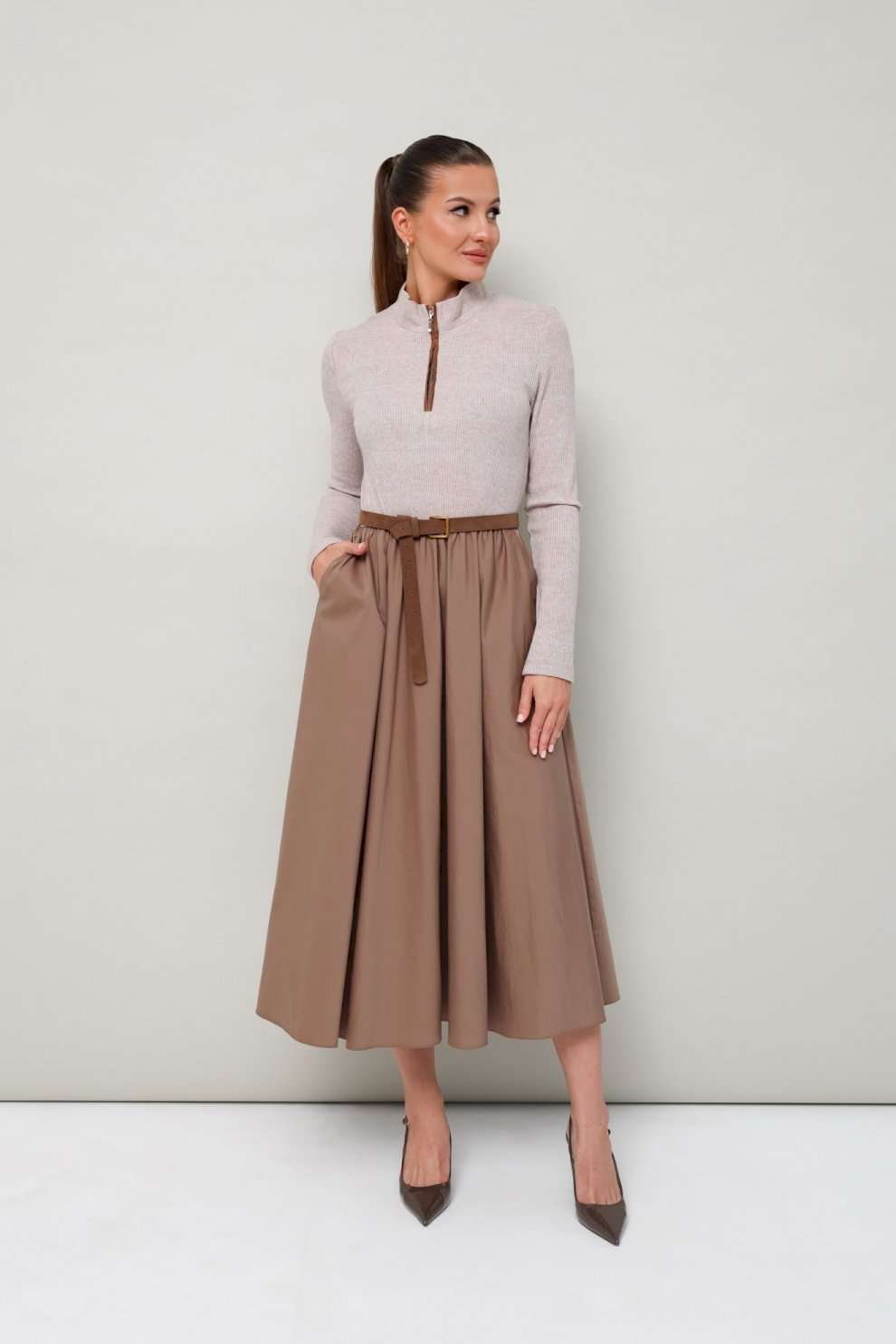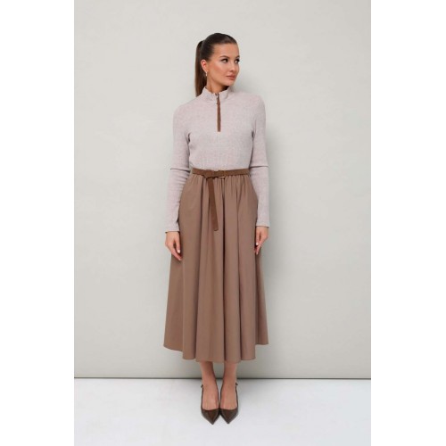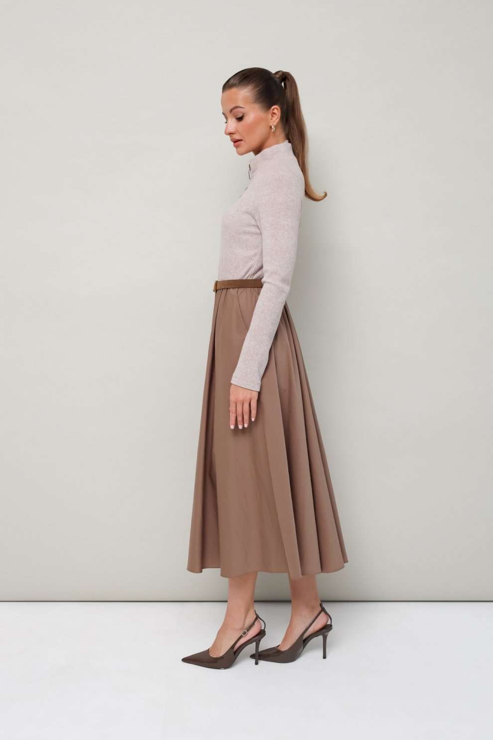 Платье отрезное по линии талии в длине миди. Лиф прилегающего силуэта, выполнен из трикотажного полотна. Горловина с притачным воротником-стойкой. Застежка центральная на тесьму-молнию с притачными планками до линии груди. Рукава втачные длинные. Для комфорта и регуляции размера по талии обработана резинка. Юбка А-силуэта с боковыми наклонными карманами, выполнена из матовой тафты. В комплекте прилагается съемный ремень.