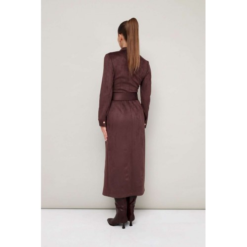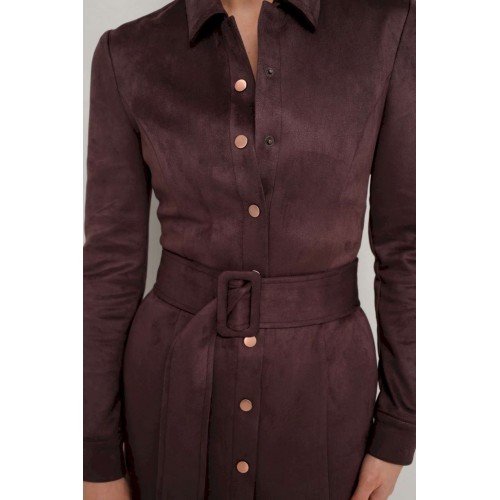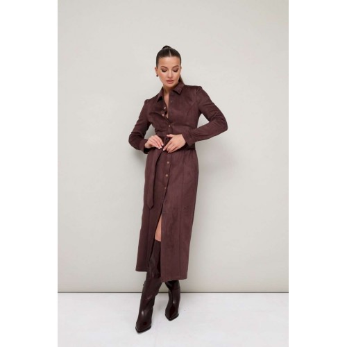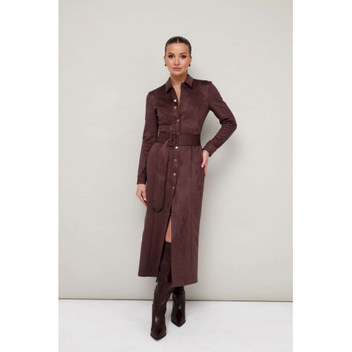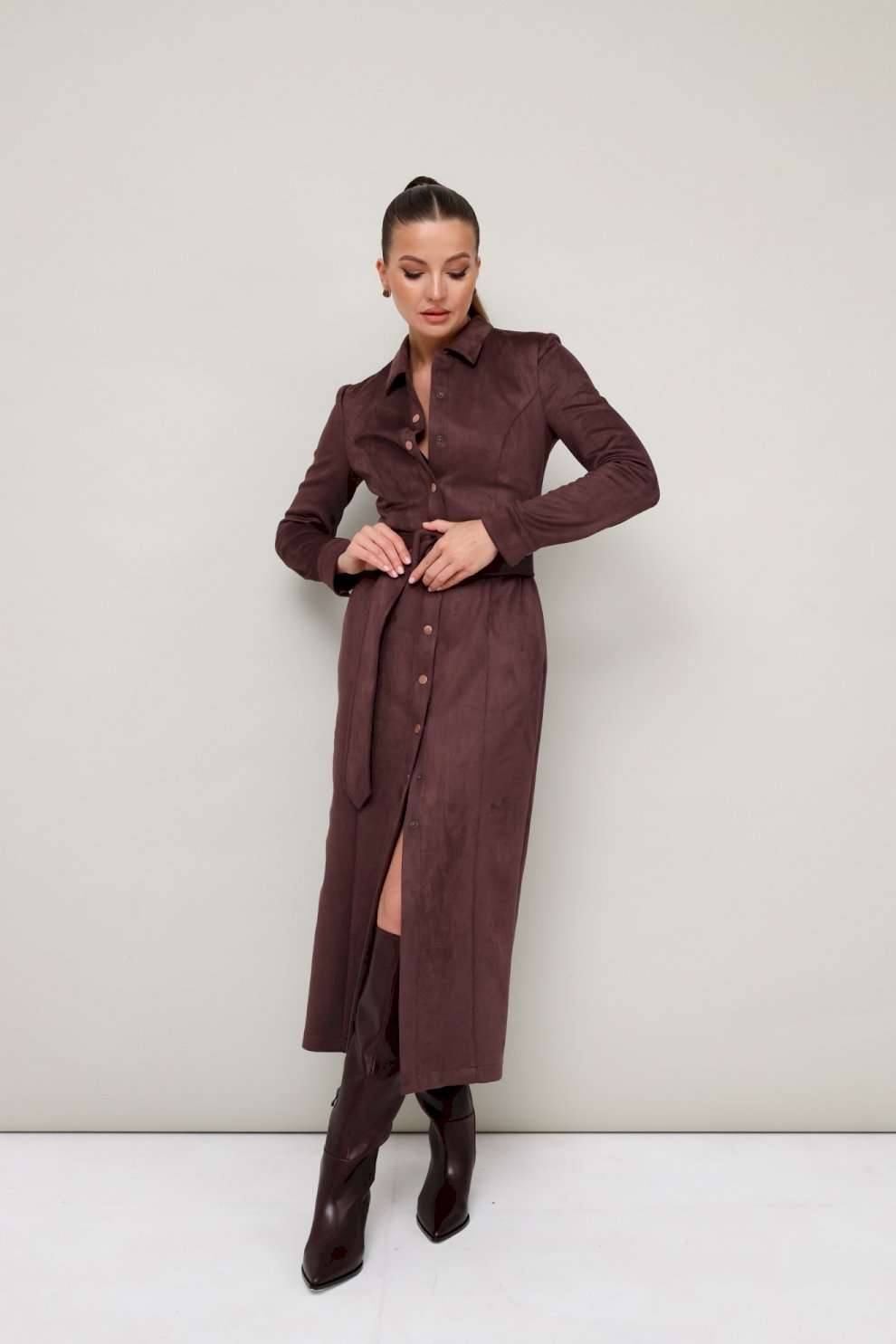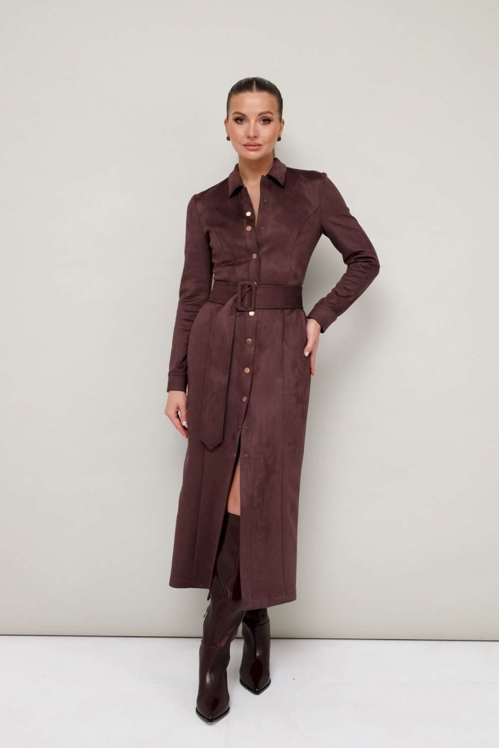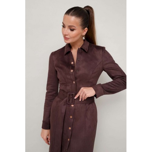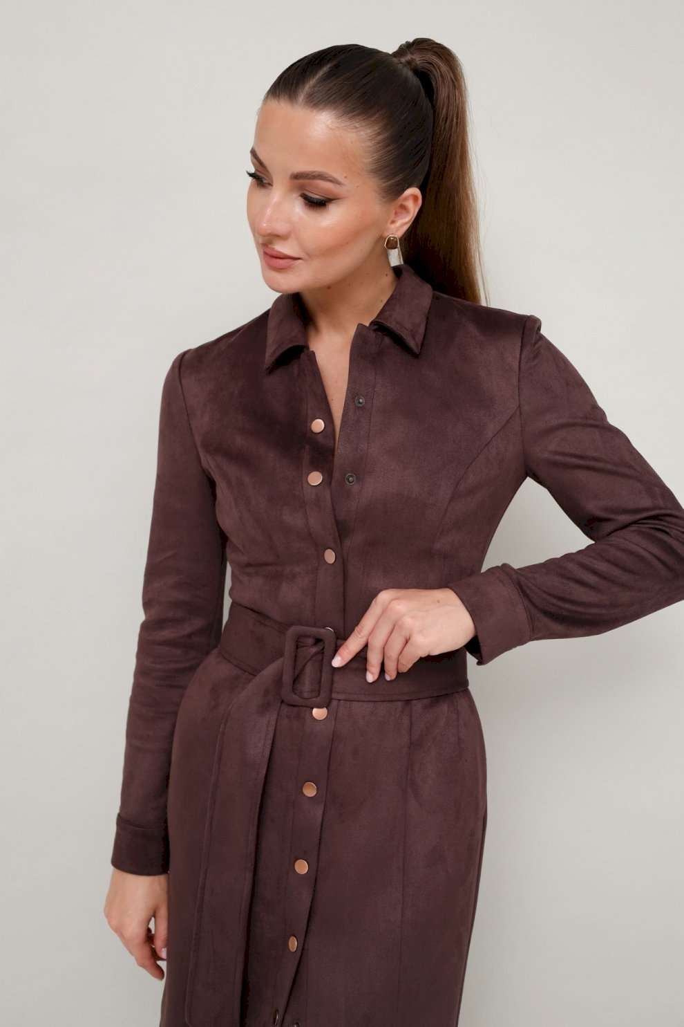 Силуэтное платье в длине миди, выполнено из экозамши. Отложной воротник с цельнокроеной стойкой. Центральная застёжка на кнопки. Перед с рельефными швами. Втачные двухшовные рукава с манжетами с застежкой на кнопки. Спинка со средним швом. В комплекте прилагается пояс из основной ткани с пряжкой.