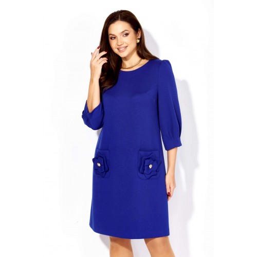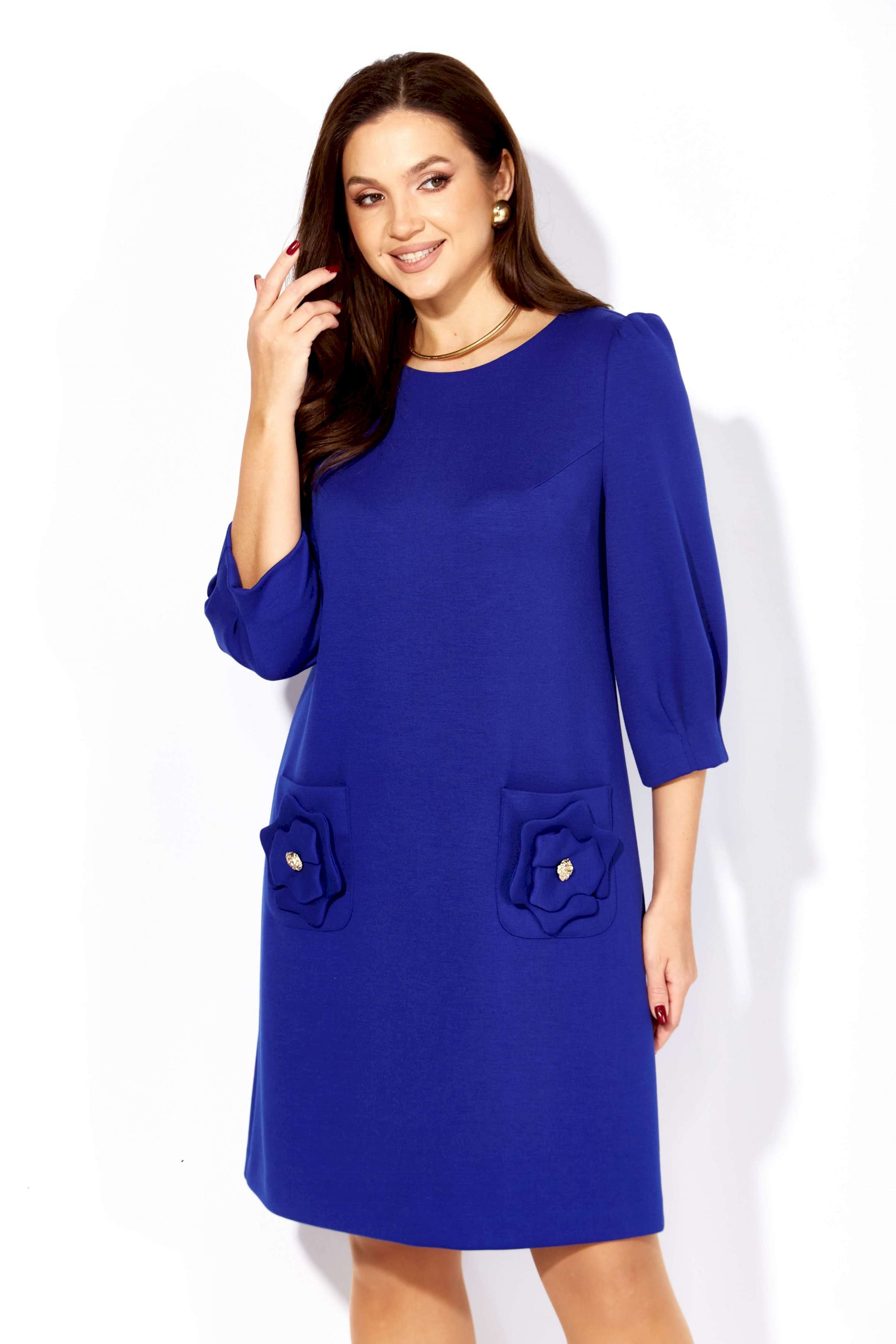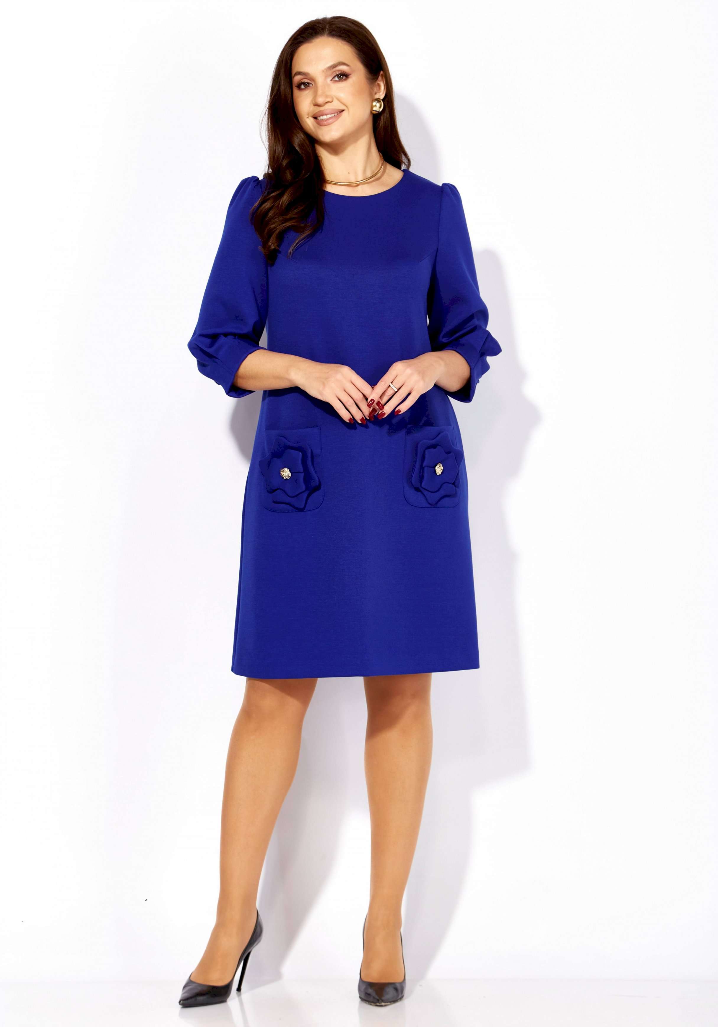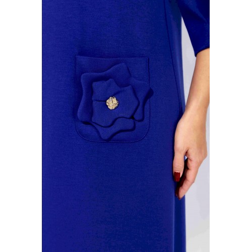 Платье женское, А силуэта, с рукавом длинной 3/4. Рукав втачной, со сборкой по окату, и мягкими складками по низу. По переду нагрудные вытачки. Вырез горловины круглой формы. Карманы накладные, акцентированы стилизированным цветком с декором. По спинке средний шов с отделочной нашивкой сверху.