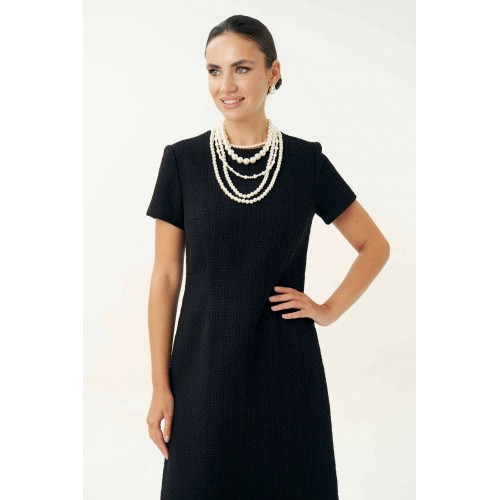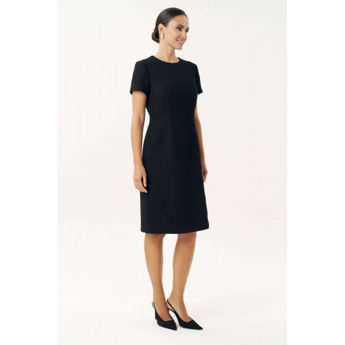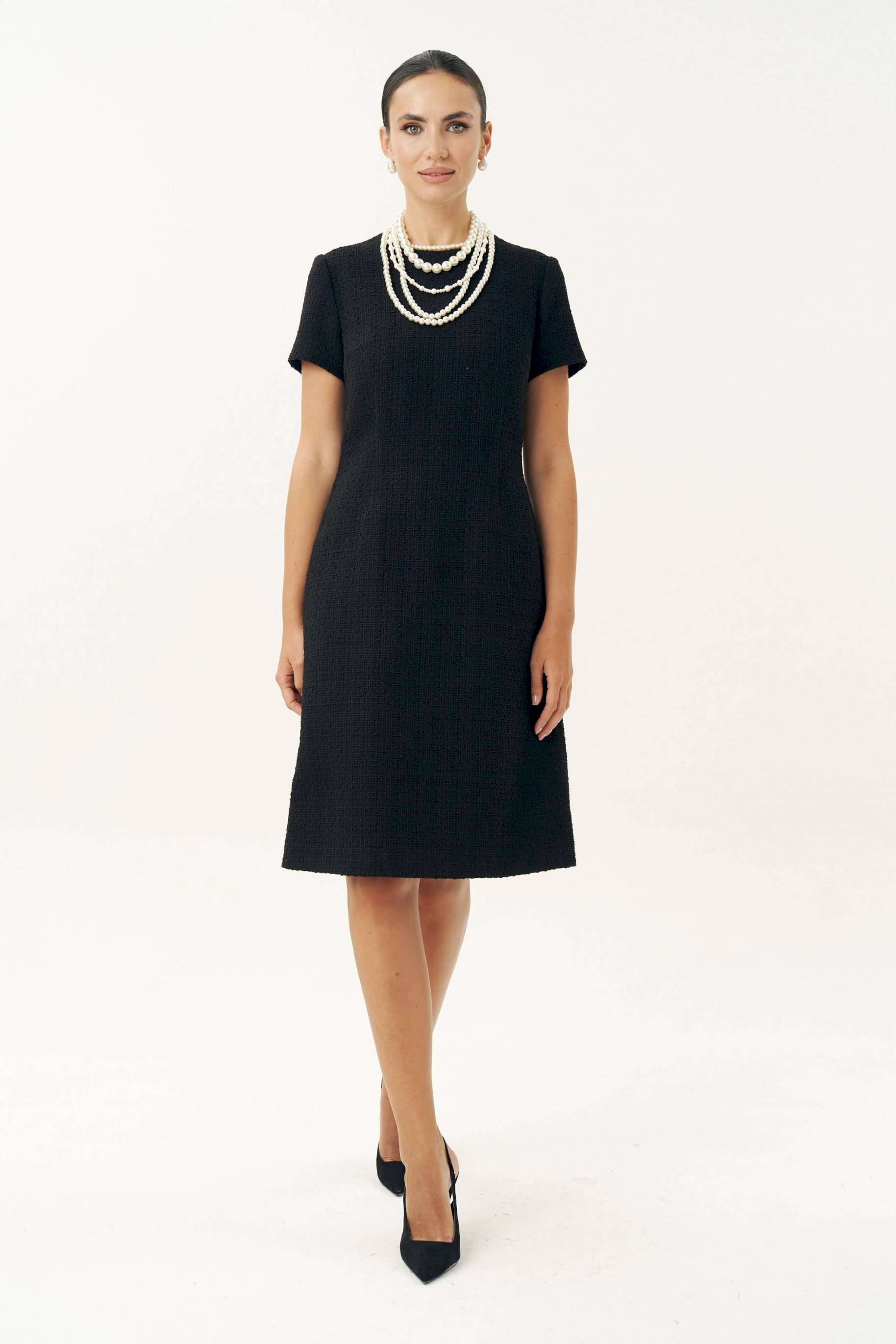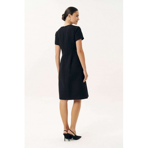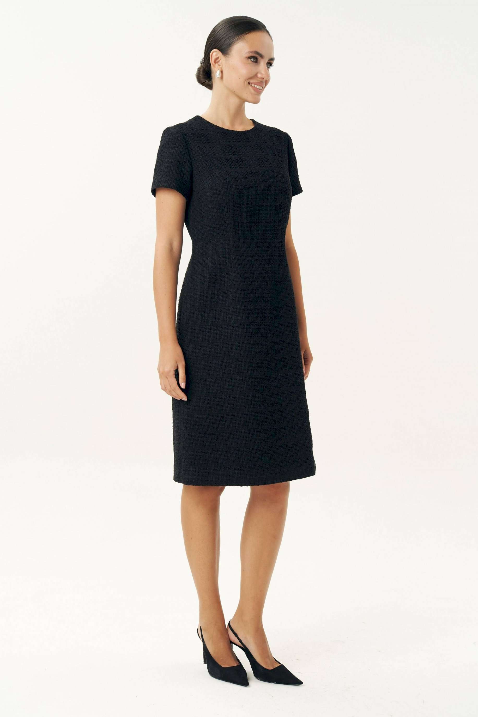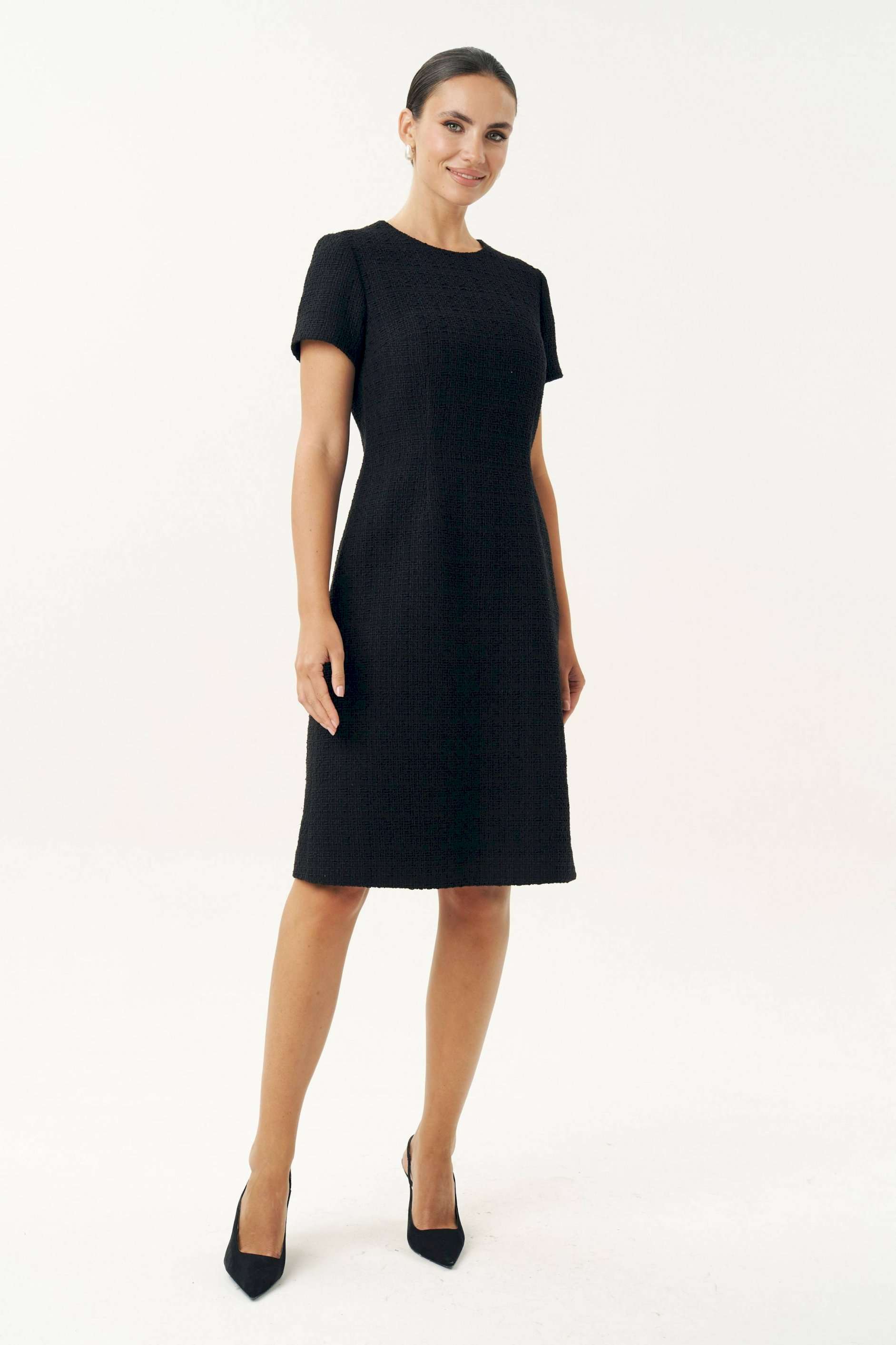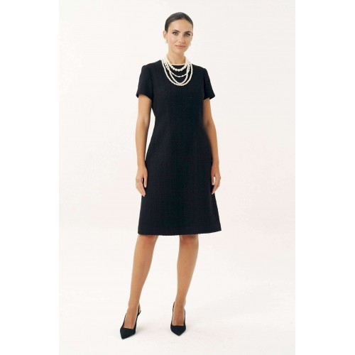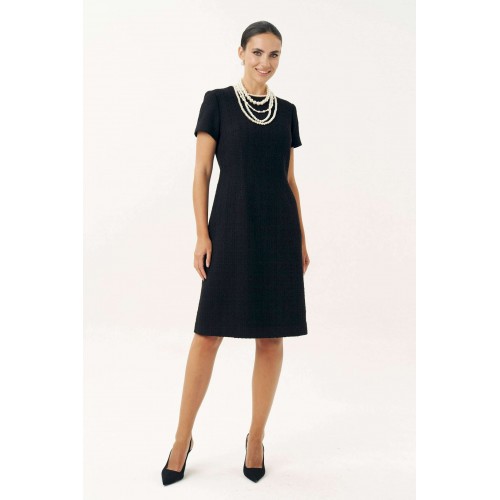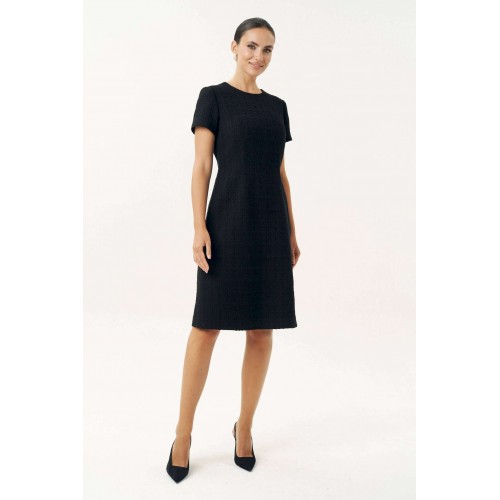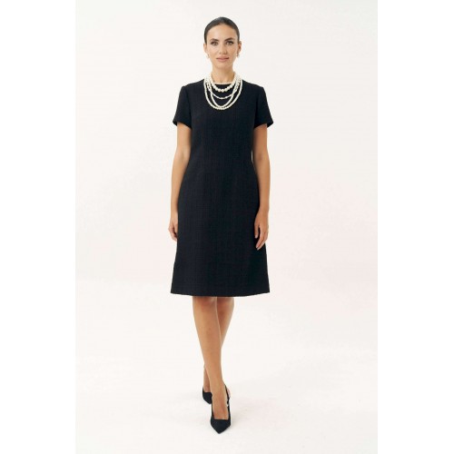 Неизменно, черное маленькое платье остается образцом элегантности… Платье женское, выполнено из костюмной твидовой ткани, полуприлегающего силуэта, расширенное к низу, на трикотажной подкладке притачной по низу переда и спинке, по низам рукавов. Платье повседневное. Перед с талиевыми вытачками, с нагрудными вытачками, идущими от боковых швов. Спинка с талиевыми вытачками, со средним швом, в верхней части которого обработана застежка на потайную тесьму-молнию. Рукава втачные, одношовные, короткие. Горловина переда и спинки обтачная, округлая. Средняя длина платья по среднему шву спинки - 102,0 см (±3,0 см). Средняя длина рукава платья - 19,0 см (±2,0 см).