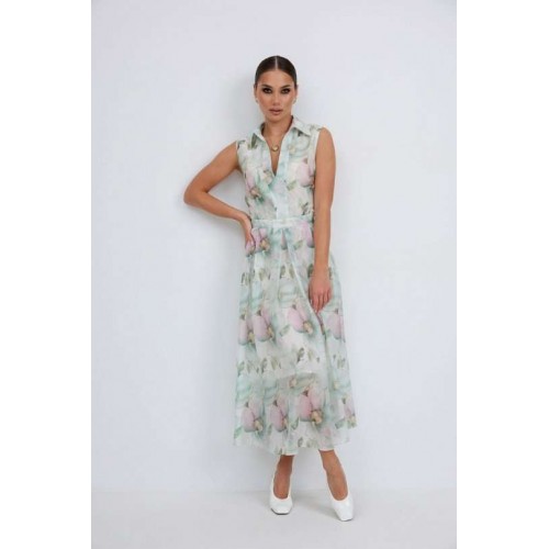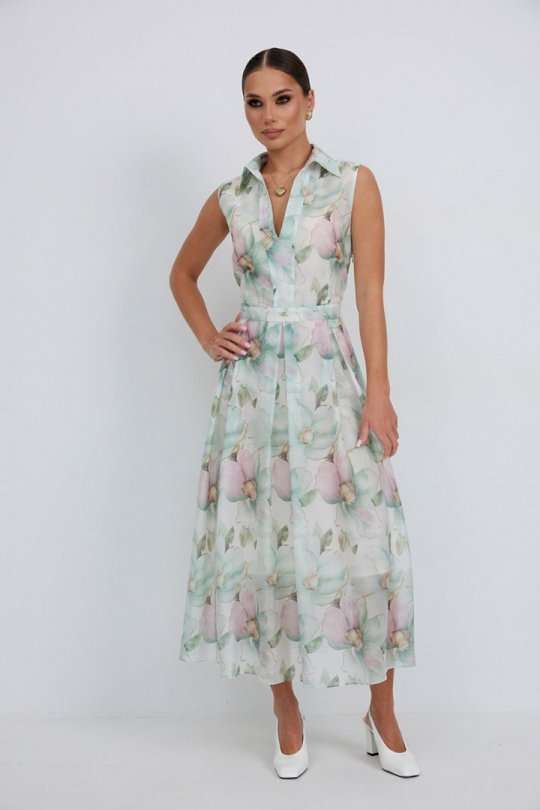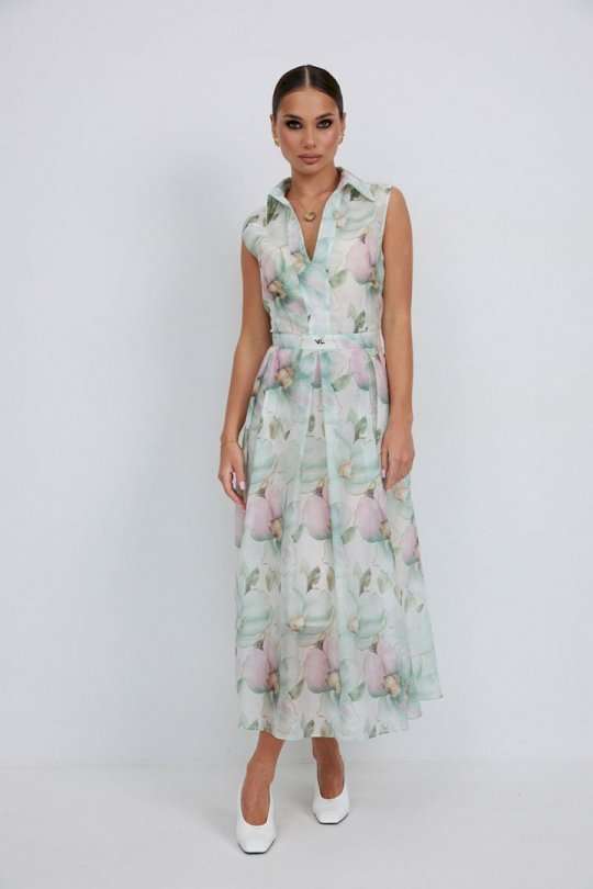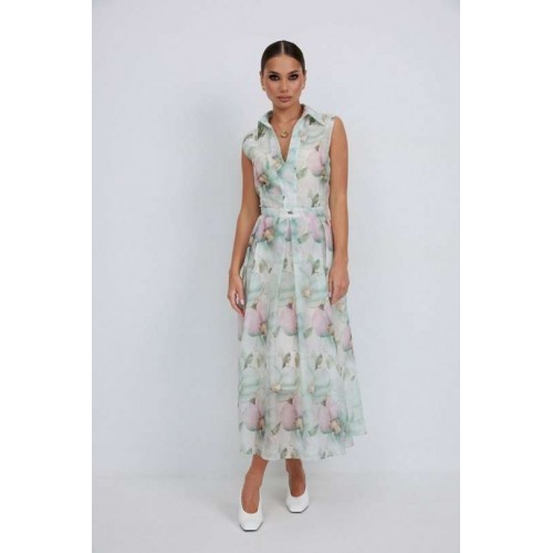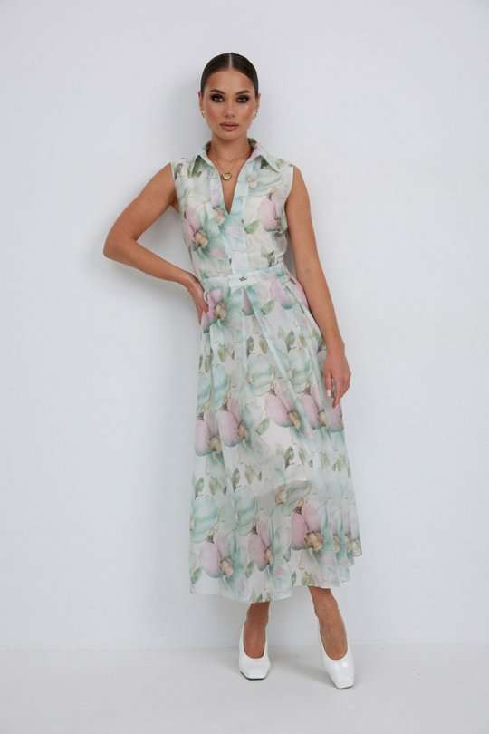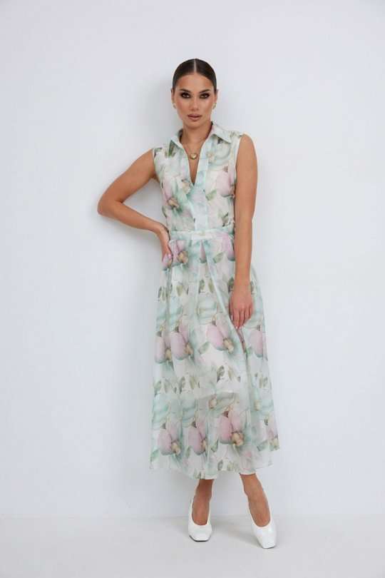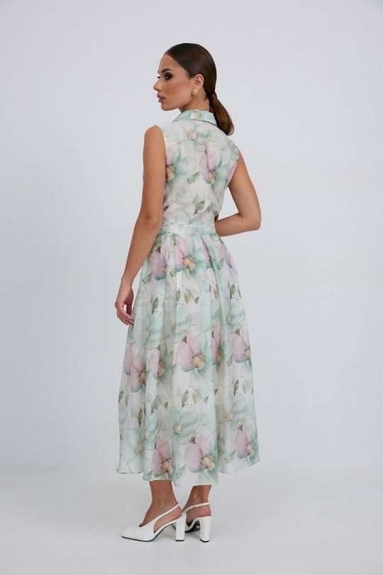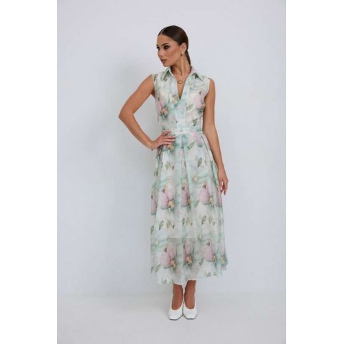 Платье из полупрозрачной ткани с принтом полуприлегающего силуэта длины «миди» расширенное к низу. По талии вставлен пояс, нижняя часть платья со встречными складками. Застежка-молния в боковом шве. По переду планка с вырезом. Воротник на стойке. Платье на подкладке. 44 р-р: ОГ - 92 см., ОТ - 80 см., ОБ - 104 см. 46 р-р: ОГ - 96 см., ОТ - 84 см., ОБ - 108 см. 48 р-р: ОГ - 100 см., ОТ - 88 см., ОБ - 112 см. 50 р-р: ОГ - 104 см., ОТ - 92 см., ОБ - 116 см. 52 р-р: ОГ - 106 см., ОТ - 96 см., ОБ - 120 см.