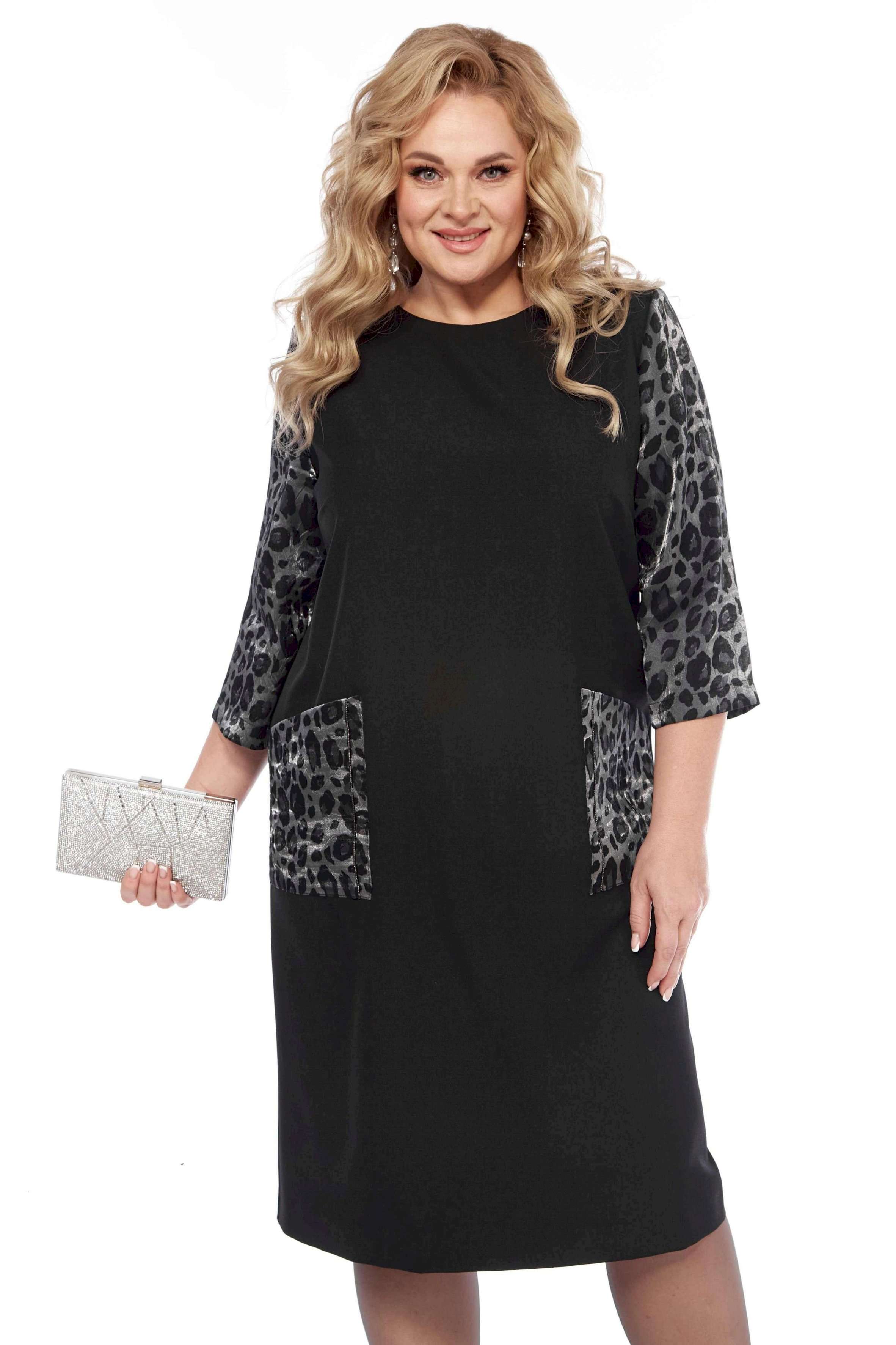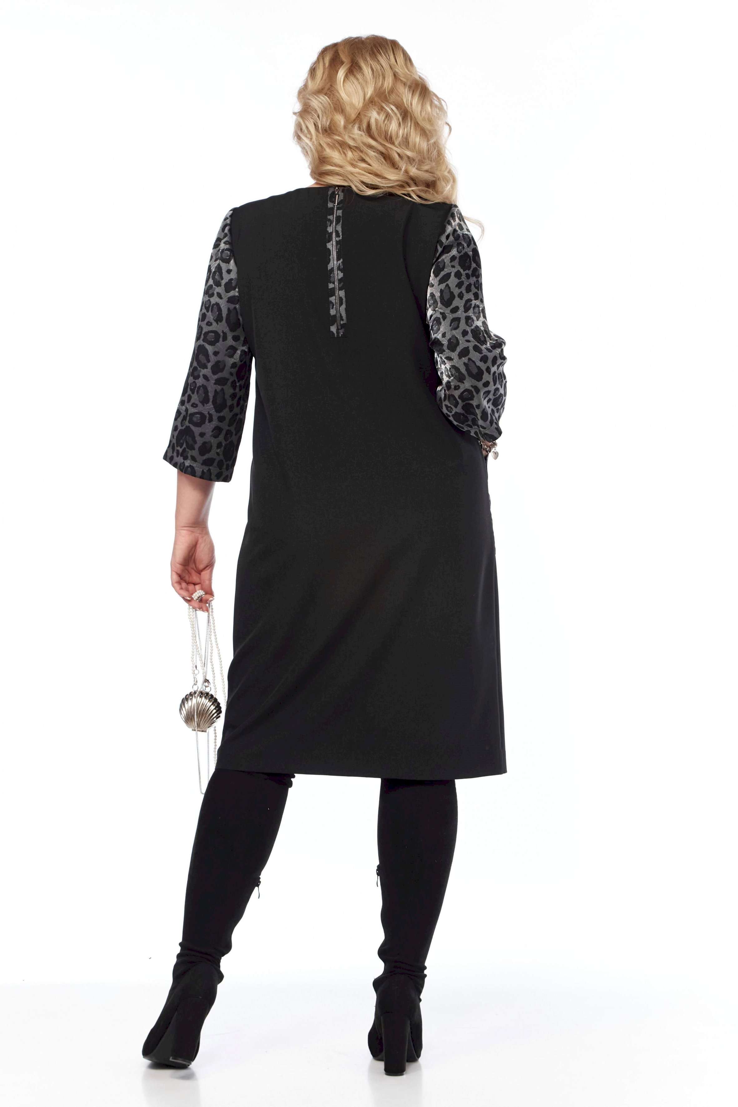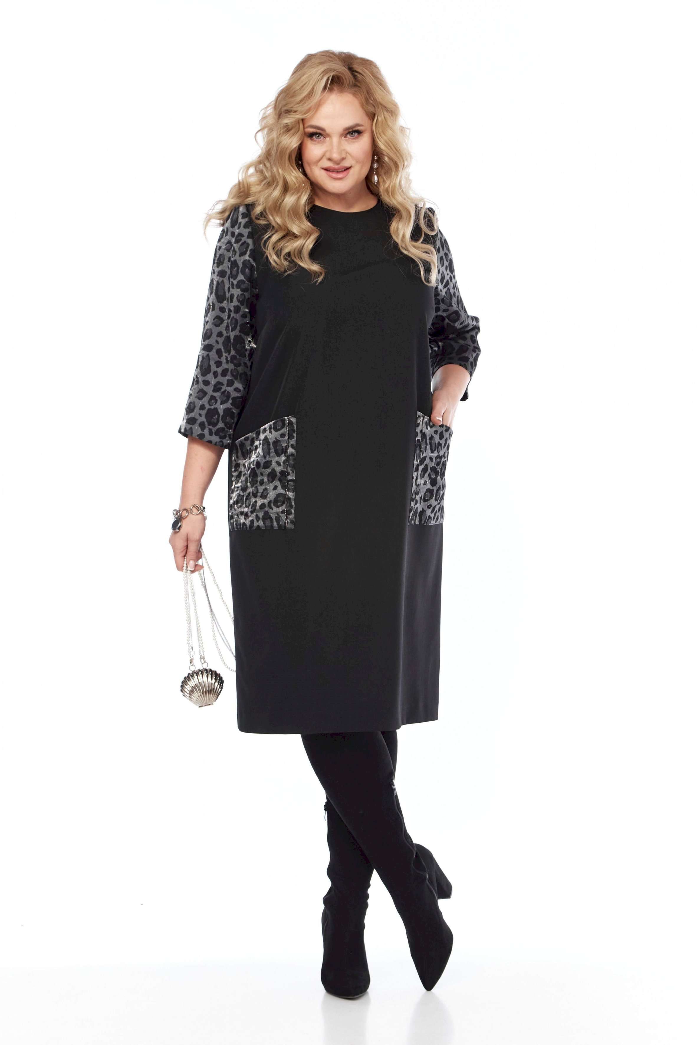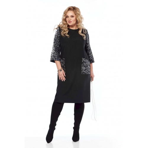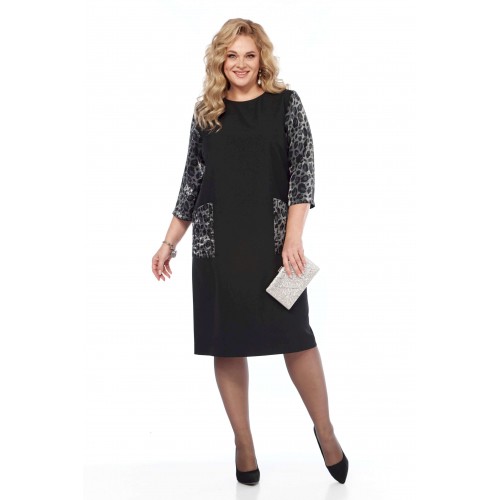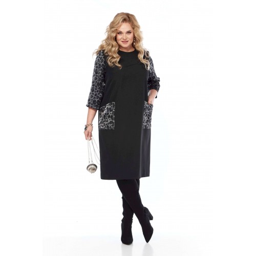 Платье женское прямого силуэта, скомбинированное из двух видов ткани. Перед с нагрудными вытачками, выходящими из боковых швов и фигурными накладными карманами с отделочным кантом. Спинка цельная с молнией, по горловине с отделкой. Рукав втачной, одношовный, прямой, длиной 3/4. Горловина овальной формы. Длина платья по спинке - 102 см. Длина рукава - 46 см.